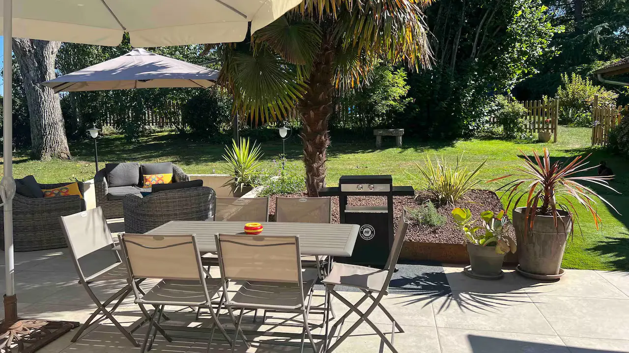 Die Unterkunft verfügt über einen eigenen Eingang mit geschlossenem Tor sowie Parkmöglichkeiten für bis zu drei Autos. Das Haus bietet eine große Terrasse mit Gartenmöbeln, Gartentisch, Plancha und Weber-Grill.