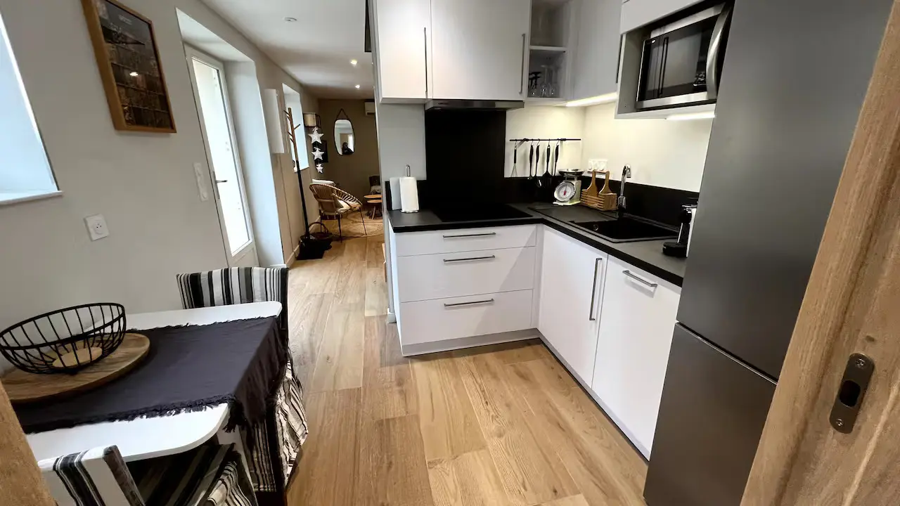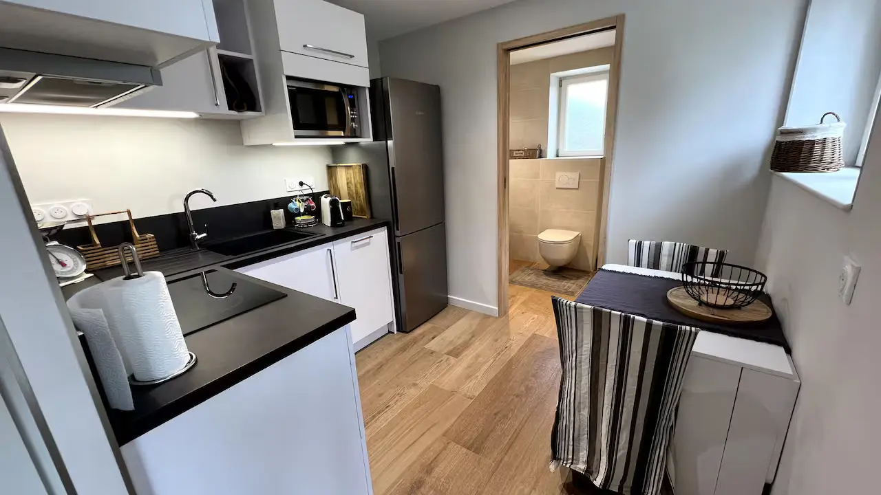 Im Erdgeschoss befindet sich eine voll ausgestattete Küche mit Kühl-Gefrierkombination, Geschirrspüler, Kombi-Backofen mit Mikrowelle, Induktionskochfeld mit Dunstabzug, Nespresso-Kaffeemaschine (Kapseln werden bei der Ankunft bereitgestellt) sowie einer klassischen Kaffeemaschine (gemahlener Kaffee bei Ankunft vorhanden), Toaster und Wasserkocher.
