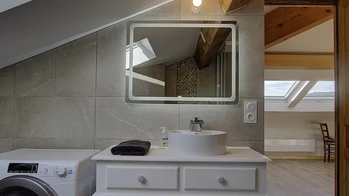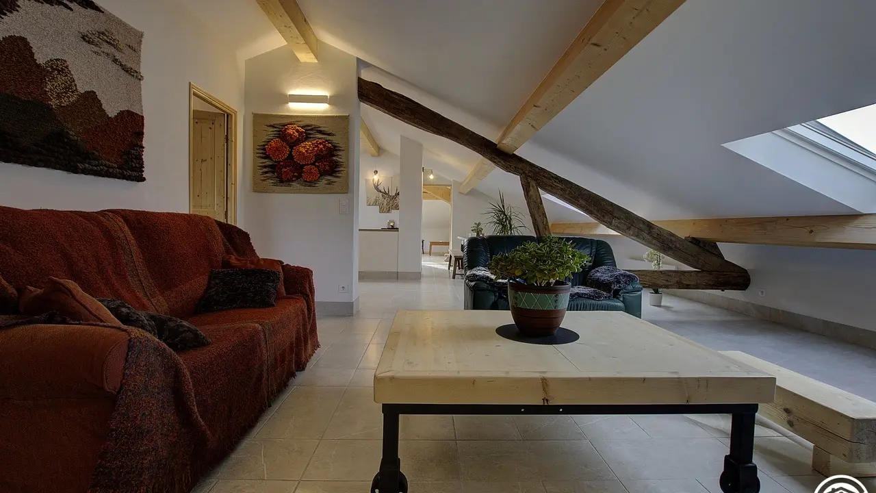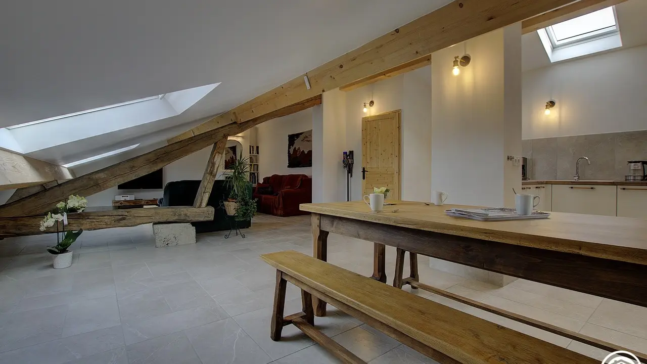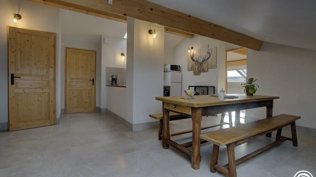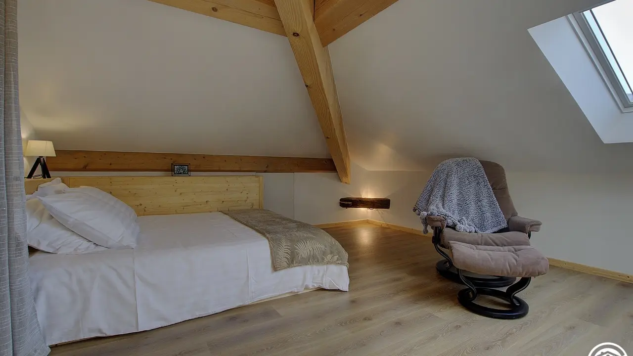 Es bietet mit seinen zwei Schlafzimmern und zwei Sanitäranlagen Platz für bis zu 6 Personen. Durch einen gemeinsamen Eingang gelangen Sie in den 2. Stock dieses schönen Hauses, dann geht der Eingang direkt in diesen großen Wohnraum, der aus einer Einbauküche besteht und sich zum Essbereich hin öffnet, gefolgt in der Verlängerung von einem Entspannungsbereich mit einem elektrischen Led-Kamin mit sehr realistischem Holzfeuereffekt. Sie werden vom Dachstuhl und der Helligkeit dank der großen Veluxfenster mit Solarläden, die Ihnen einen Panoramablick auf das Tal bieten, verzaubert sein. Sie verfügen über zwei unabhängige Schlafzimmer: ein sehr großes Zimmer (30 m²) mit zwei Doppelbetten (160*200 cm) und der Möglichkeit, dank der Dekoration seine Privatsphäre zu wahren. Das Plus dieses Zimmers: ein eigenes Badezimmer (mit WC und Dachfenster). Das zweite Schlafzimmer (2 Einzelbetten 90*190) führt Sie in diesen schönen Wald, wo Sie sich in einem sanften Licht wiegen können. Ein zweites Badezimmer ist vom Wohnzimmer aus zugänglich und besteht aus einer Dusche und einem WC. Die Heizung ist elektrisch. Bei Ihrer Ankunft werden Sie es zu schätzen wissen, dass die Betten gemacht, die Handtücher bereitgestellt und die Nebenkosten inbegriffen sind. Im selben Gebäude befinden sich zwei Ferienhäuser für 5 und 3 Personen, in denen Sie mit Ihrer Familie oder Ihren Freunden zusammenkommen können. Wenn Sie zusammen mieten, steht Ihnen ein großer Obstgarten zur Verfügung, in dem Sie sich in einer ländlichen Umgebung treffen können. Entdecken Sie Samognat mit seinem See, seinen Bergen, seinem Wald und den Wanderwegen, die an der Unterkunft beginnen. Ein idealer Ort für zahlreiche Mountainbike- und Wandertouren, bis zu den Sprüngen von Charmine oder den Schluchten des Val d'Enfer. Das Anwesen überragt ein grünes Tal, durch das sich der Bach Anconnans und der Fluss Oignin schlängeln.