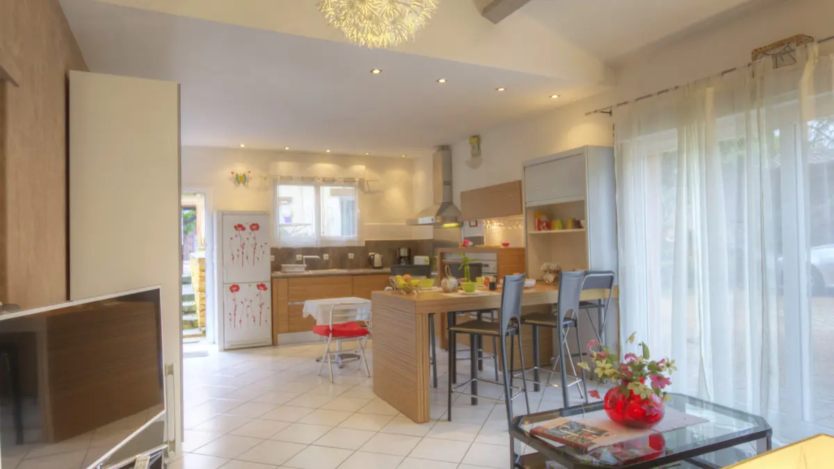 Dieses klimatisierte und ebenerdige Ferienhaus umfasst eine amerikanische Küche, die sich zu einem Wohnzimmer mit Schlafsofa (2 Personen) öffnet, ein Schlafzimmer (1 Doppelbett und 1 Einzelbett), ein Badezimmer mit Whirlpool, Dusche, WC, Waschmaschine und Wäschetrockner. Eigene Terrasse an der Unterkunft. Die Strohhütte und der Bouleplatz der Eigentümer stehen Ihnen zur Verfügung. Eingezäuntes Grundstück und Parkplatz auf dem Grundstück.