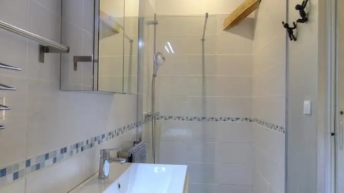 Erdgeschoss: große offene Küche, ein Schlafzimmer (140 x 190 cm) mit Duschbad und WC, ein Flur, ein Hauptschlafzimmer (160 x 200 cm) mit Ankleidezimmer und eigenem Duschbad mit Badewanne. Separates WC.