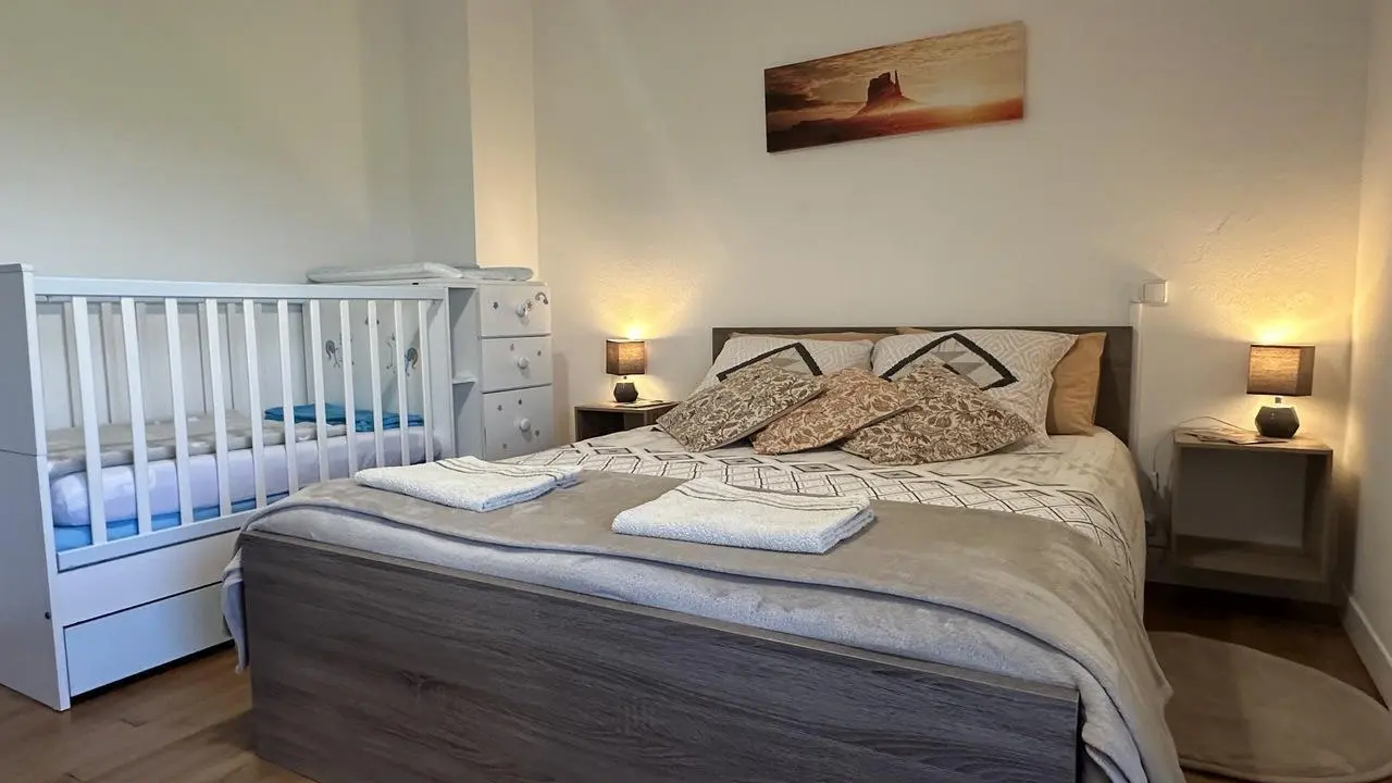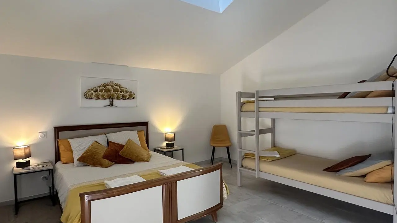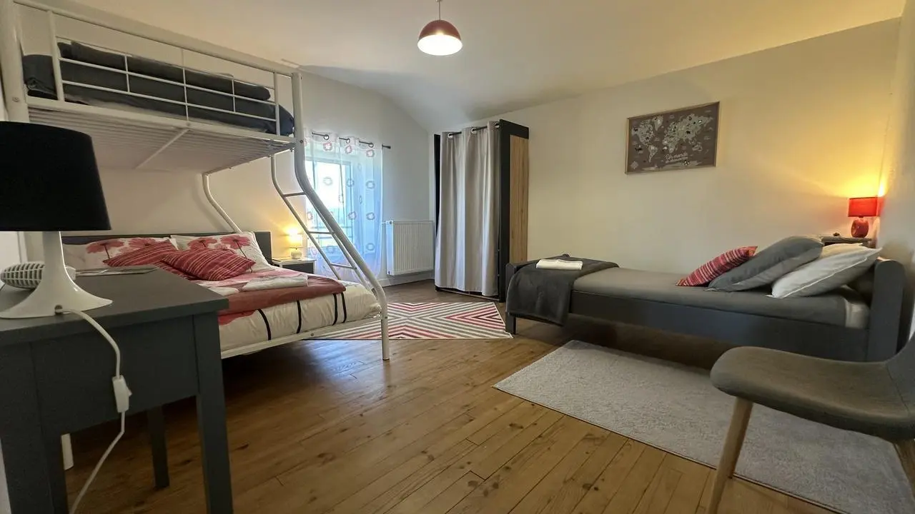 Im Erdgeschoss befindet sich eine ausgestattete Küche, die zum Wohnzimmer und seiner Sitzecke hin offen ist, eine kleine Waschküche, ein Schlafzimmer (1 Bett 140*190) mit seinem Badezimmer-WC, das dem Schlafzimmer zugeordnet ist; ein separates WC mit Handwaschbecken. Im Obergeschoss über eine schöne Holztreppe haben Sie die Wahl zwischen drei Schlafzimmern: ein Zimmer für zwei Personen mit einem Bett 140 und einem Kinderbett; ein Zimmer für drei Personen mit einem separaten Bett 90 und einem Bett 140 und einem Bett 90 als Etagenbett und ein drittes Zimmer mit einem Bett 140 und zwei Etagenbetten als Einzelbetten (90); ein großes, helles Badezimmer und ein separates WC mit Handwaschbecken. Heizung Wärmepumpe. Das Plus dieses Ferienhauses: Alles ist inbegriffen - die Betten sind bei Ankunft bezogen, Handtücher und Heizungen sind inbegriffen. Die nicht einsehbare Terrasse und der oberirdische Pool (Saison 2020) werden Groß und Klein begeistern. Die Unterkunft ist ideal gelegen: 3 km von Bourg en Bresse und all seinen Annehmlichkeiten, dem königlichen Kloster von Brou und seinen architektonischen Schätzen entfernt.