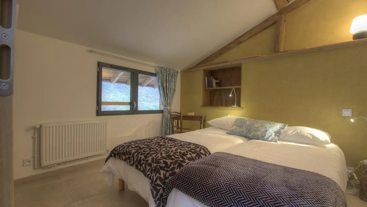 Über eine schöne Handwerkertreppe aus Esche und Olivenholz gelangt man ins Obergeschoss, wo sich ein Balkon (für die Abendsonne), das Badezimmer (große Dusche und Doppelwaschbecken), die sehr helle Galerie (Schlafsofa 140 cm oder 2x70 cm), zwei Schlafzimmer mit sichtbaren Holzbalken und schlichter Dekoration (zwei Einzelbetten 80 cm), eines mit Blick auf den Garten und die Berge, das andere mit Blick auf den Hof, befinden. Alle drei Räume sind mit einem kleinen, antiken Schreibtisch ausgestattet.