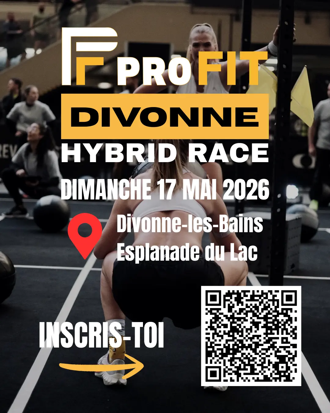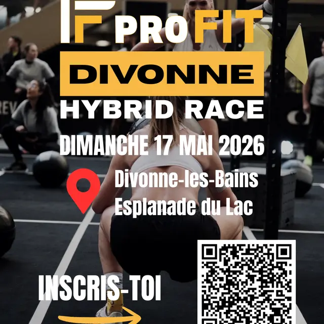 Das Profit Divonne Hybrid Race ist ein Hybridlauf vom Typ "Hyrox", der 7 km Laufen umfasst, die in 1 km aufgeteilt sind, mit Übungsstationen zwischen jedem Kilometer (insgesamt 7 Stationen).