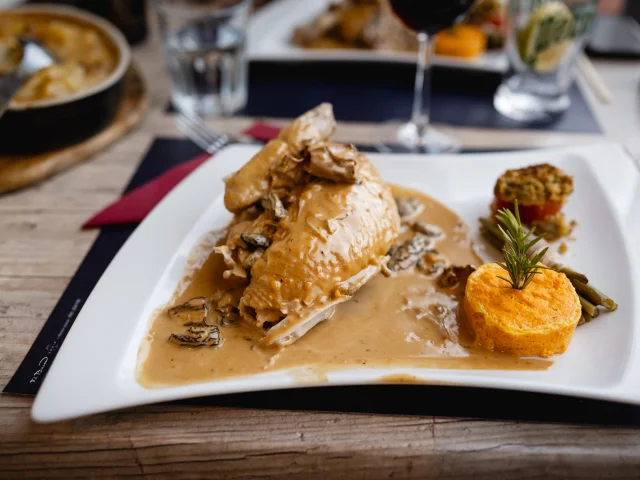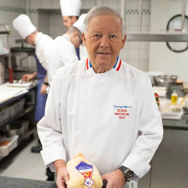 Das Bresse-Geflügel kommt majestätisch auf den Tisch der Sterneköche des Guide Michelin. Dort wird es idealerweise von einem Wein aus der AOC Bugey, einem im Eichenfass gereiften Pinot Noir oder einem Mondeuse aus einem sonnigen Jahrgang, begleitet.
