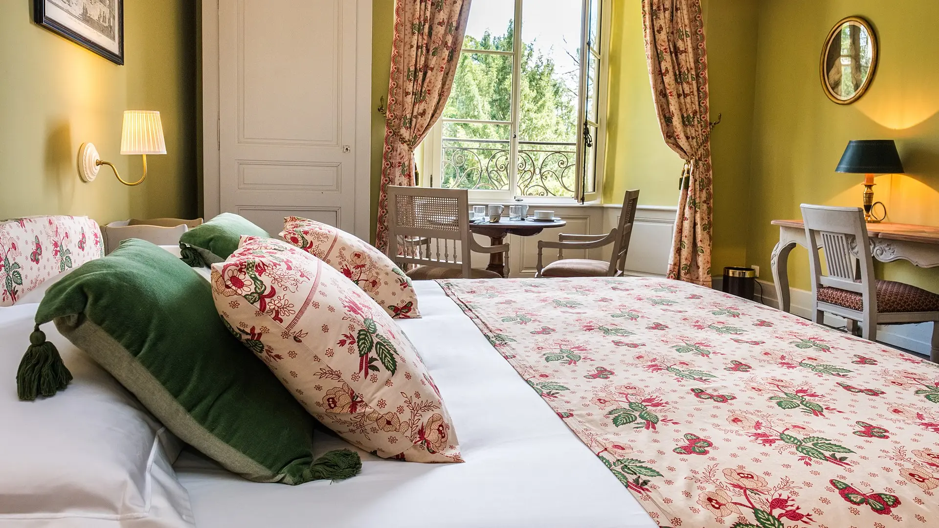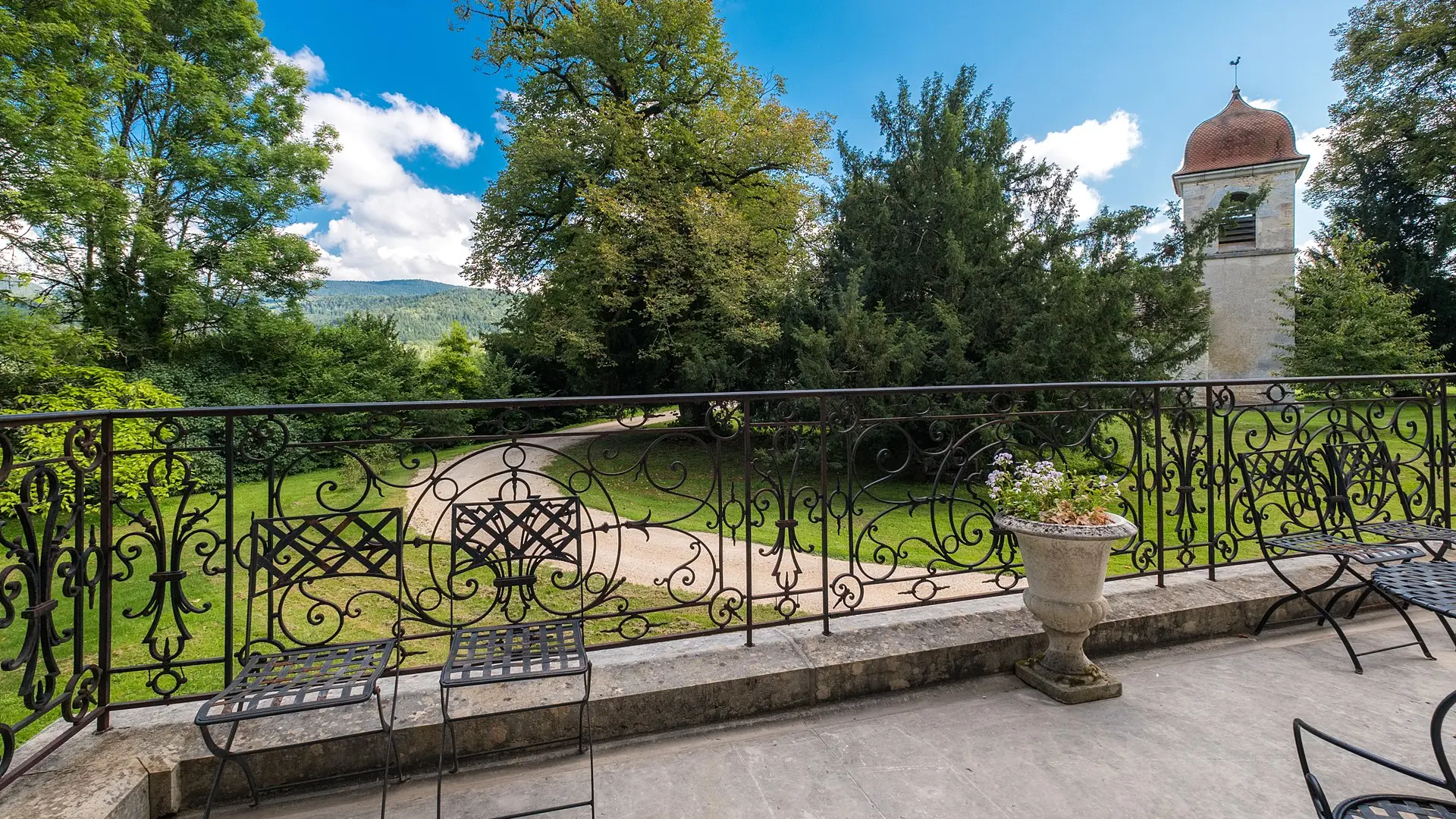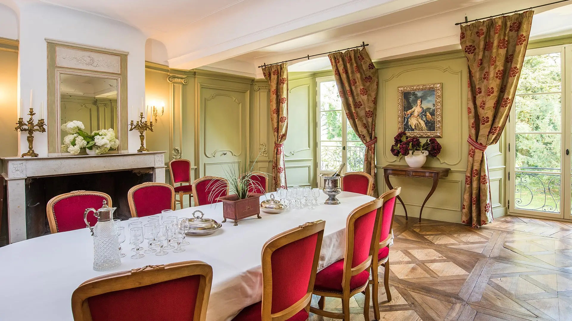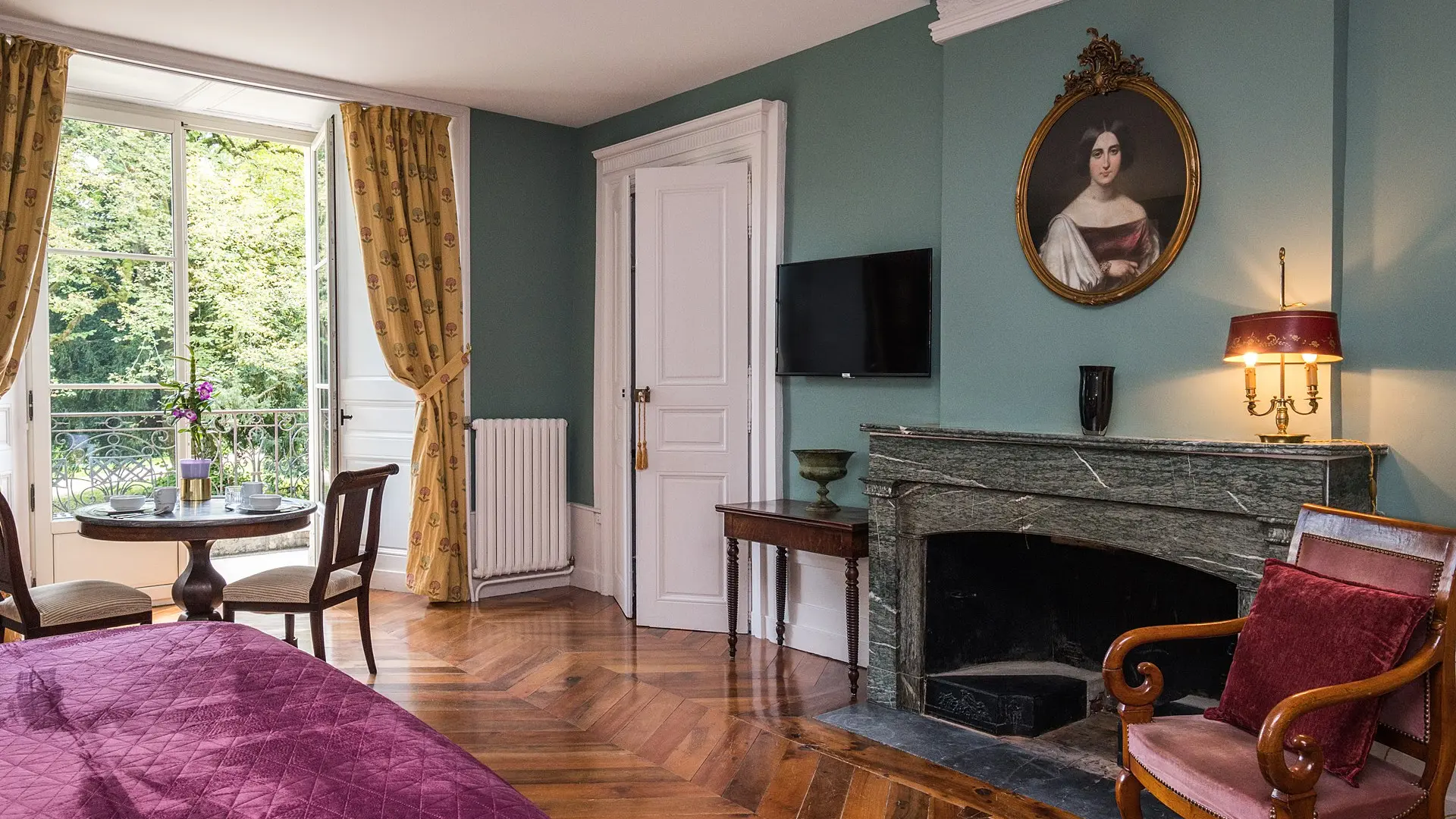 Period furniture, parquet floors, fireplaces, a communal lounge with Louis XV wood panelling opening onto a terrace overlooking the mountains and the park with its two-hundred-year-old trees.