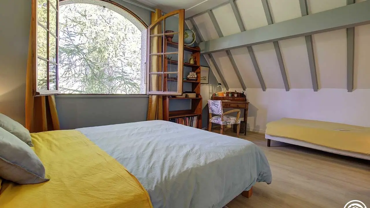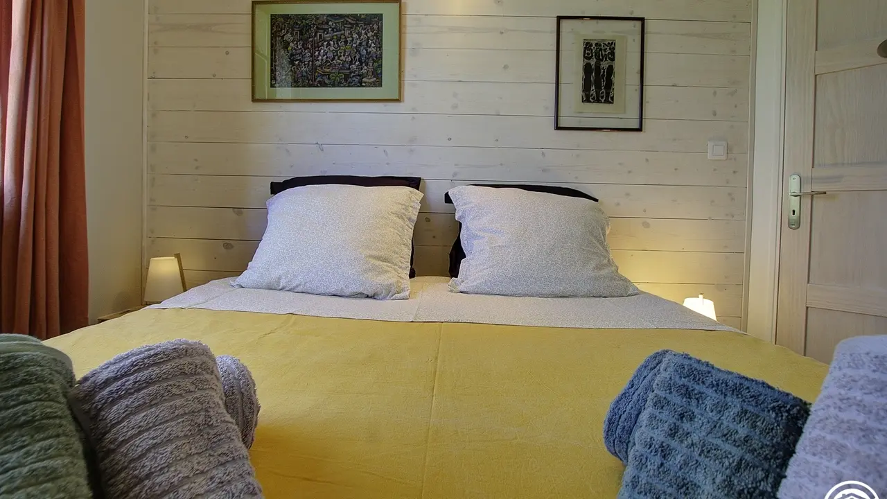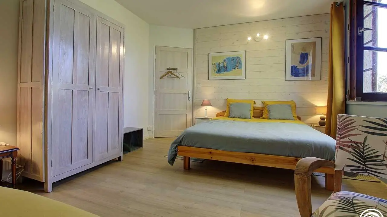 4 km from the center of Belley, Pascal and Brigitte, open the doors of their Bugiste house and offer you two bedrooms located upstairs. From the hall, you access the bedrooms by a wooden staircase, which leads to a first bedroom for 3 people with a 160*200 bed and a 90*190 bed. The second bedroom, adjoining the first, has a 160*200 double bed. The two bedrooms are each equipped with a bathroom (with WC), private to the bedroom but not adjoining (toilets in the hallway). Bathrobes are available for added comfort. This floor includes the two guest bedrooms, as well as a private space for the owners (office and a bedroom reserved for the family).
