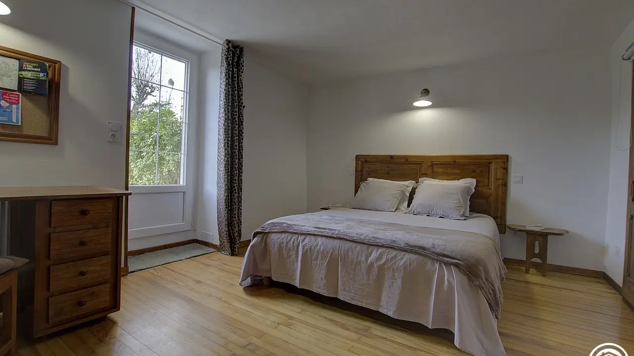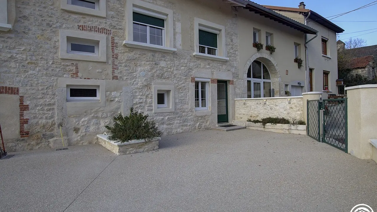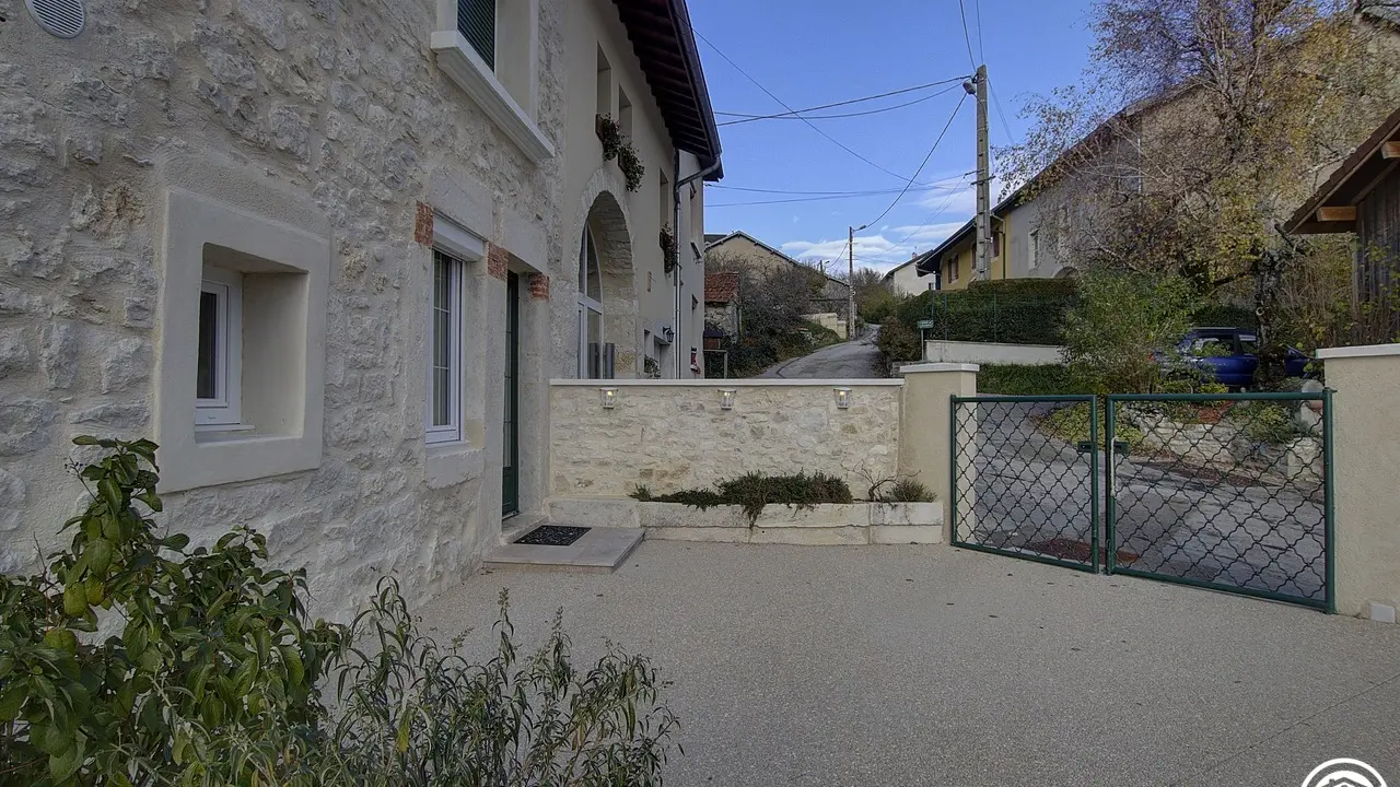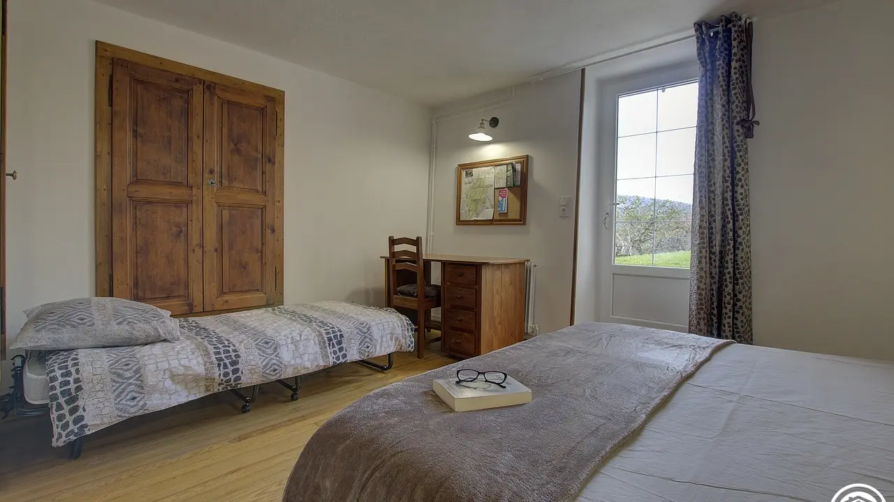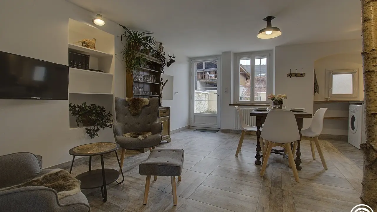 Chez le Tourneur gîte (41 sq.m.), fully renovated in 2019, in lower part of village of Samognat. Accommodation for up to 3 people. Cosy décor, lots of exposed wood and metal. Secure upper courtyard leading to entrance, living room with open-plan fitted kitchen and lounge area (fireplace). Bedroom with parquet floor (teak desk, queen-size bed, folding single bed) has direct access to flagstone terrace (open view of orchard). Shower room/WC. Adjoins a second gîte (for 5 people) which can be rented at same time for getting together with family or friends. Large orchard open to occupants of gîte(s).|Property overlooks leafy valley through which flow a stream (L'Anconnans) and a river (L'Oignin). Bonus features of Chez le Tourneur gîte: beds made on arrival, towels provided, charges included in rent. Whether just 2 or a group of 8 people, come and explore Samognat with its lake, mountains, forest, footpaths on the doorstep. Ideally located for hiking and mountain biking as far as the Sauts