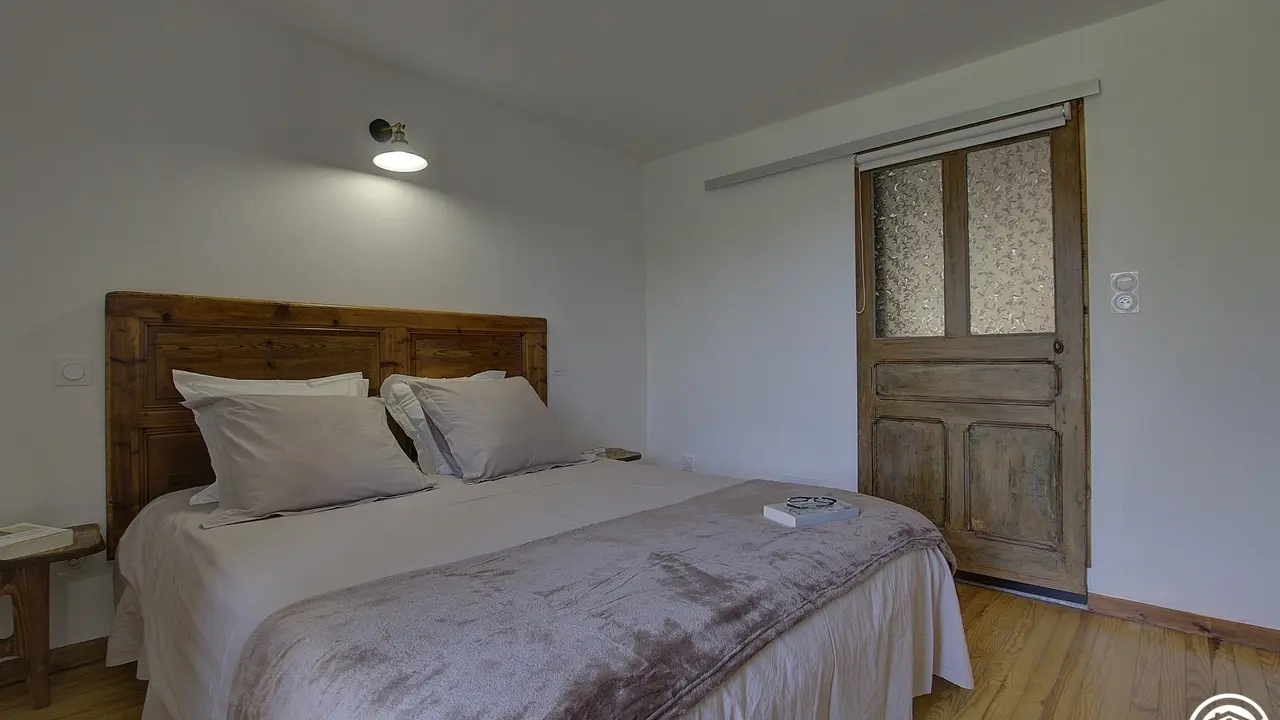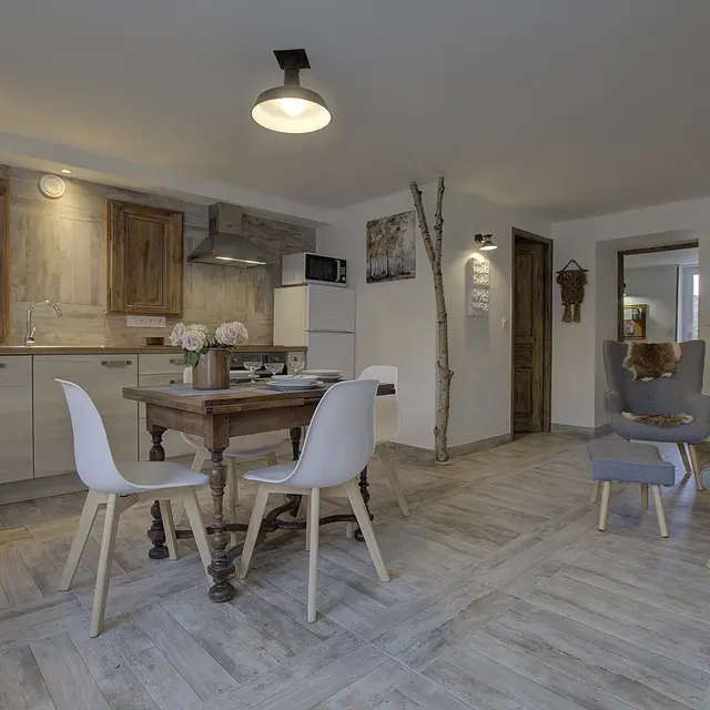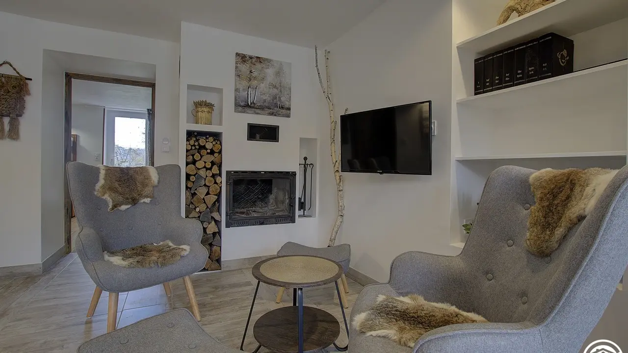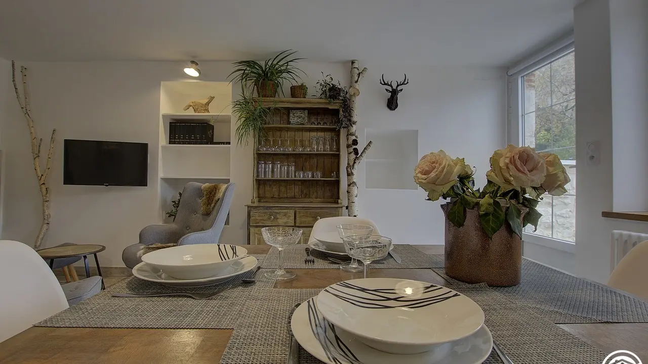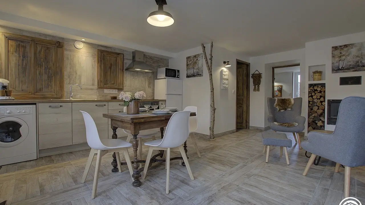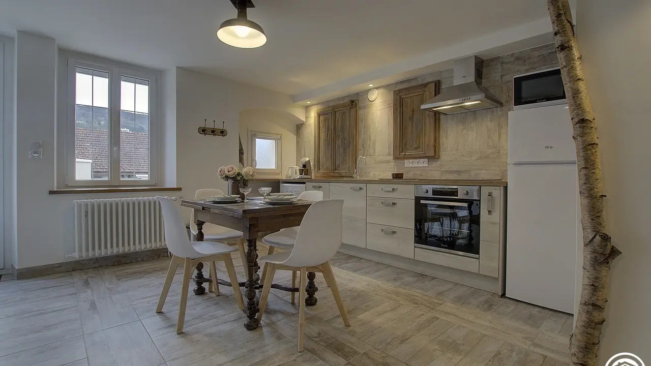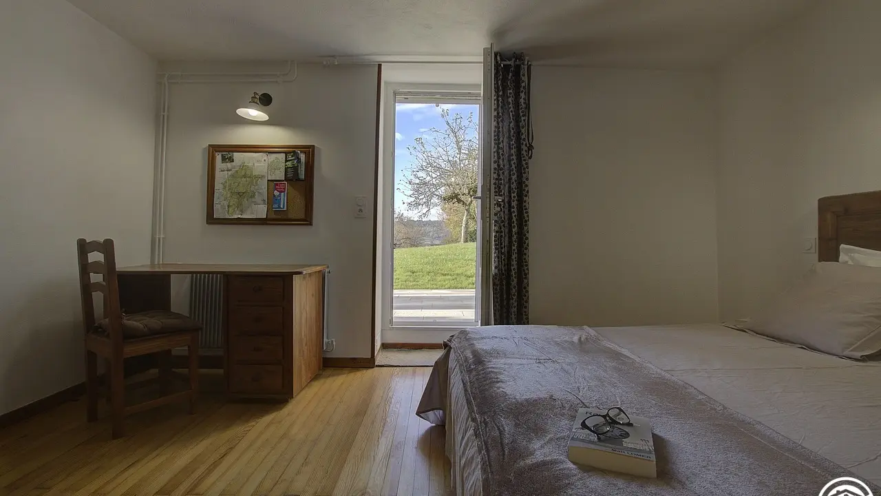 Chez le Tourneur gîte (41 sq.m.), fully renovated in 2019, in lower part of village of Samognat. Accommodation for up to 3 people. Cosy décor, lots of exposed wood and metal. Secure upper courtyard leading to entrance, living room with open-plan fitted kitchen and lounge area (fireplace). Bedroom with parquet floor (teak desk, queen-size bed, folding single bed) has direct access to flagstone terrace (open view of orchard). Shower room/WC. Adjoins a second gîte (for 5 people) which can be rented at same time for getting together with family or friends. Large orchard open to occupants of gîte(s).|Property overlooks leafy valley through which flow a stream (L'Anconnans) and a river (L'Oignin). Bonus features of Chez le Tourneur gîte: beds made on arrival, towels provided, charges included in rent. Whether just 2 or a group of 8 people, come and explore Samognat with its lake, mountains, forest, footpaths on the doorstep. Ideally located for hiking and mountain biking as far as the Sauts