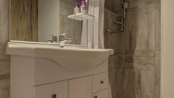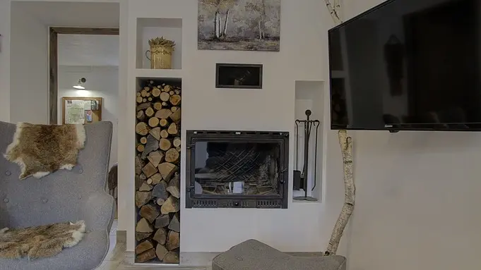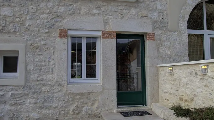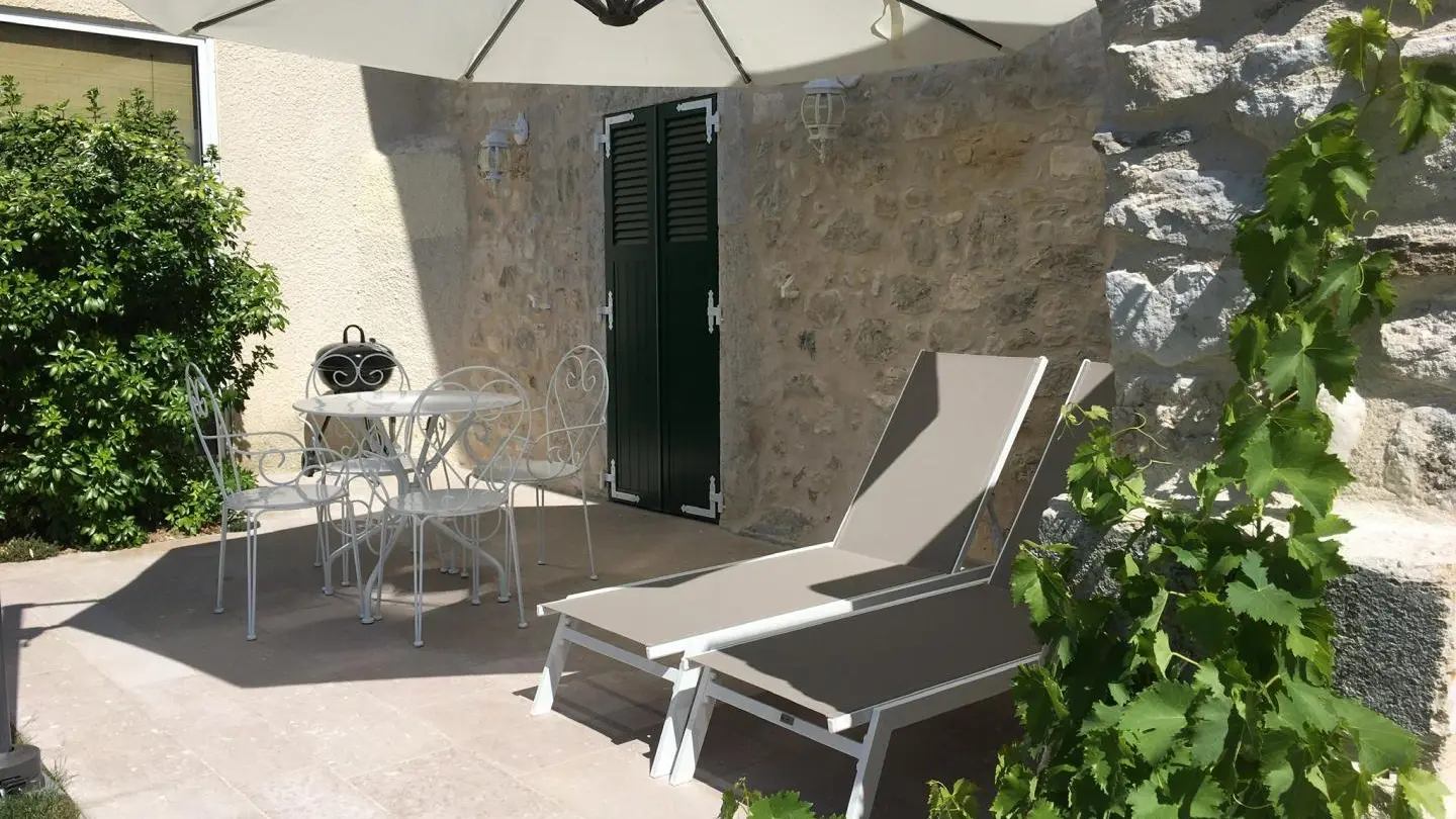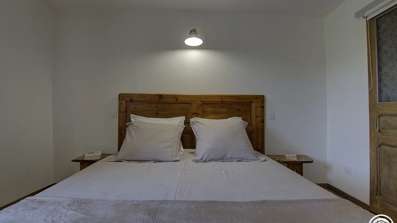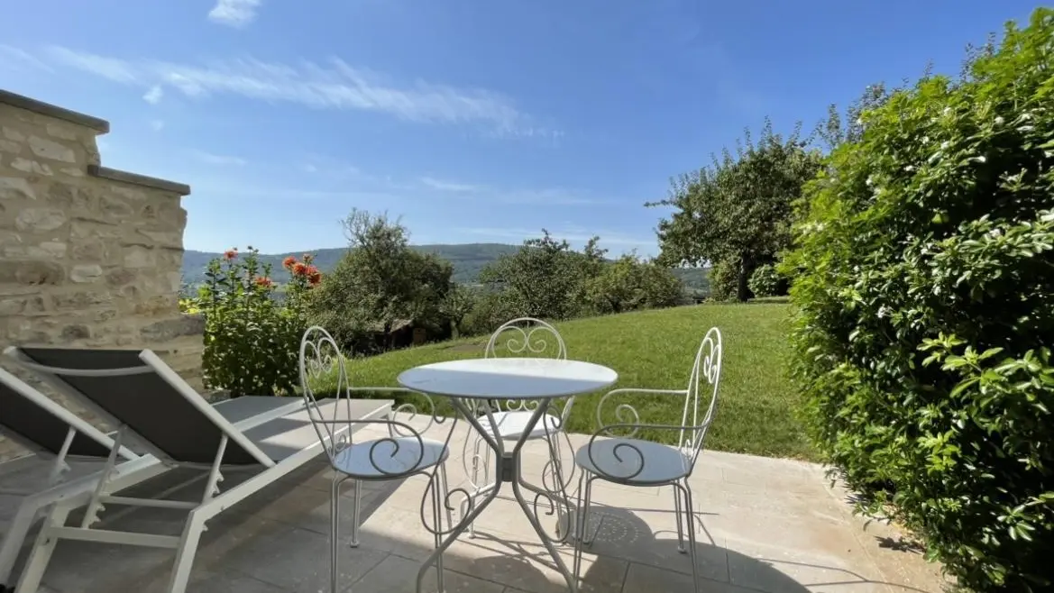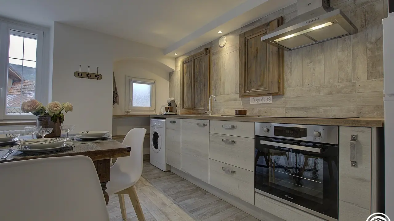 Chez le Tourneur gîte (41 sq.m.), fully renovated in 2019, in lower part of village of Samognat. Accommodation for up to 3 people. Cosy décor, lots of exposed wood and metal. Secure upper courtyard leading to entrance, living room with open-plan fitted kitchen and lounge area (fireplace). Bedroom with parquet floor (teak desk, queen-size bed, folding single bed) has direct access to flagstone terrace (open view of orchard). Shower room/WC. Adjoins a second gîte (for 5 people) which can be rented at same time for getting together with family or friends. Large orchard open to occupants of gîte(s).|Property overlooks leafy valley through which flow a stream (L'Anconnans) and a river (L'Oignin). Bonus features of Chez le Tourneur gîte: beds made on arrival, towels provided, charges included in rent. Whether just 2 or a group of 8 people, come and explore Samognat with its lake, mountains, forest, footpaths on the doorstep. Ideally located for hiking and mountain biking as far as the Sauts