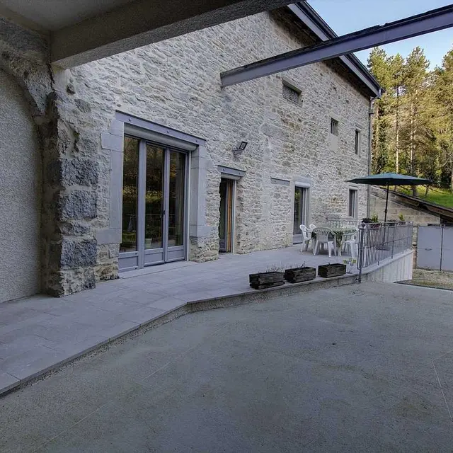 This former mill, now a forge, has been renovated by the owners. Direct access to kitchen and living room. Separate WC. 1 bedroom adapted for people with reduced mobility with 1 double bed (140cm), Italian-style shower room with integrated WC adjoining the bedroom. 1 bright bedroom with 1 double bed and 2 bunk beds. Italian-style shower room with WC. Terrace access (ramp). Washing machine. Courtyard, garden, terrace, enclosed grounds, not overlooked. Beautiful mountain views, very quiet. Close to a cool river. Underfloor heating with wood pellet boiler. Optional: cleaning charge €50 - sheets €10/bed, towels €4/person.