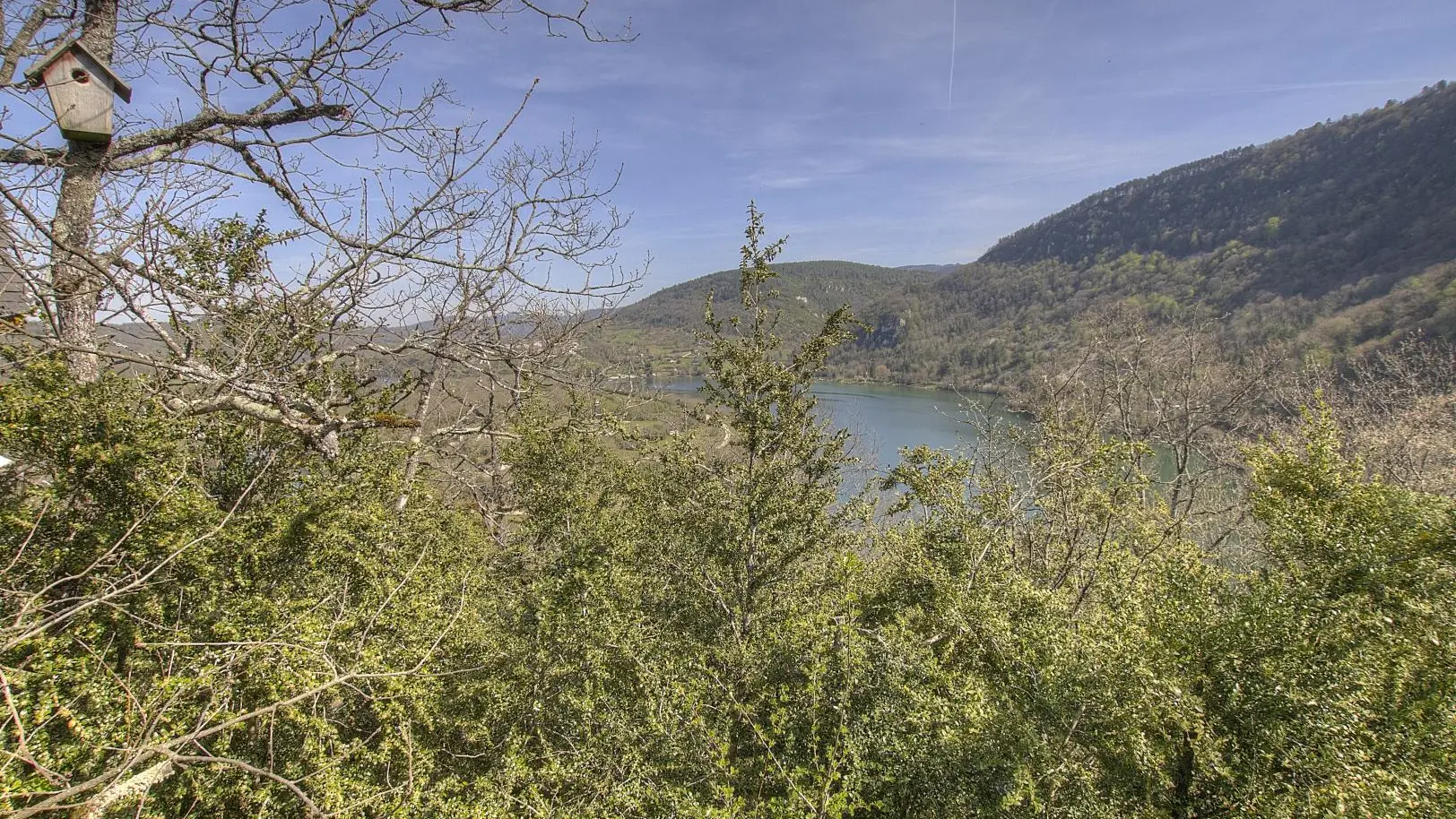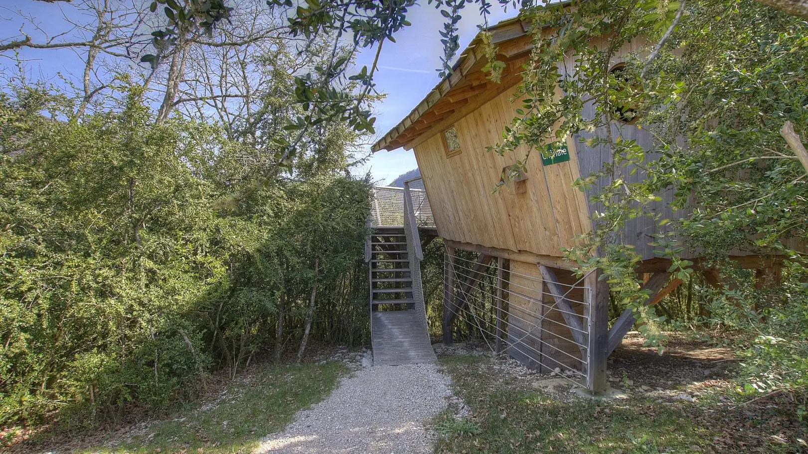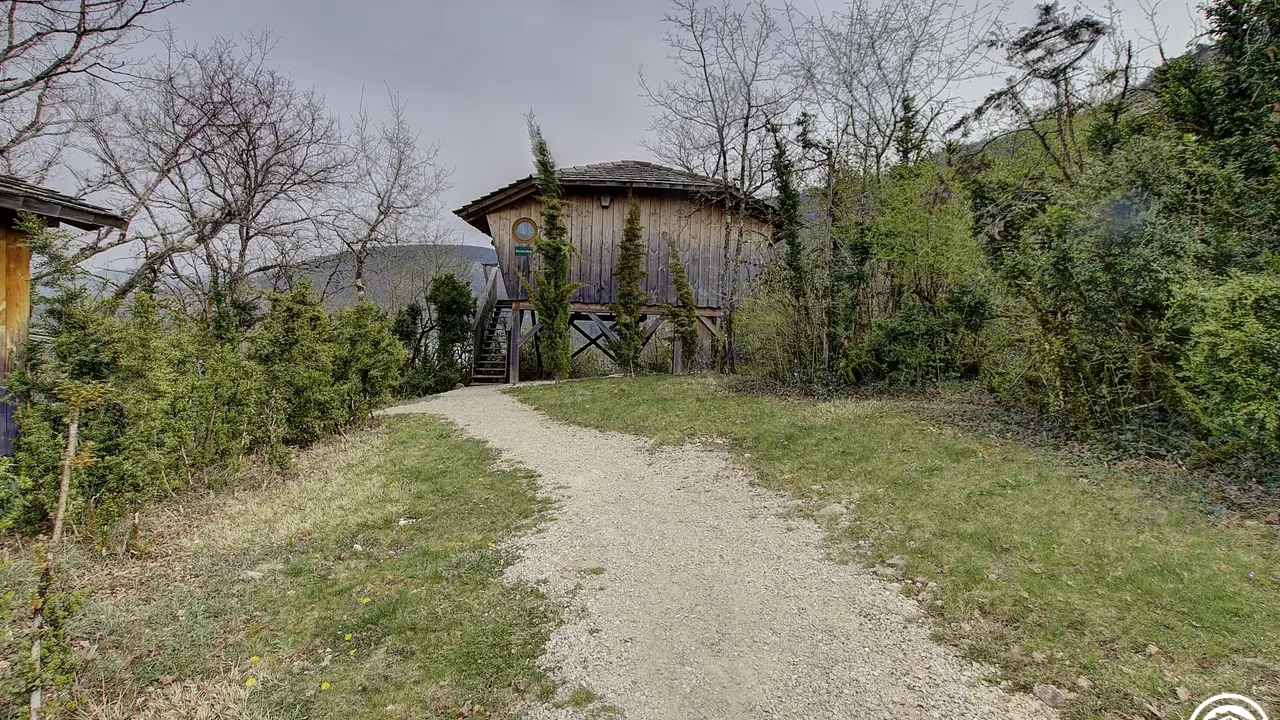 Halfway up, Le Chenaie (23 sq.m. cabin) has, without doubt, one of the finest views of the river Ain. Large wooden staircase up to terrace (15 sq.m.) nearly as big as the cabin itself! The rectangular terrace, in leafy setting with commanding view of river Ain, faces east so is sunny until 2pm. Charming cabin has picture window and 3 separate areas. To right as you enter: dining area with kitchenette (2 ring ceramic hob, fridge, microwave) & lime green 'garden' table. At back: visible sleeping area (single bunk beds) with safety net and to their left an 'invisible' sleeping area for 2 people (fold-down double bed) enabling space to be used for other purposes when bed folded up. Shower room/WC at back of main room.|On arrival you are given a kit of 'basic' products. Best bits: wonderful views from both outside and inside, clever lay-out of cabin, giant porthole over dining area giving the cabin a 'nautical' air, nets around terrace and bunk beds, restful wood décor. Le Chenaie is part of a 'nature' site with total of 7 cabins or lodges which blend perfectly into this forest of box trees in the heights above Serrières-sur-Ain, overhanging the river Ain. Each cabin has its own identity and is built on stilts 2 metres above ground, with totally secure access and terraces. Outstanding location in the Ain gorges: canoeing, rowing, swimming.
