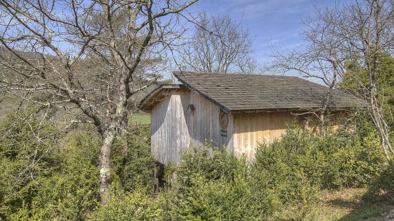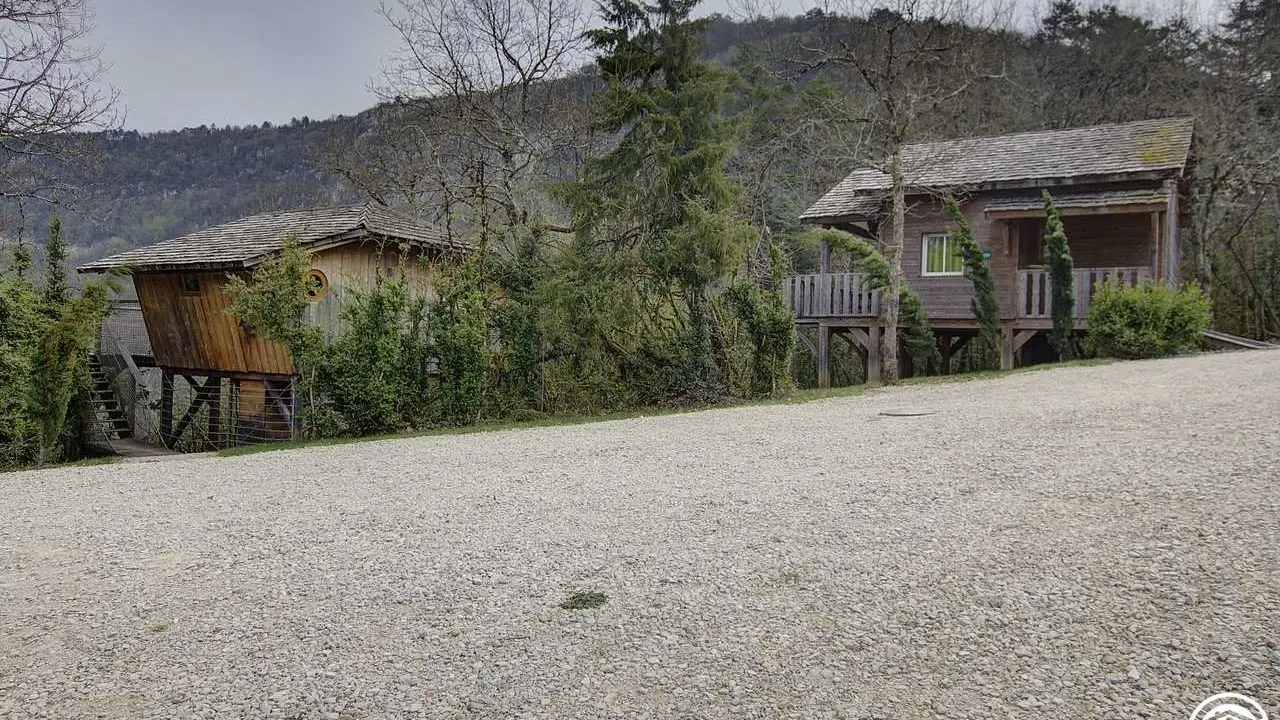 La Pinède has an intriguingly 'hidden' location halfway up the mountain. Its entrance (partly concealed) leads to a cabin (22 sq.m.) by means of a 'footbridge' at same level as the terrace (13 sq.m.) with panoramic view of river Ain and Ile Chambod. This rounded terrace, a kind of outdoor living room with dining area and deckchairs, faces west so has sun from noon to evening. Main room (large picture window opening onto terrace) with dining area (red bench) and kitchenette (2 ring ceramic hob, microwave oven, fridge). Private bedroom (150cm wooden bed for 2 people). Shower room & WC accessed via main living room where it is possible to have an extra bed.|On arrival you are given a kit of 'basic' products. 'Breakfast basket' can be delivered every morning, on request. Best bits: terrace, view (of course) and light filled rooms (all have windows). La Pinède is part of a 'nature' site with total of 7 cabins or lodges which blend perfectly into this forest of box trees in the heights above Serrières-sur-Ain, overhanging the river Ain. Each cabin has its own identity and is built on stilts 2 metres above ground, with totally secure access and terraces. Outstanding location in the Ain gorges: canoeing, rowing, swimming. Walking/hiking on the cliffs: GR (long distance footpath) and PR (local footpaths). Get up early and with luck and patience you may see chamois grazing on the dry turf.