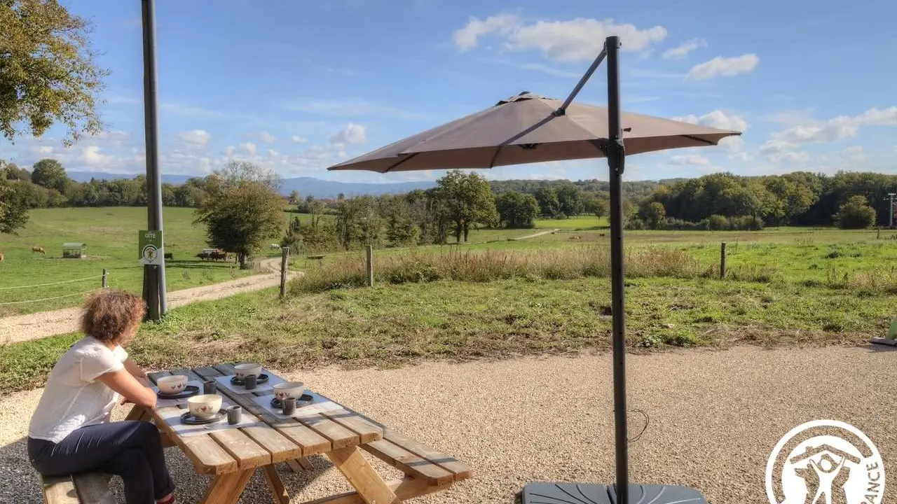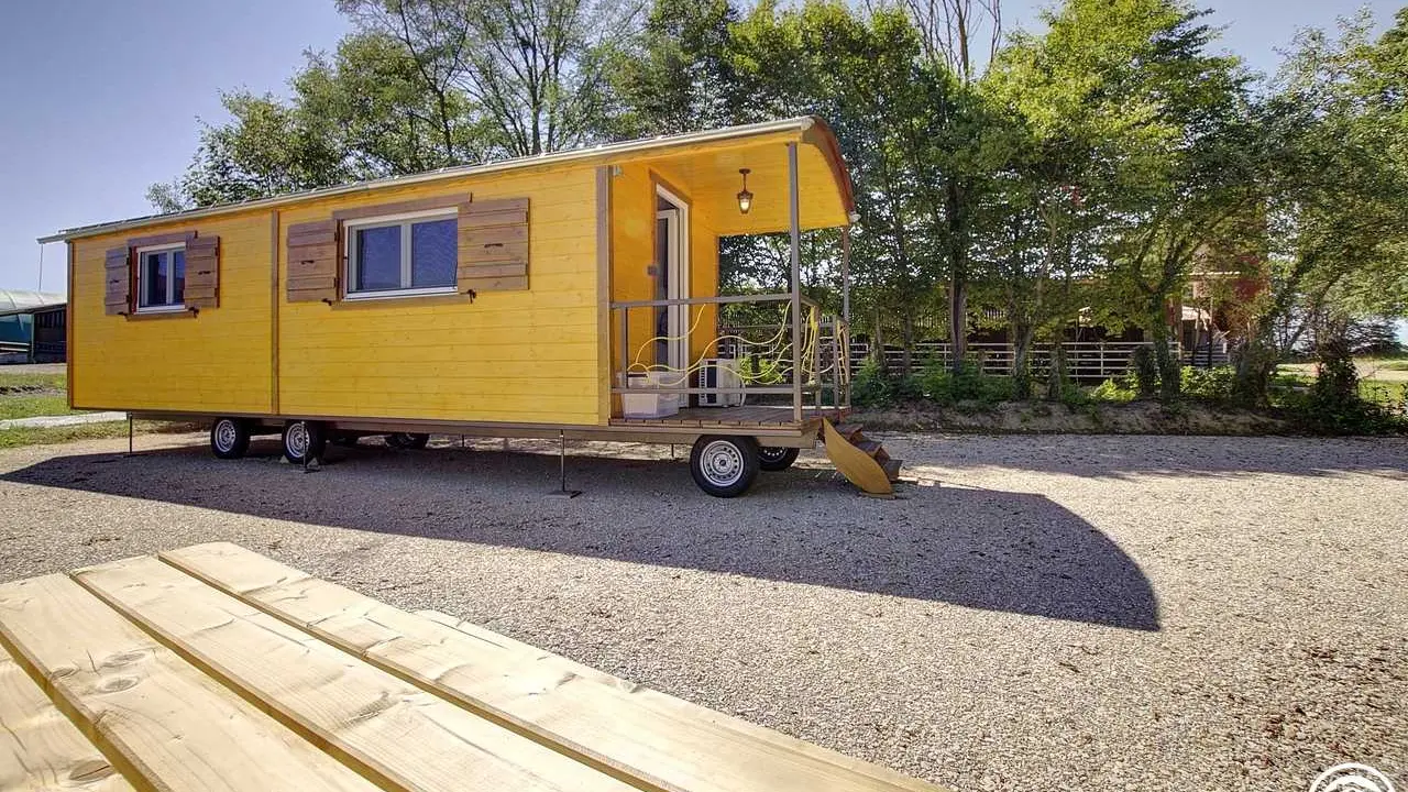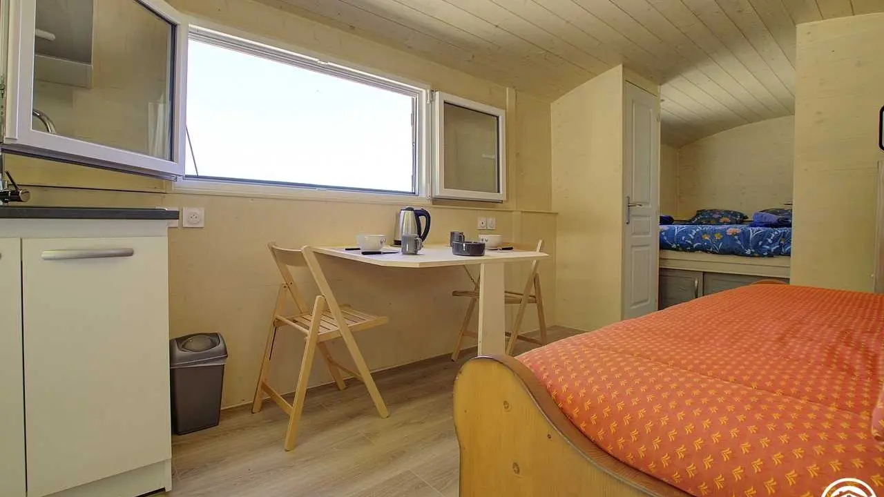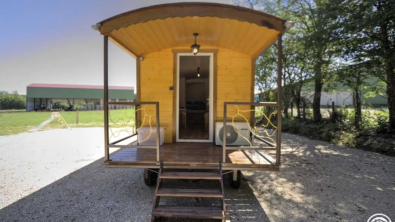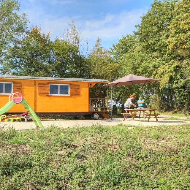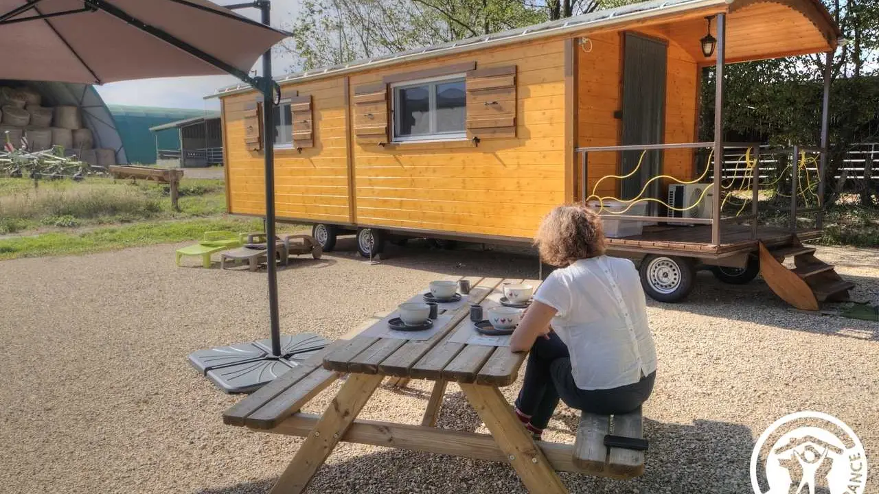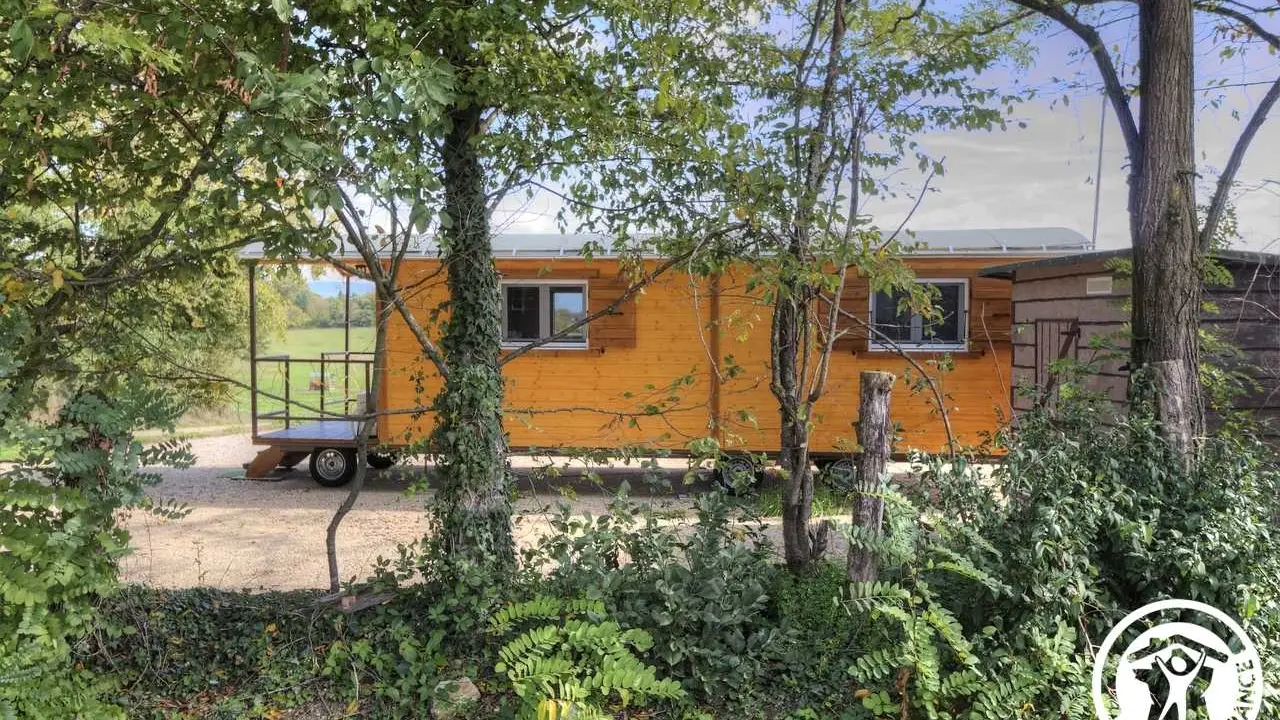 At the heart of an organic farming operation (suckler cows, label henhouse and cereals), the Roulotte de Nanette welcomes you up to 4 people. The arrival is via a private road, which leads to the farm. Going around, you arrive at the trailer and its private parking lot. From the courtyard, the entrance is via four steps which leads to the small terrace of 2 m². You discover a kitchenette with its sofa area including 2 single beds (pull-out) in 80*190 and in the extension, a raised bed in 160*200. A shower room and an integrated WC complete the rooms. Double flow air conditioning heating. For a short or longer stay, the owners will be happy to show you around the farm with them. On your arrival: the beds are made, the bathroom linen and the charges are included. The windows are equipped with mosquito nets for better comfort. From the kitchen, you will have a view of the courtyard and the fields. Ideally located to discover the crossroads of the Bresse regions with its exceptional heritage, its many pedestrian paths, the Dombes with its ponds, its Bird Park and about 30 minutes away, the Revermont with its earthenware recognized in Meillonnas - Heritage of the Ain.