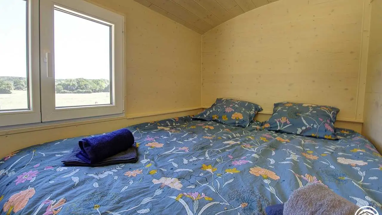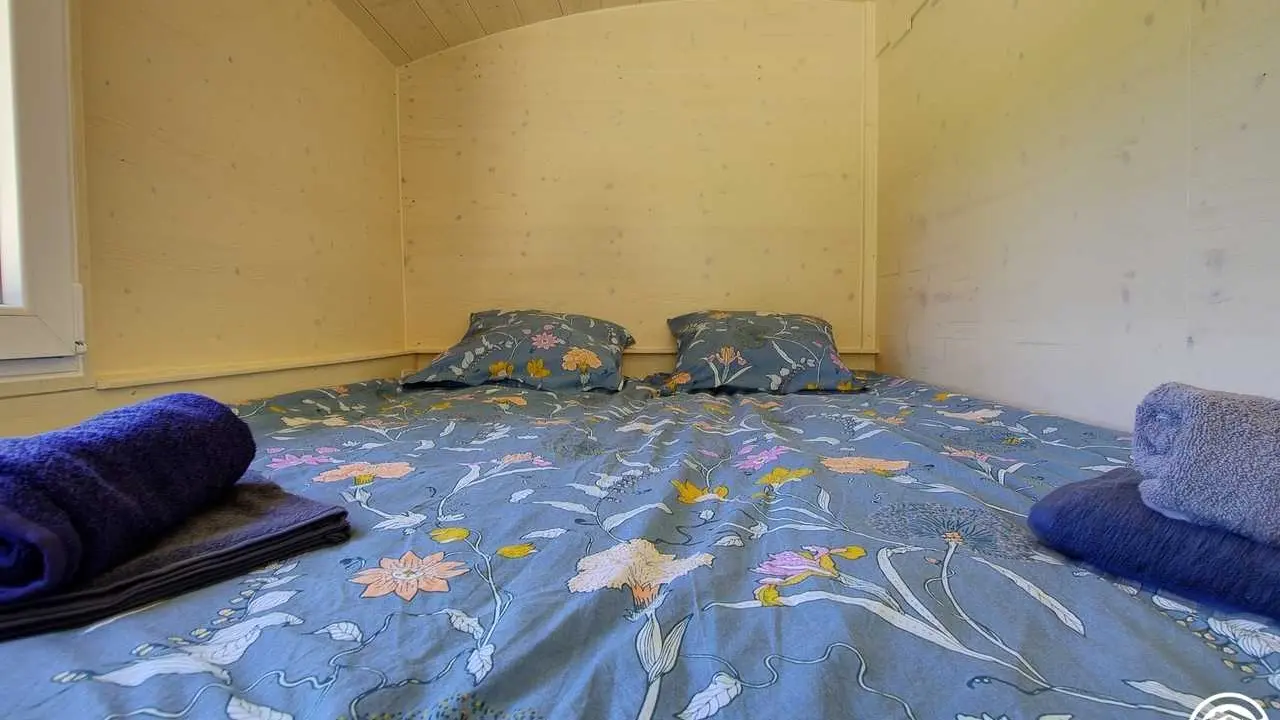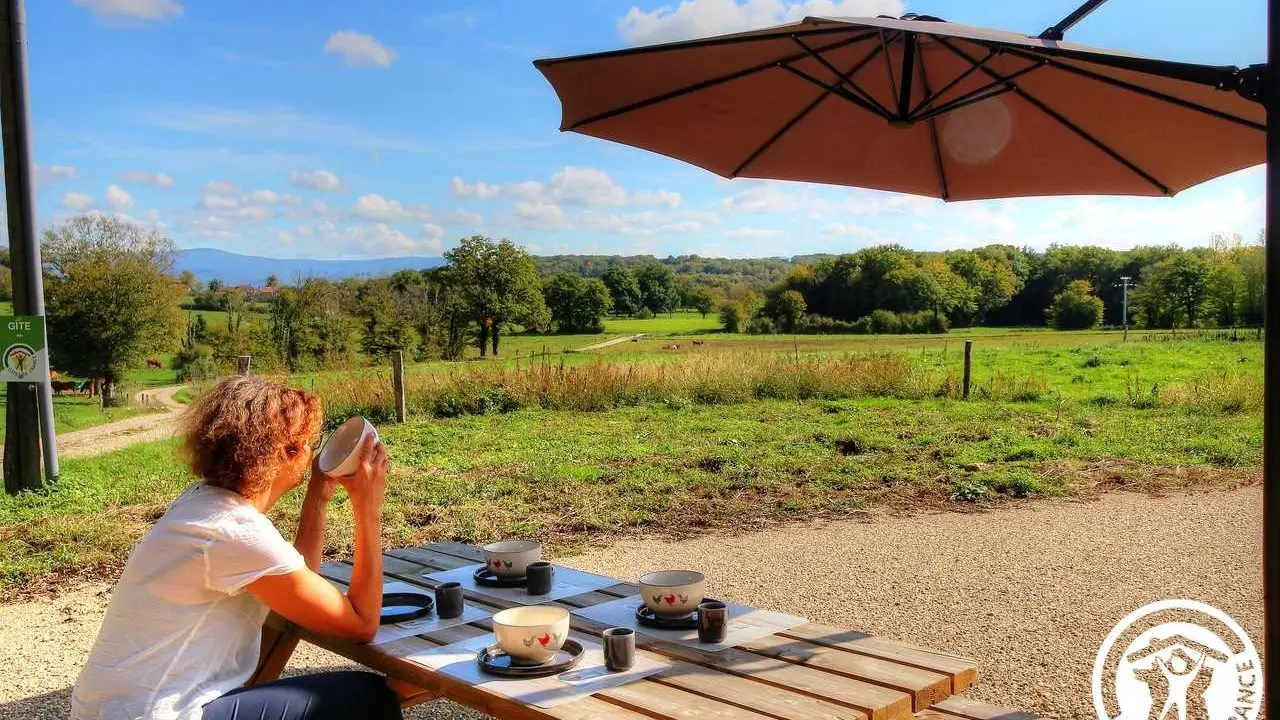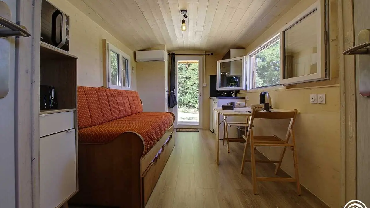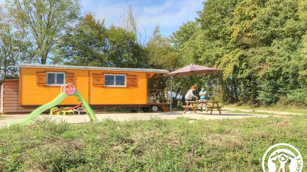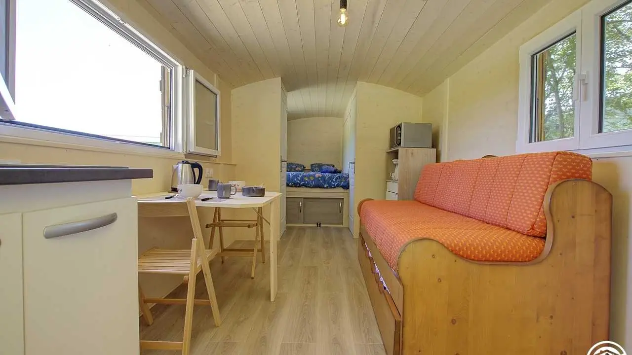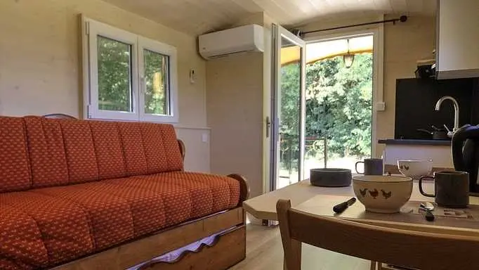 At the heart of an organic farming operation (suckler cows, label henhouse and cereals), the Roulotte de Nanette welcomes you up to 4 people. The arrival is via a private road, which leads to the farm. Going around, you arrive at the trailer and its private parking lot. From the courtyard, the entrance is via four steps which leads to the small terrace of 2 m². You discover a kitchenette with its sofa area including 2 single beds (pull-out) in 80*190 and in the extension, a raised bed in 160*200. A shower room and an integrated WC complete the rooms. Double flow air conditioning heating. For a short or longer stay, the owners will be happy to show you around the farm with them. On your arrival: the beds are made, the bathroom linen and the charges are included. The windows are equipped with mosquito nets for better comfort. From the kitchen, you will have a view of the courtyard and the fields. Ideally located to discover the crossroads of the Bresse regions with its exceptional heritage, its many pedestrian paths, the Dombes with its ponds, its Bird Park and about 30 minutes away, the Revermont with its earthenware recognized in Meillonnas - Heritage of the Ain.
