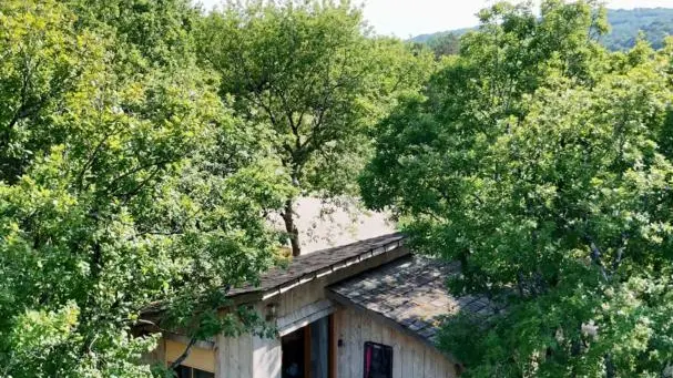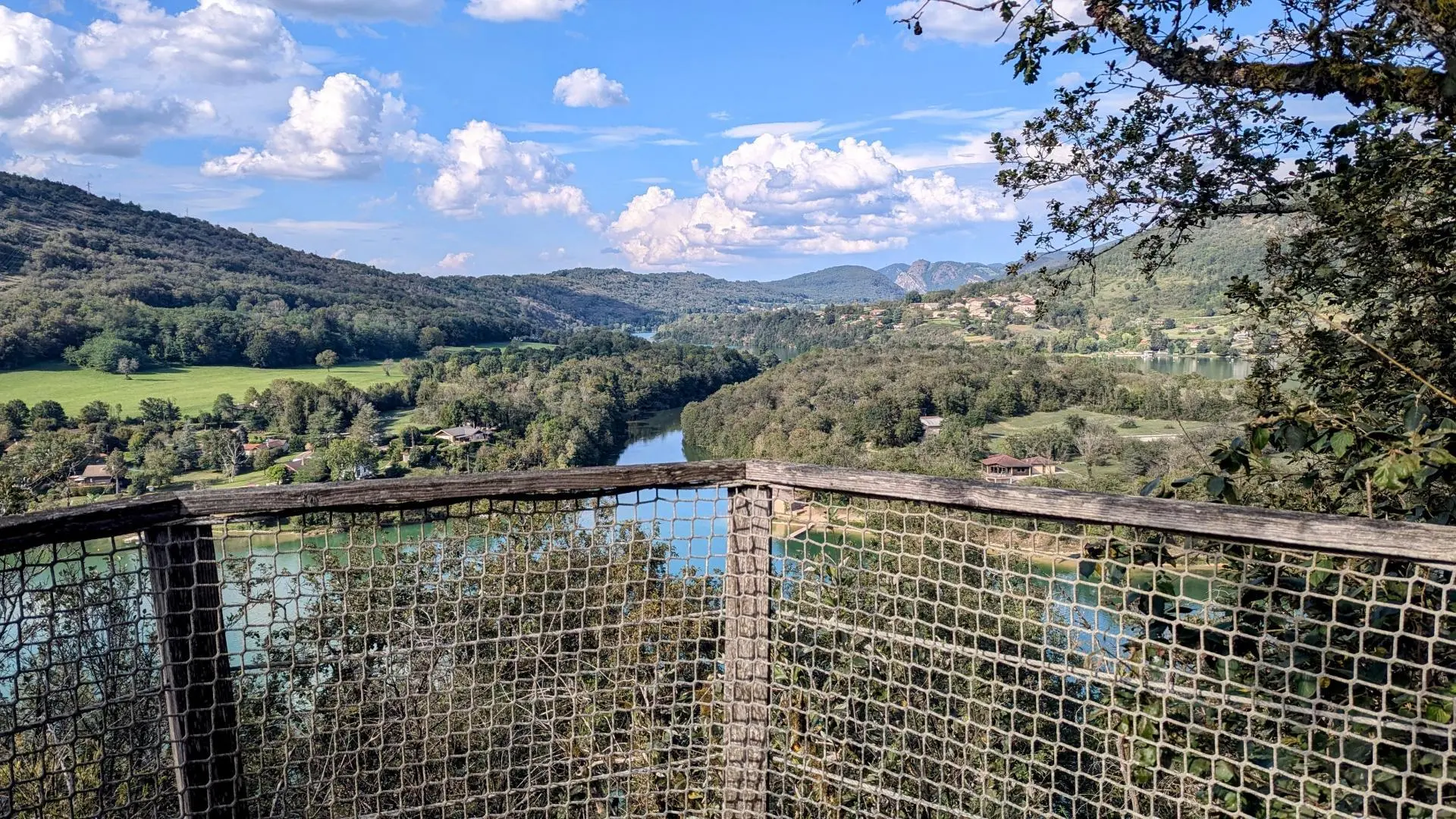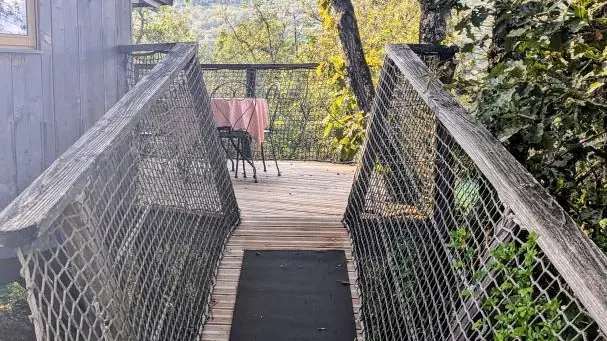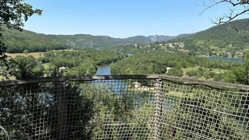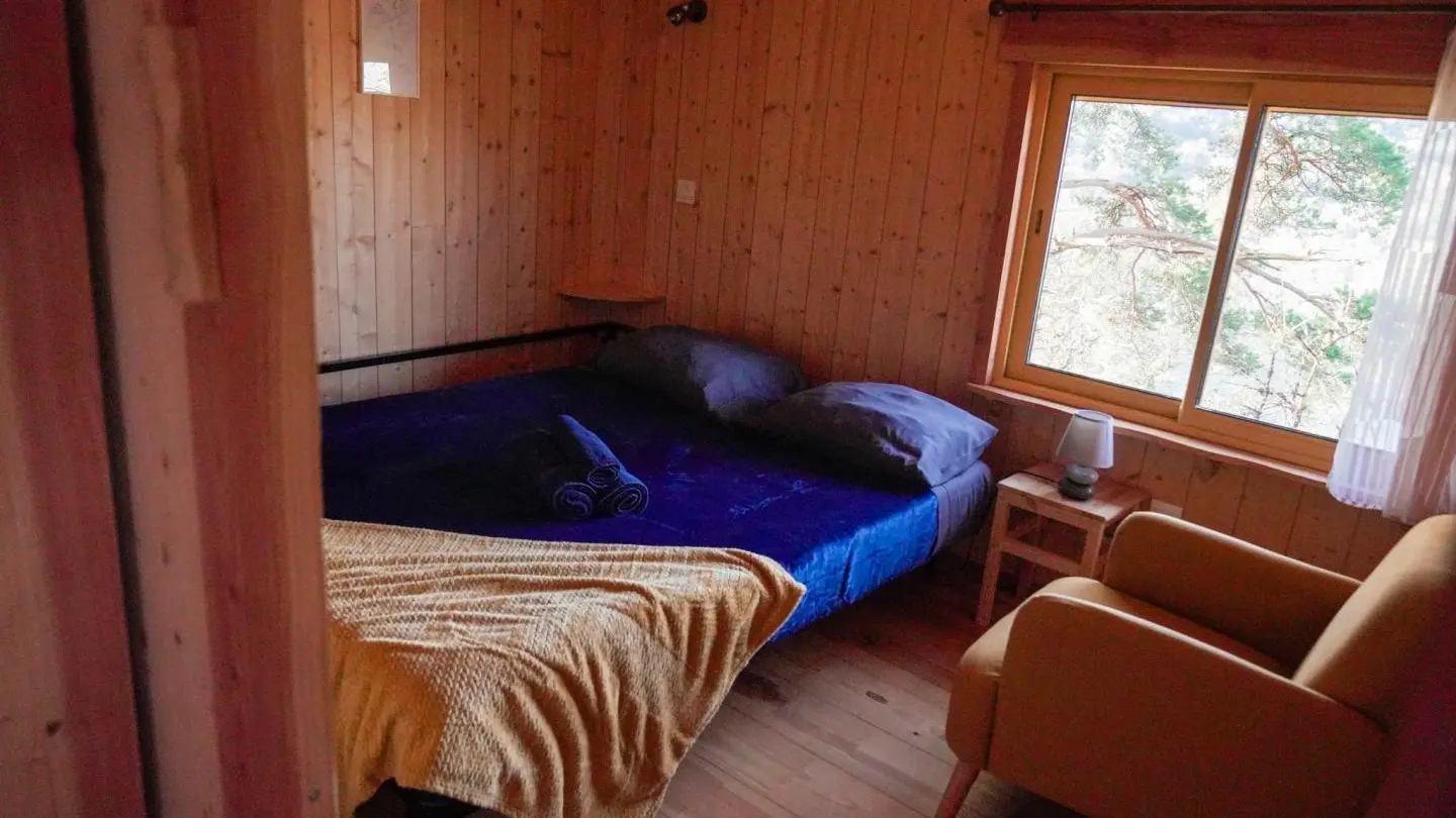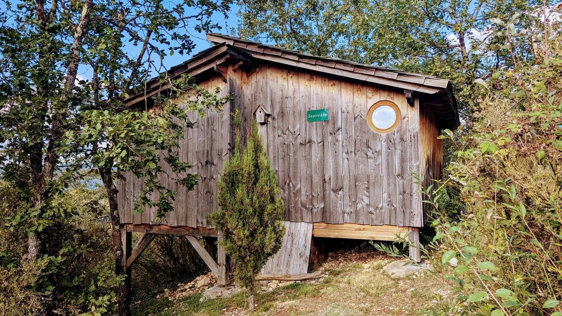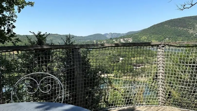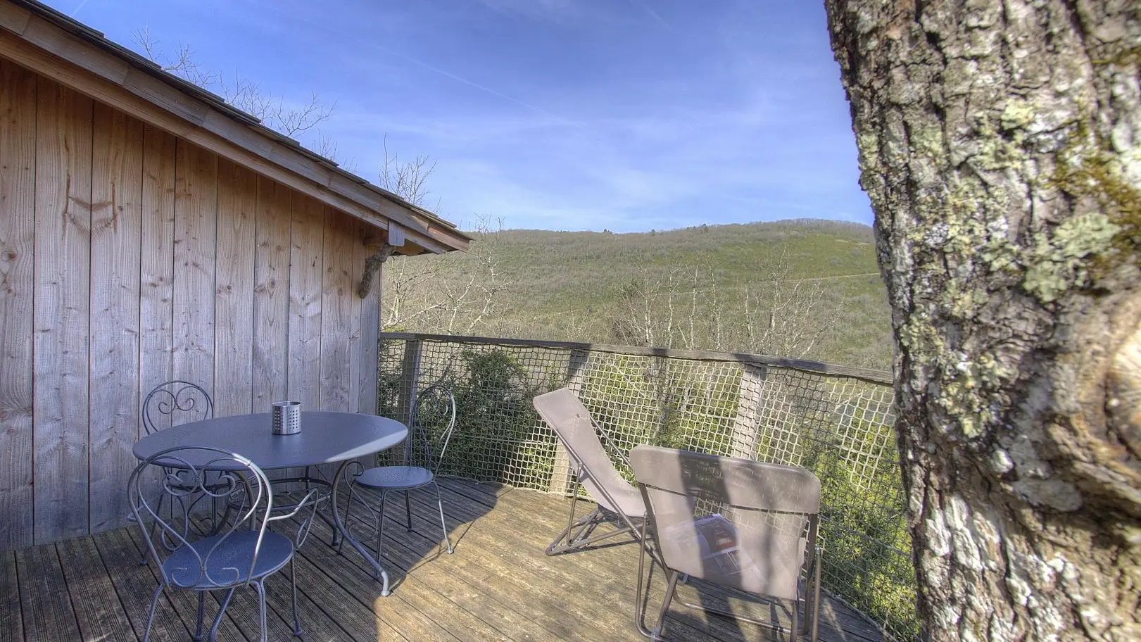 Extra bed possible in living room. On arrival you are given a kit of 'basic' products. 'Breakfast basket' can be delivered every morning, on request. Best bits: terrace, view (of course) and light filled rooms (all have windows). |La Sapinière is part of a 'nature' site with total of 7 cabins or lodges which blend perfectly into this forest of box trees in the heights above Serrières-sur-Ain, overhanging the river Ain. Each cabin has its own identity and is built on stilts 2 metres above ground, with totally secure access and terraces. Outstanding location in the Ain gorges: canoeing, rowing, swimming. Walking/hiking on the cliffs: GR (long distance footpath) and PR (local footpaths). Get up early and with luck and patience you may see chamois grazing on the dry turf