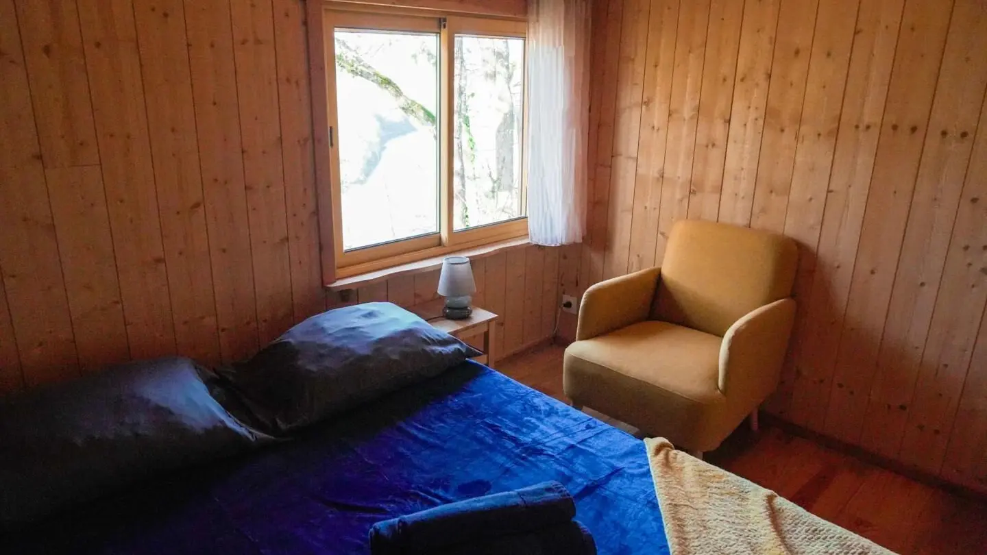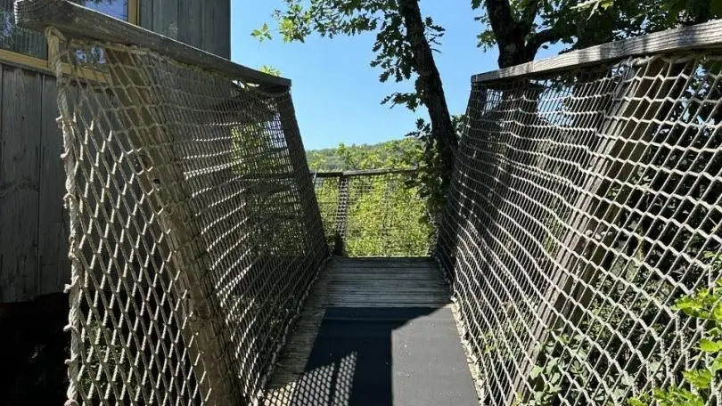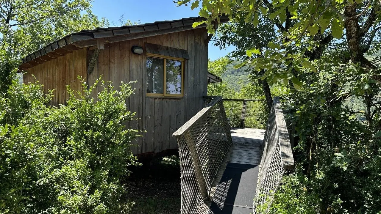 Halfway up the mountain, La Sapinière is intriguingly "hidden". Access to this 22m² cabin is via a single-storey "footbridge" leading to a 13m² terrace with panoramic views over the River Ain and Ile Chambod.