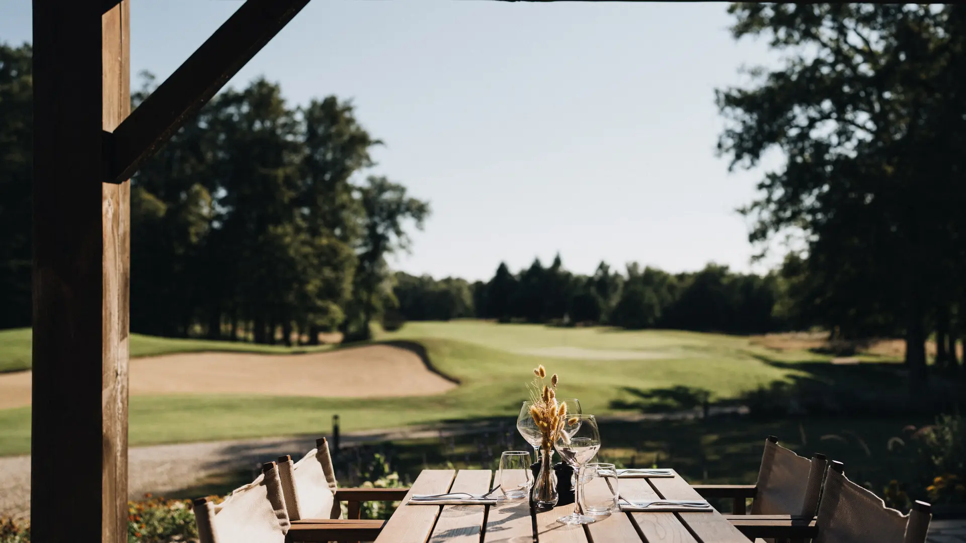 In fine weather, our terrace, facing the course, welcomes you in the shade of its pergola.