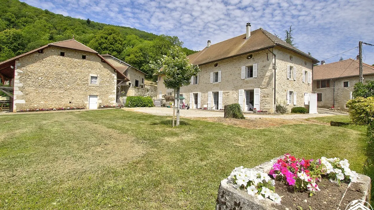 It has a large south-facing terrace with unobstructed views of the Dent du Chat and the Granier range, and also overlooks a 1.5-hectare meadow and former orchard. To access the interior: two possible entrances from the private courtyard: the main entrance opens onto a dining room with ornamental fireplace, a semi-open kitchen and a family atmosphere reminiscent of the charm of yesteryear. Two lounges, one with an open fireplace. Small bathroom (clawfoot tub). Alternatively, a laundry/boiler room with storage, shower and separate toilet. On the 1st floor, a corridor leads to the first two bedrooms: the Rose (160cm bed) and the Fougère (120cm bed). Another corridor leads to the Blue bedroom with its four single beds, and then to the Suite, comprising a sleeping area and a private lounge (2 electric 80x190 beds) with a small dressing room. The 5th Green bedroom for 4 people (1 bed 140 and 2 beds 90) is located beyond the relaxation-office area and the shower room accessible by 3 steps; separate WC. Oil-fired heating, extra charge. Numerous hiking trails. In the surrounding hamlets, discover the ovens (in the hamlet of Meyrieu, the Four Banal, listed as a historical monument since 1938), and the WE gourmands of Brillat-Savarin's talks. Leaning against the mountain, leading to Innimond, a footpath starts from the house. Bugey: 500 km of marked hiking trails. The lakes are accessible on foot or by car. Fishing in the owners' private lake (on request). Numerous waterfalls, Walibi Aquatic Center, Grottes de la Balme, etc...