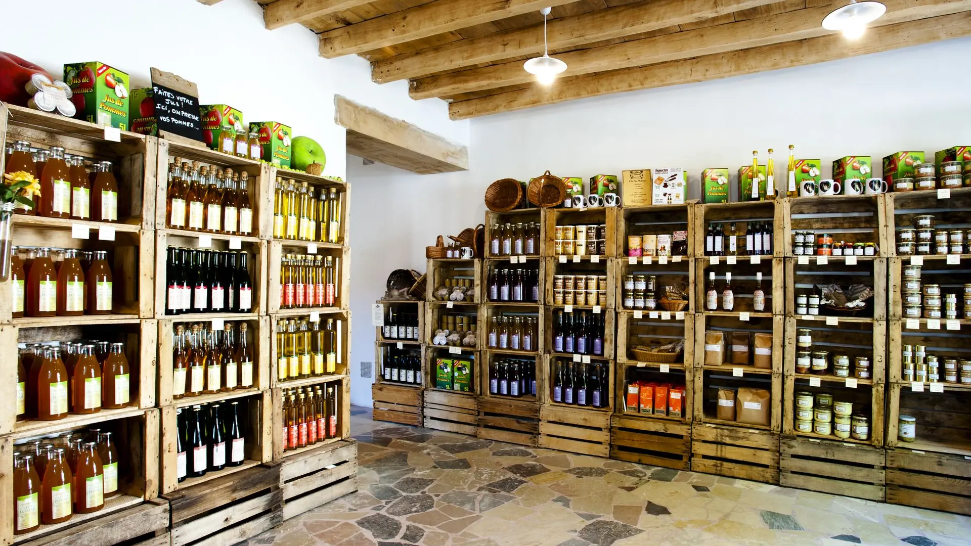 In this shop of local products, you will find fresh products (cheeses, delicatessen etc), fruit juices, compotes, cider, beer, oils and vinegar, flours, coffee, herbal teas and teas, spices, honey, saffron, coulis, foie gras and terrines.