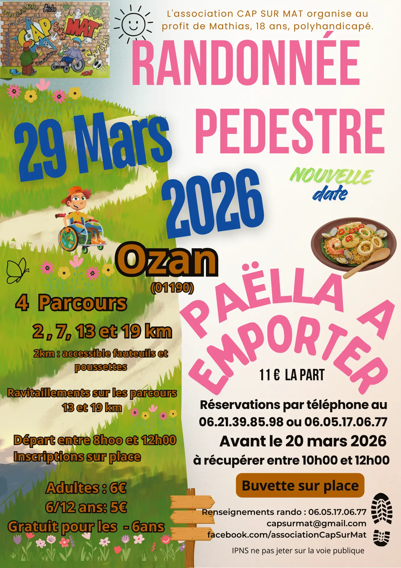 Hiking and mountain biking open to all. We propose 4 routes in the wooded areas of Ozan, Boz and Reyssouze of 3, 8, 12 and 19 km. In aid of Mathias, 17, polyhandicapped.