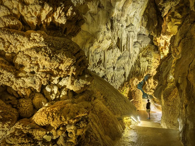 You enter the underground world by following the bed of an ancient river in the rock, from its point of burial to its outlet. The descent is gradual and safe, as the underground world sculpted by the water reveals its spectacular concretions. They create a magical universe.