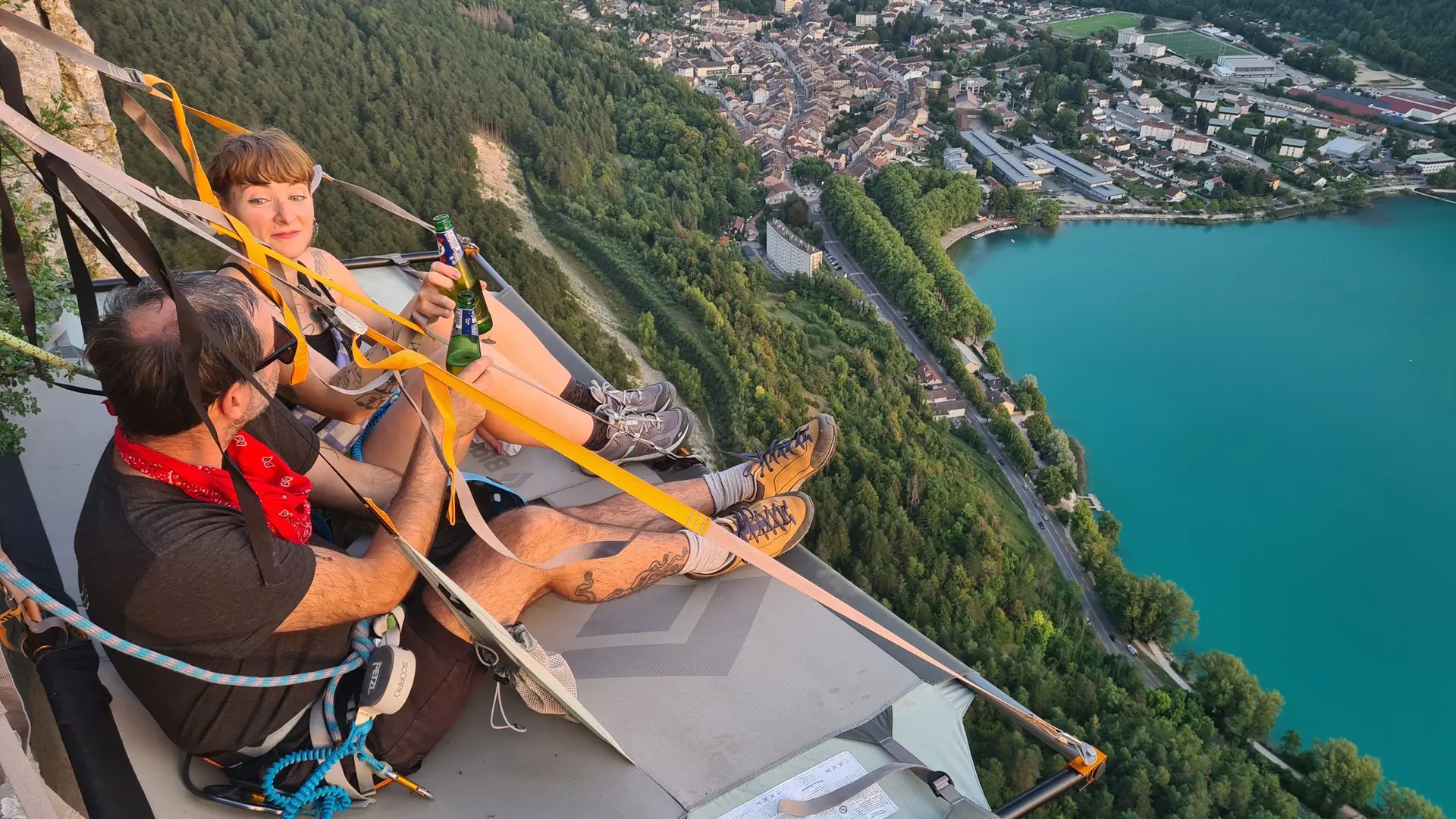 Imaginez le décor : installés sur un portaledge accroché à la falaise au-dessus du lac de Nantua, vous profitez d'un sublime coucher de soleil tout en sirotant votre apéro. Sensations fortes assurées !