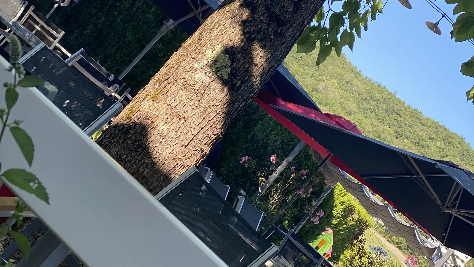 Terrasse ombragée, aire de jeux enfants à l’extérieur