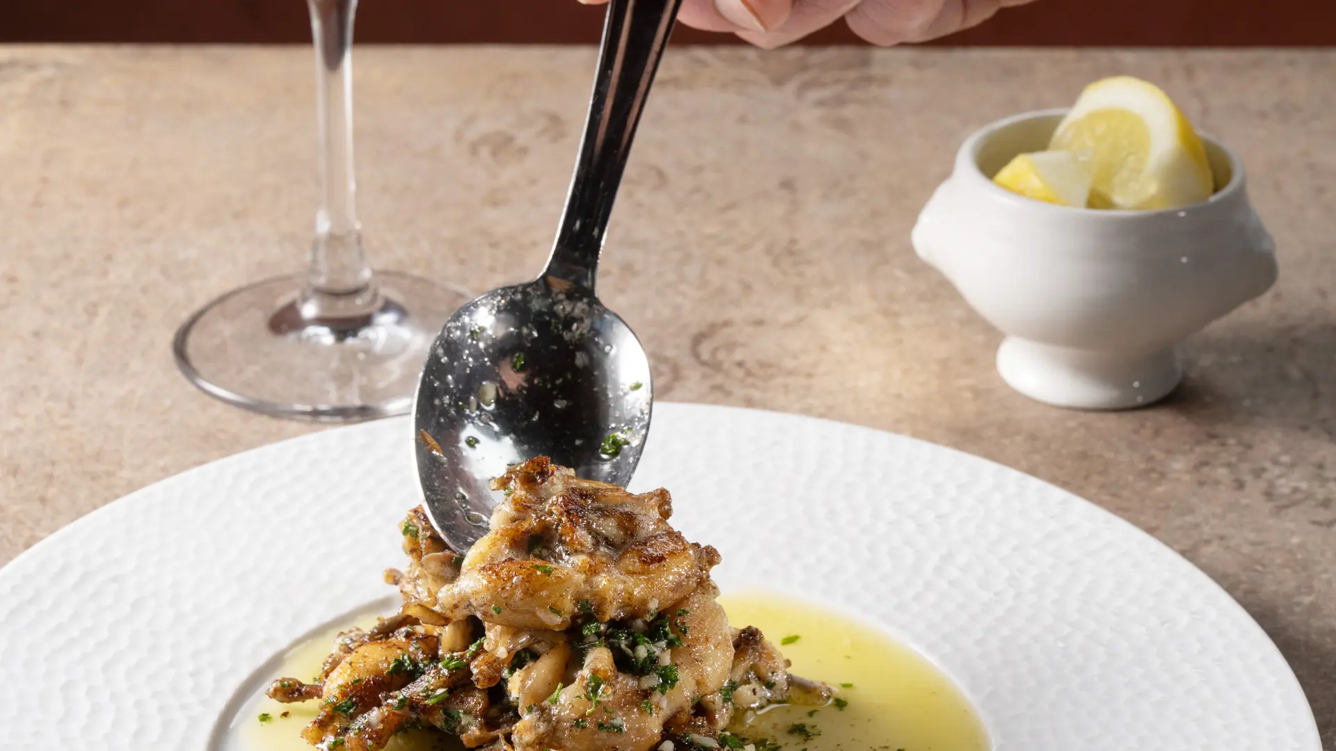 Spécialités: poulette de Bresse à la crème, poulet fermier de l'Ain, crêpes de parmentier, cuisses de grenouilles persillées sautées comme en Dombes, crosti de rouget à l'olive, petite salade mélangée et caviar d'aubergine.