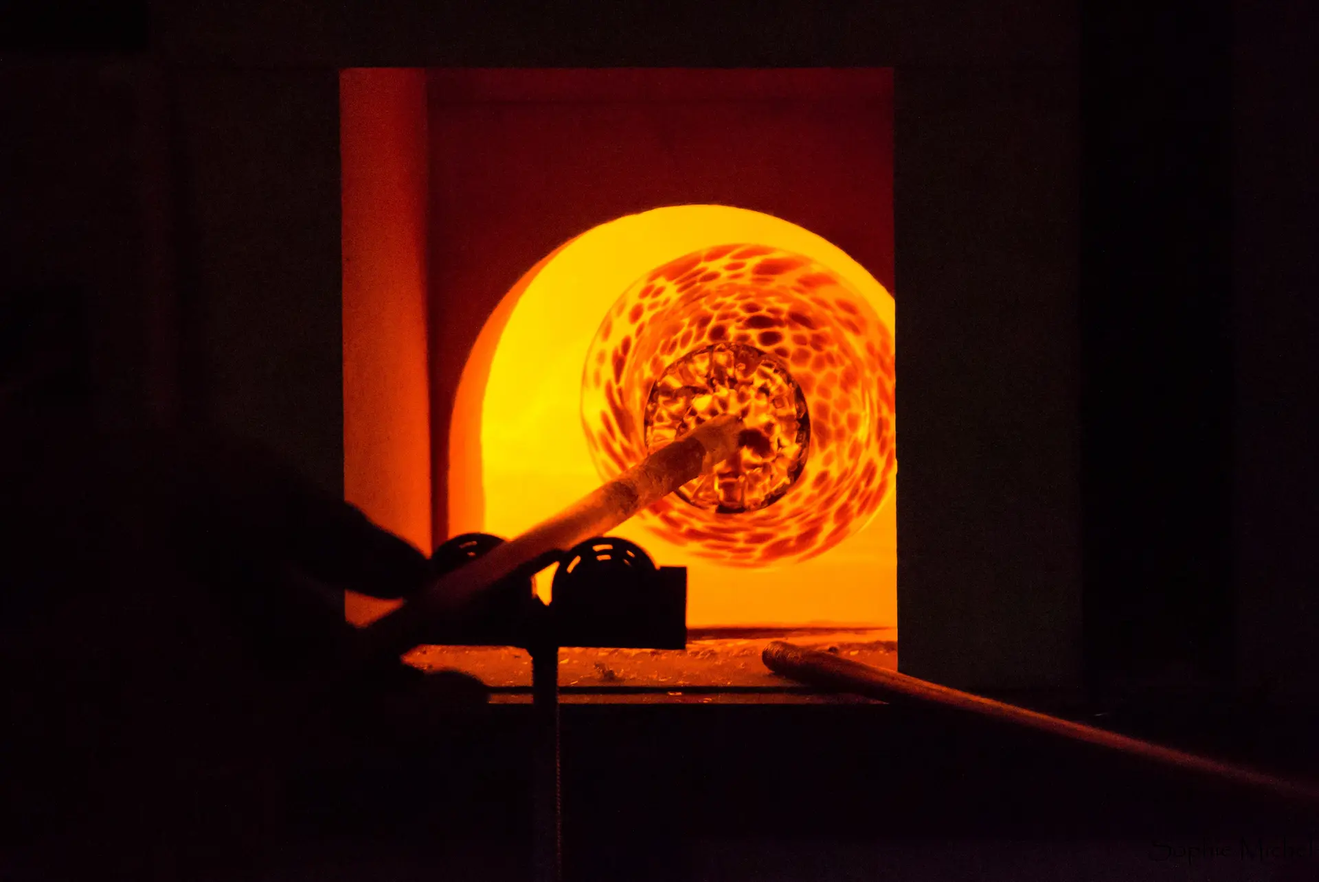 Lors de votre visite, vous le verrez cueillir, maillocher, souffler et façonner le verre pour transformer cette matière en fusion en un objet prestigieux