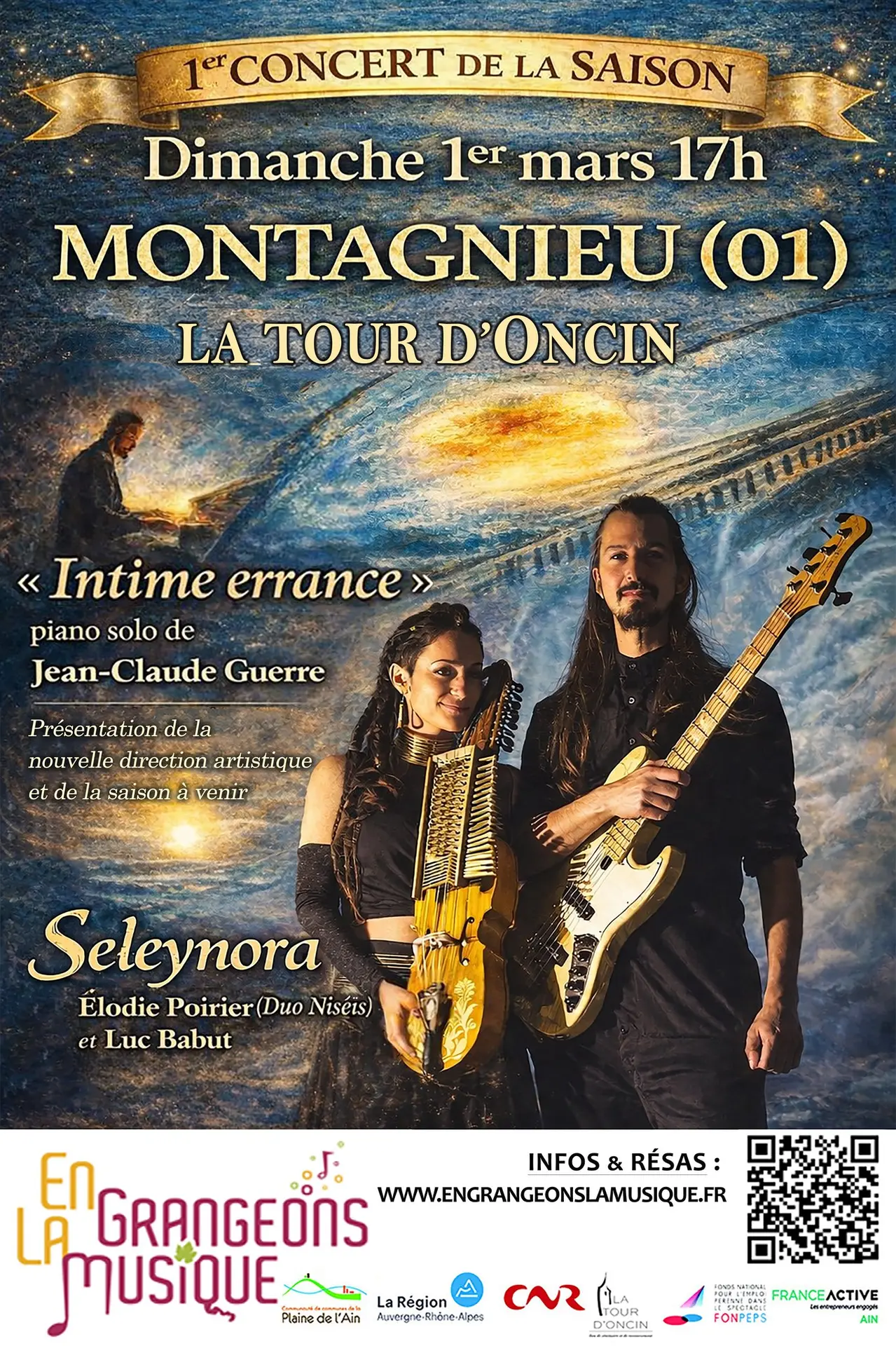Pour cette soirée inaugurale, deux concerts dans le cadre enchanteur de la tour d'Oncin, une demeure ancienne au cœur des monts du Bugey. Au programme, une présentation de la nouvelle direction artistique et de la saison à venir, agrémentée des performances de Jean-Claude Guerre, pianiste solo avec « Intime errance » et "Seleynora" par Élodie Poirier (duo Niséïs) au chant, nickel harpa, violoncelle et Luc Babut à la guitare basse.