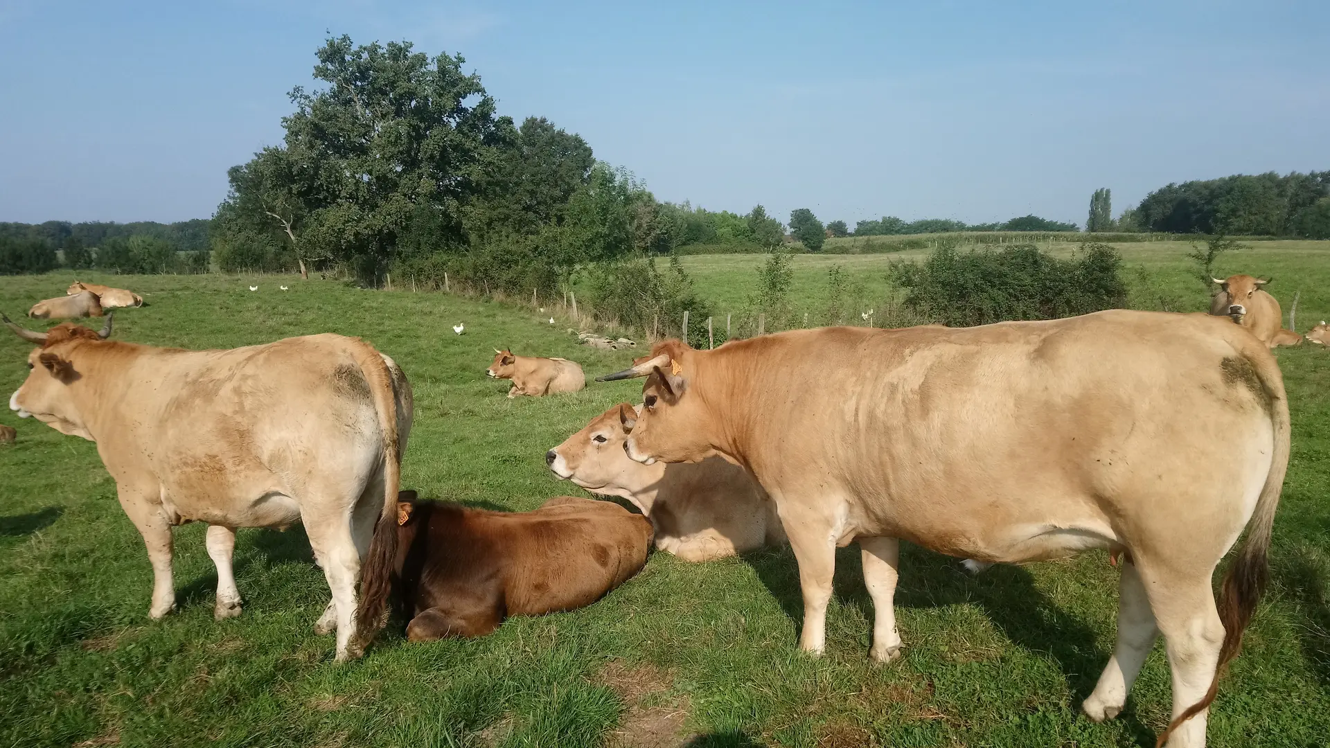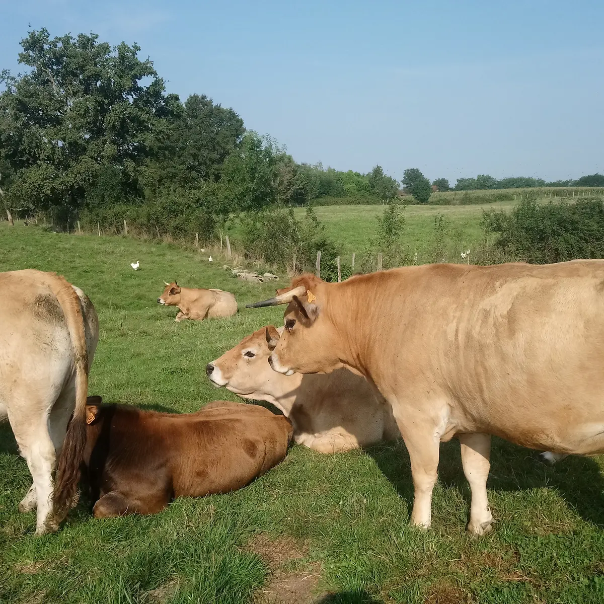 Exploitation agricole polyculture élevage : 80 vaches de race Aubrac, porcs, oies fermières, volaille de Bresse (poulets, chapons et poulardes), céréales.