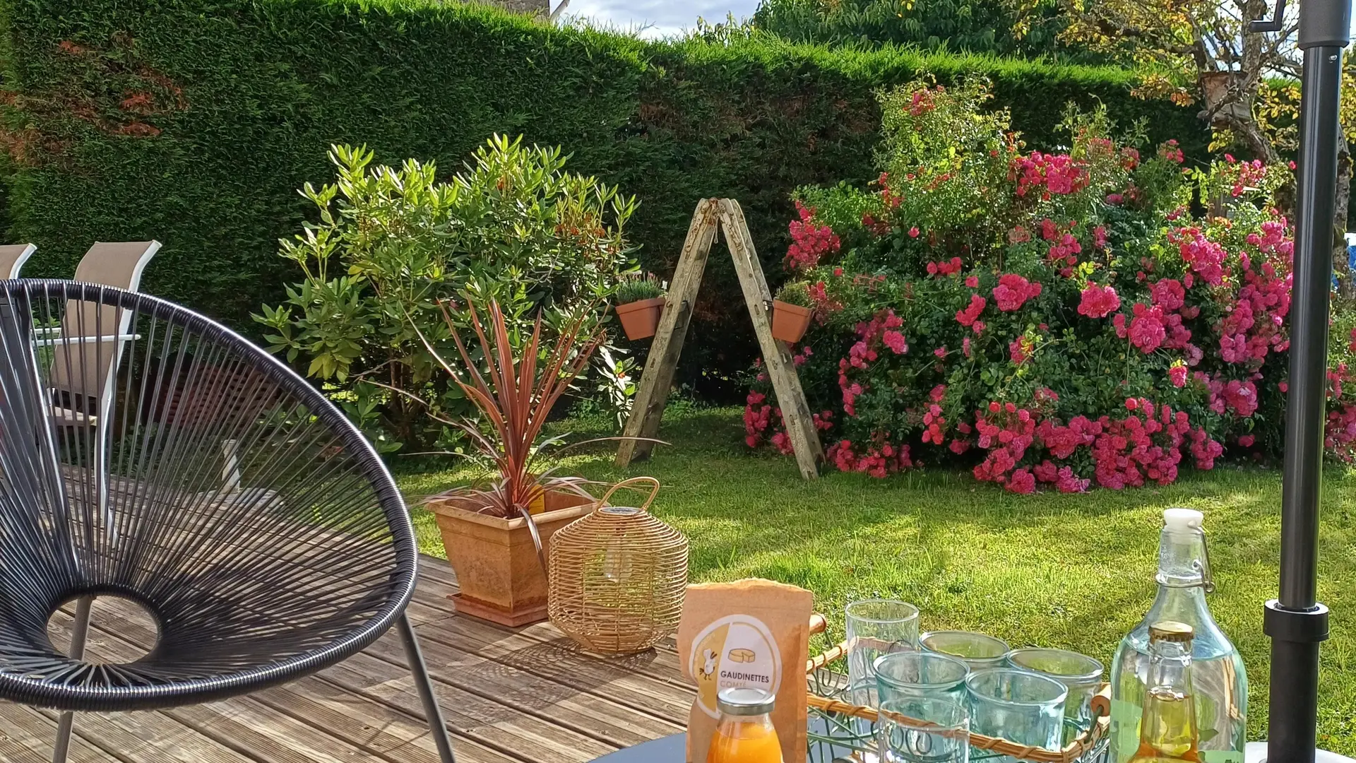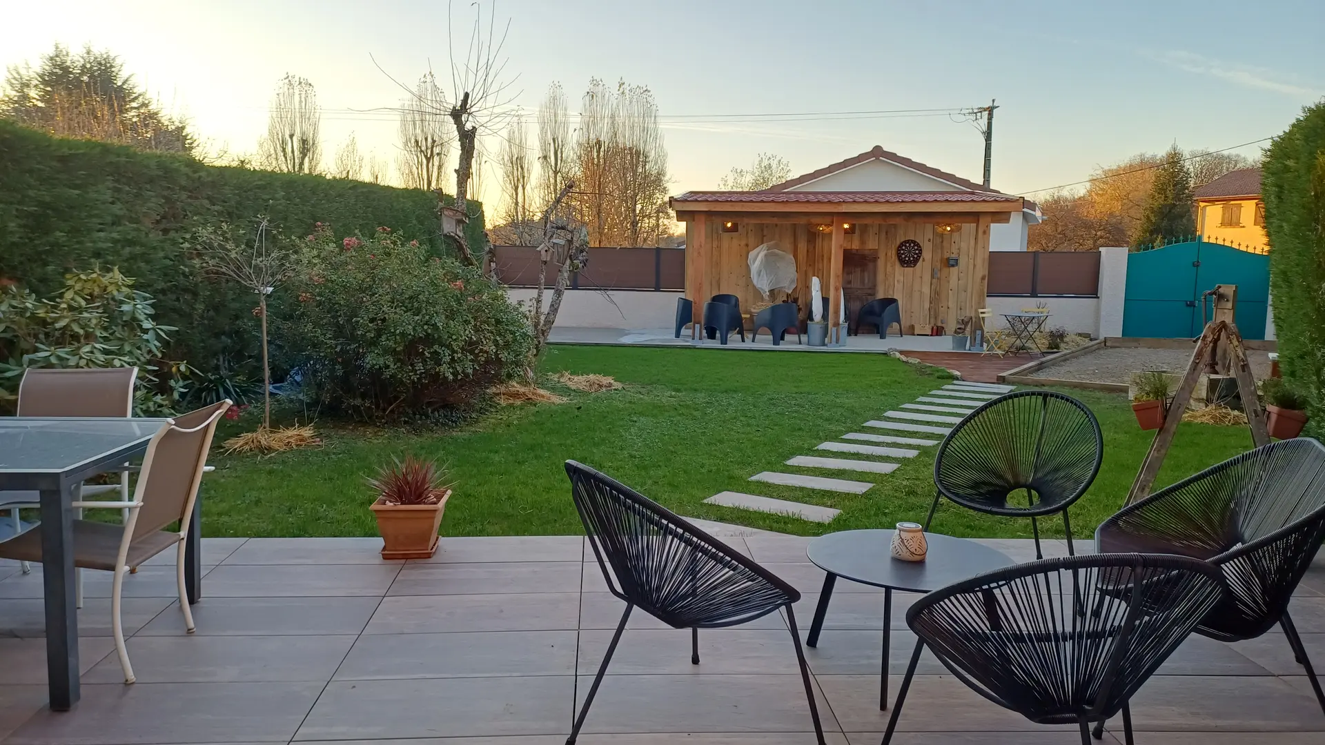 Ouvrez la baie vitrée, le jardin vous attend ! Les terrasses couvertes et découvertes alternent entre pelouse et espaces fleuris.
