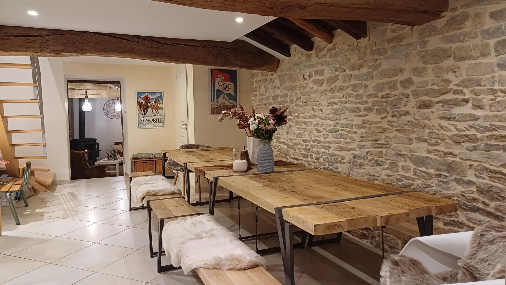 Dès l'entrée, la salle à manger et sa grande table campagnarde donnent le ton.