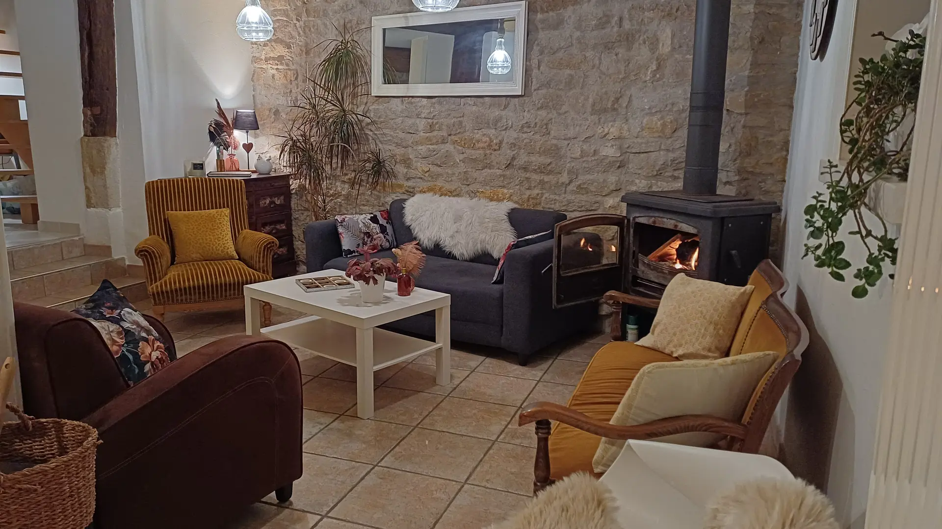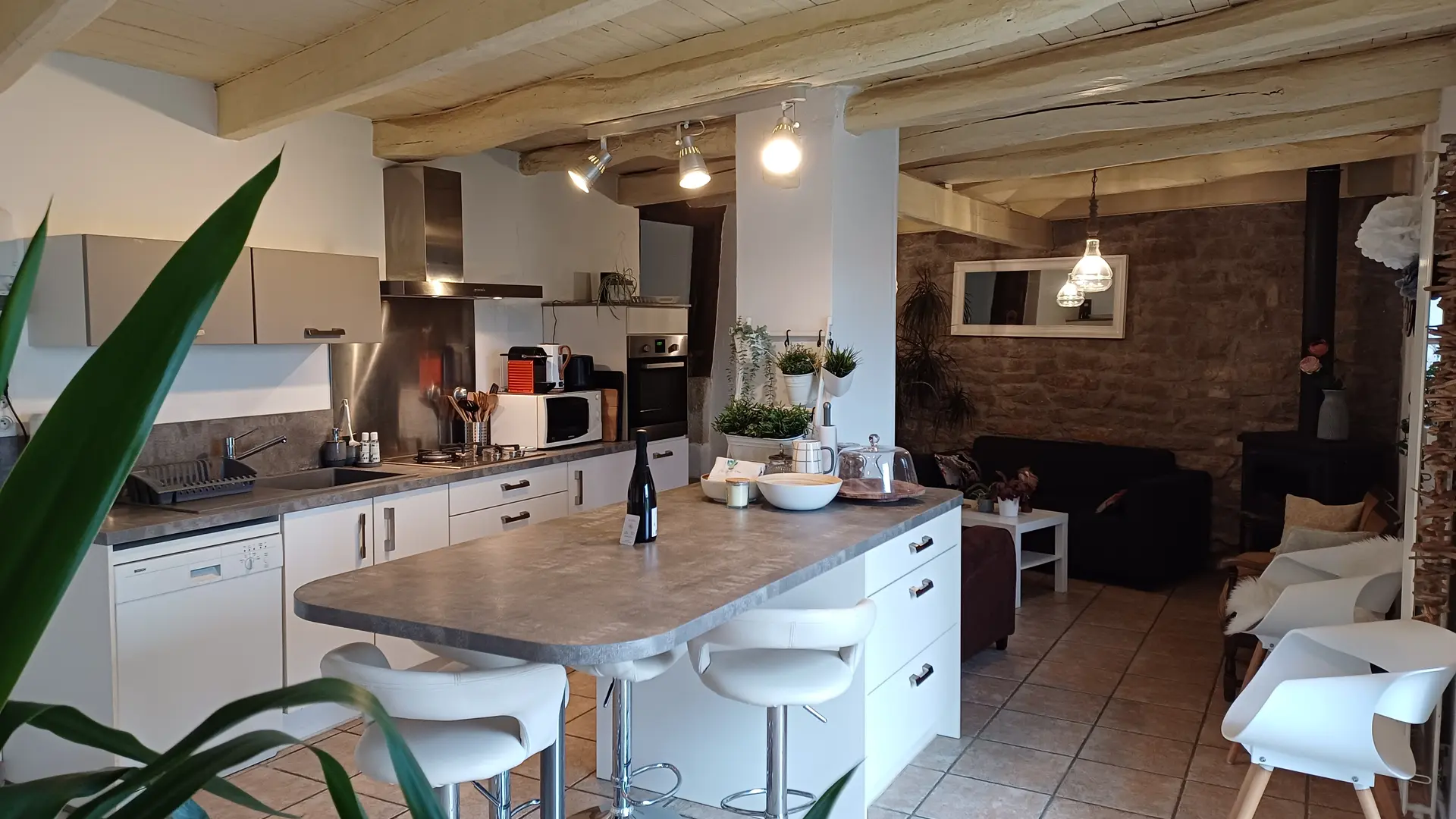 Puis le 1er salon, avec ses fauteuils de velours et son ancien poêle à bois s'ouvre sur la cuisine, sans doute le cœur de maison. Entièrement équipée pour 12 convives vous trouverez tout le nécessaire pour savourez mets et vins locaux.