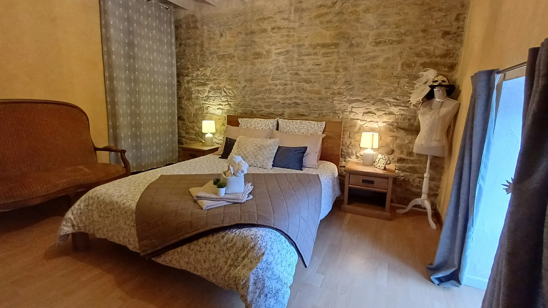A l’opposé, la chambre parentale pierre et bois réserve un cadre plus intimiste et apaisant.