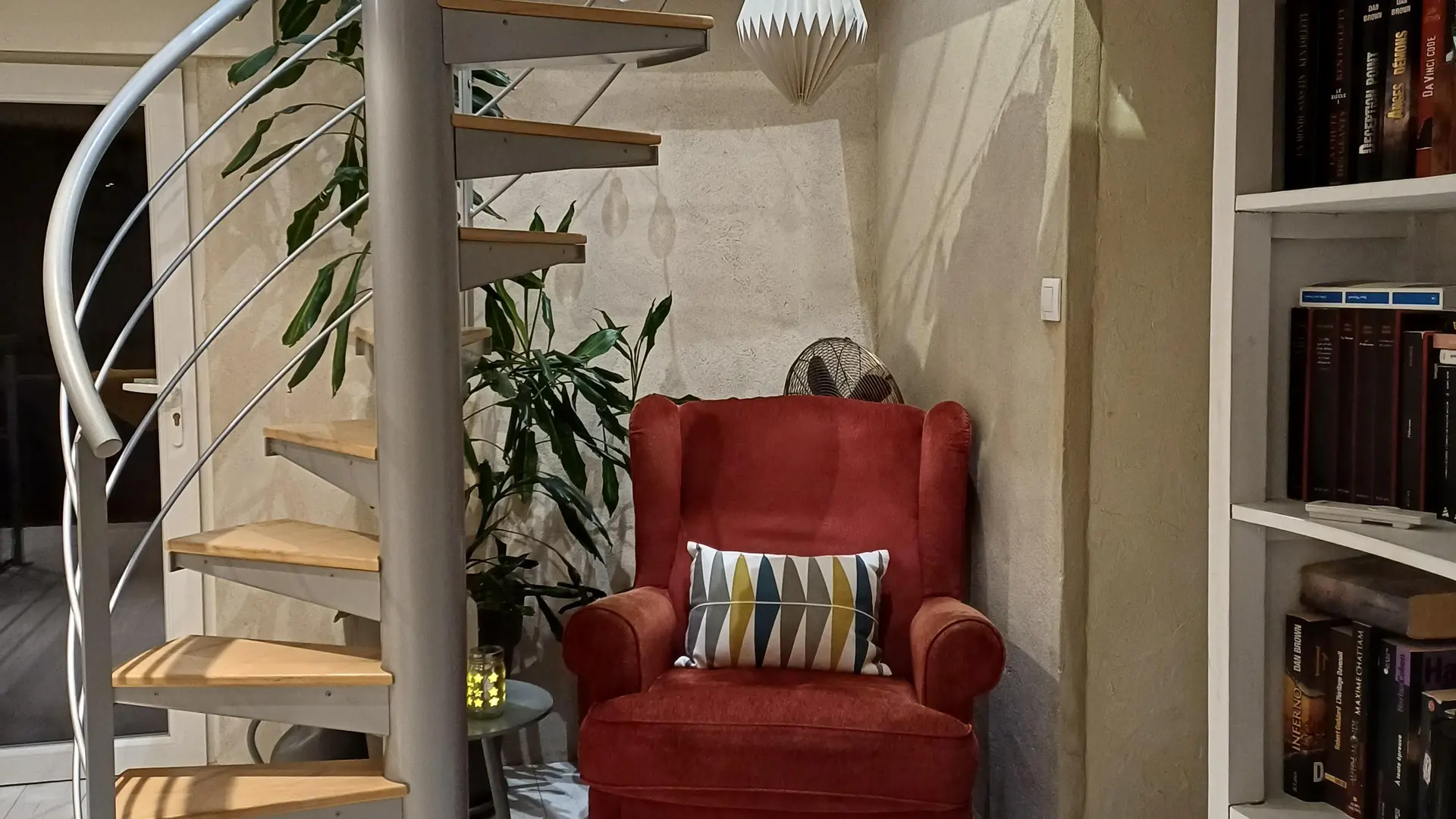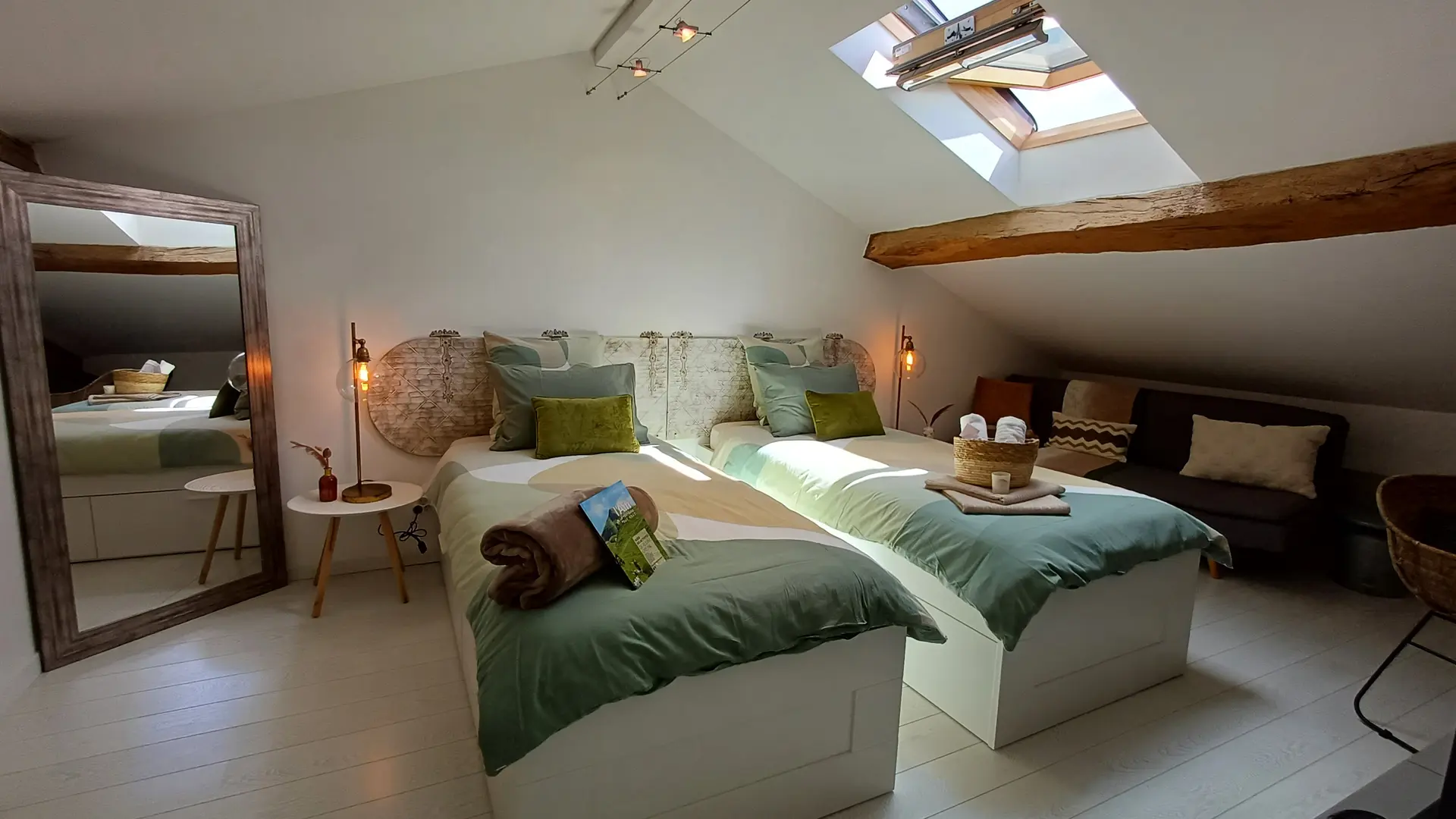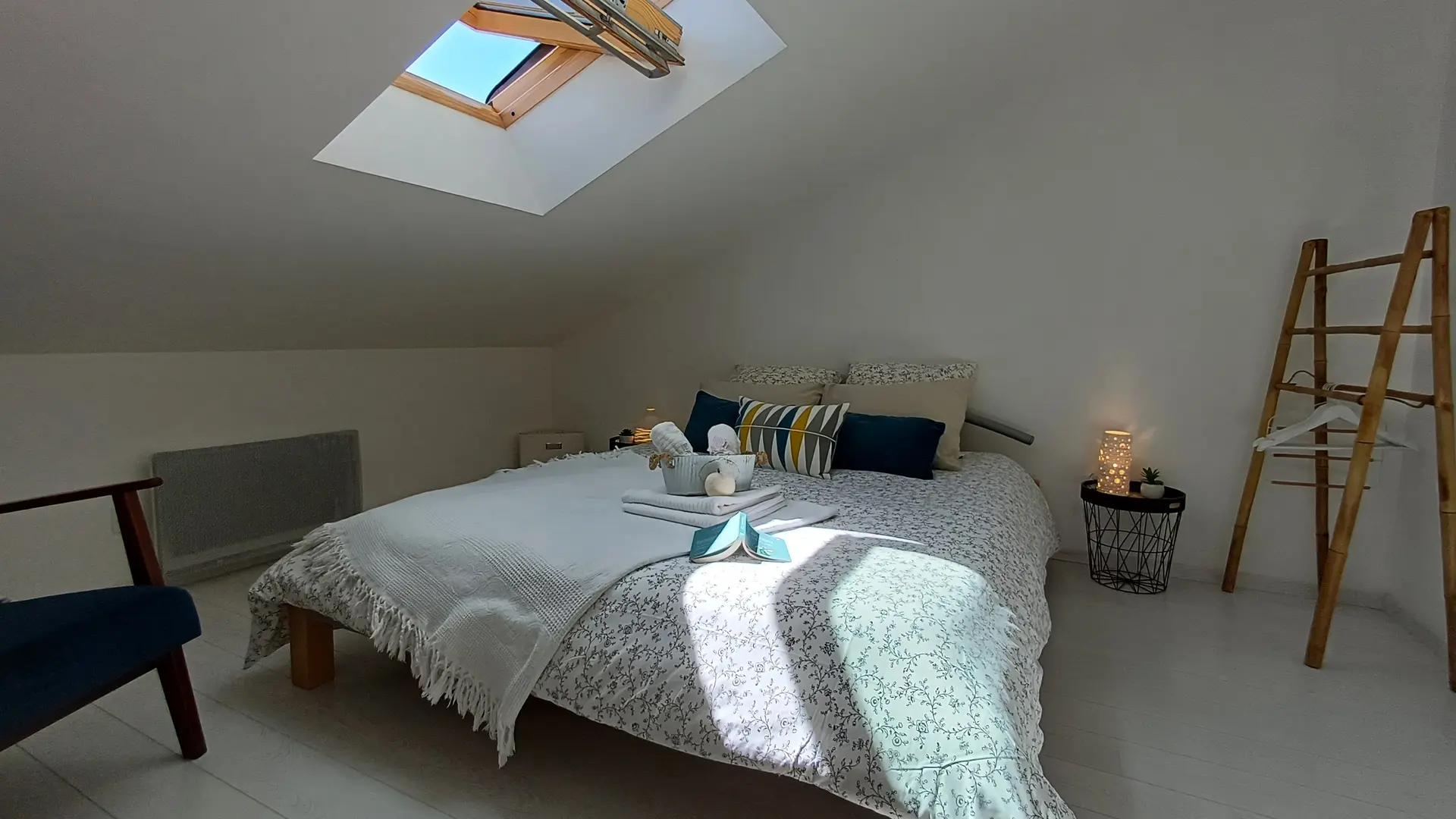 L’escalier en colimaçon dessert les deux chambres mansardées et lumineuses grâce à leurs Vélux. L'une peut s'organiser en lit king size ou deux lits simples selon les besoins, avec une seconde télévision grand écran.