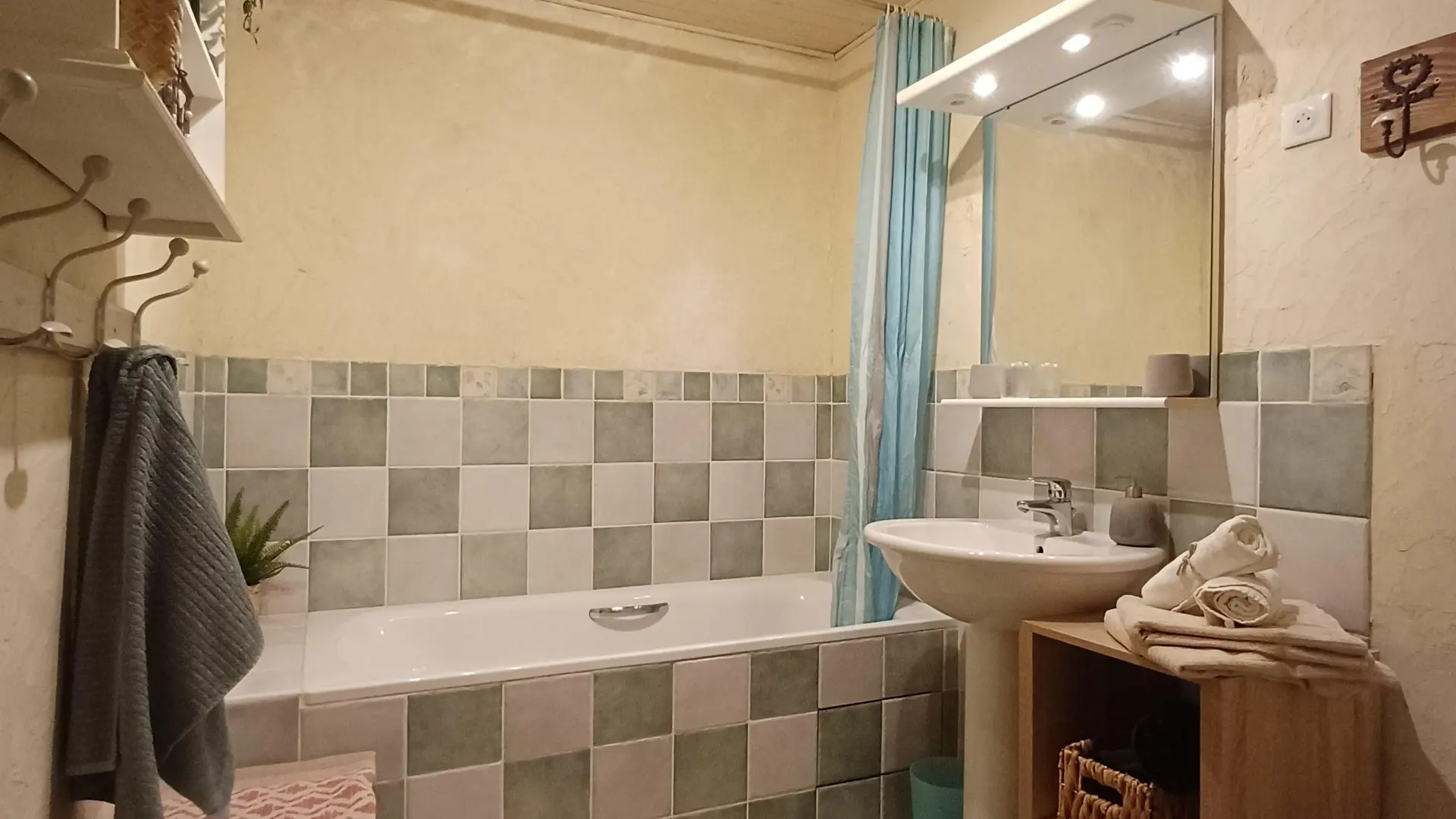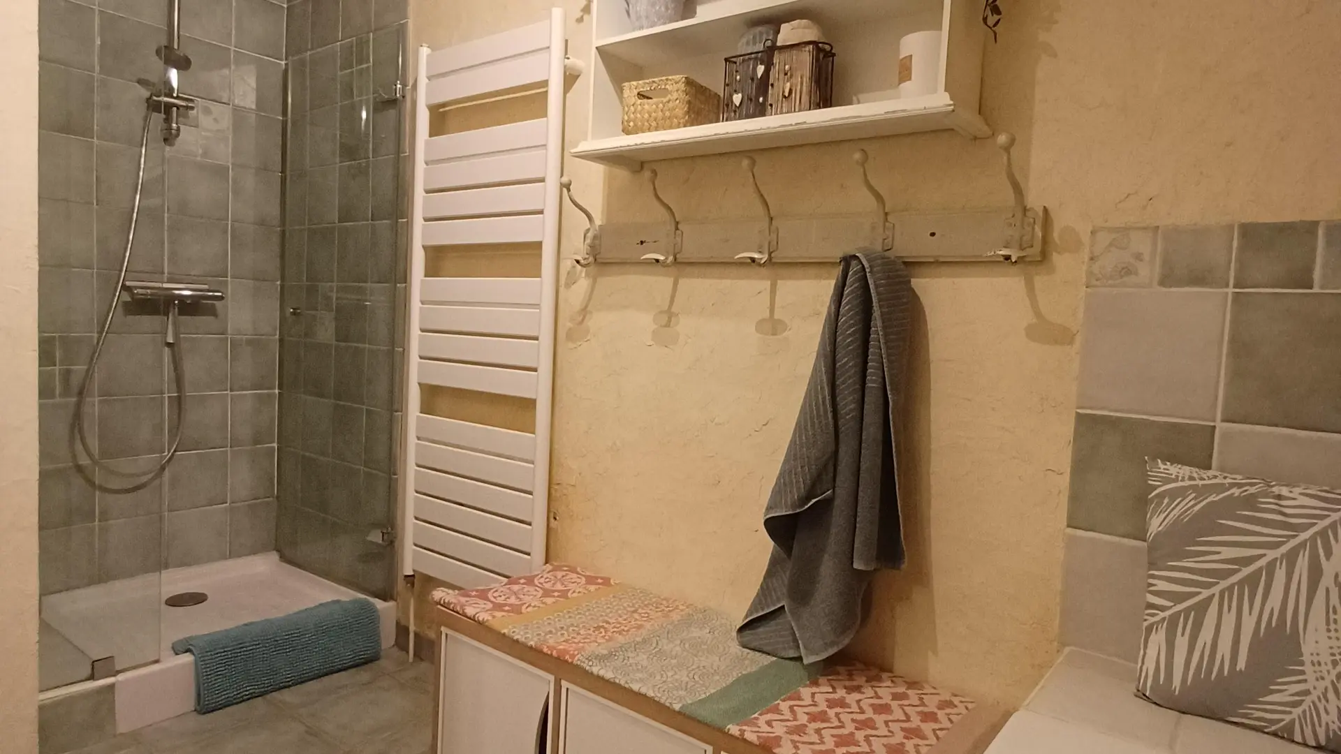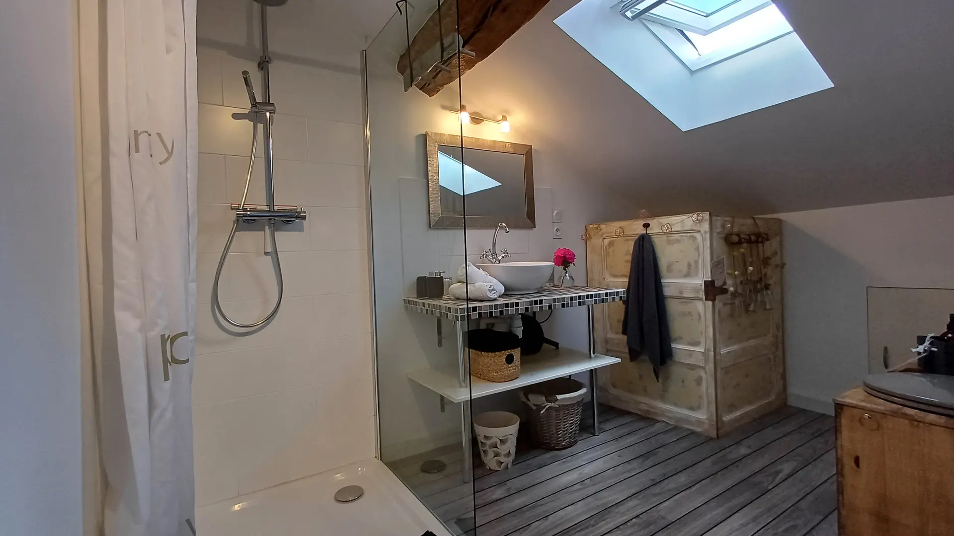 Vous retrouverez une décoration campagnarde dans la salle de douche du dernier niveau qui dispose de toilettes sèches.