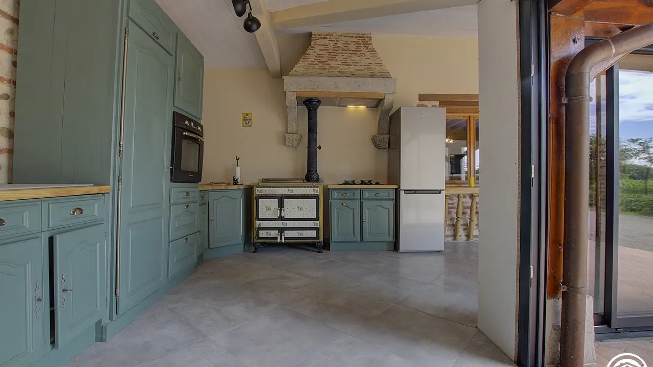 Par une entrée indépendante, un salon de détente avec son canapé convertible pour une personne. A gauche du salon : une cuisine équipée aménagée dans une grande véranda, avec le charme des pierres et du bois et sa cuisinière à bois ancienne, et qui donne directement sur la terrasse privative au gîte. A droite du salon , deux chambres : une chambre avec un couchage en 160*200 et son petit coin bibliothèque et une deuxième chambre composée de deux lits simples en 90*190 ; salle d'eau avec double vasques et un WC indépendant. Chauffage au sol : pompe à chaleur et bois. Ce gîte est situé proche des nombreux étangs de la Dombes, du parc de Villars les Dombes, de la Cité médiévale de Chatillon sur Chalaronne. Le Golf du Clou est situé à 1 km du gîte.