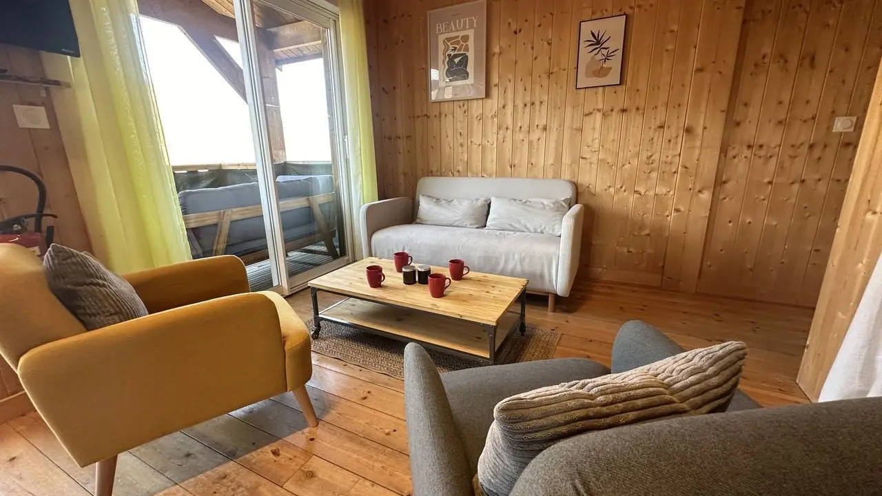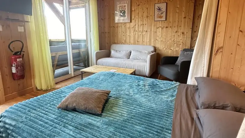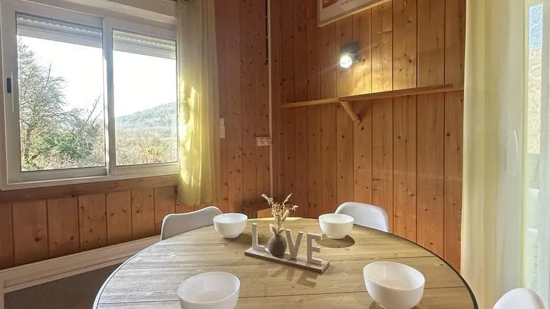 Un chalet, cosy, sur un même niveau, pouvant accueillir jusqu'à 4 personnes, niché dans un cadre naturel exceptionnel avec une vue panoramique sur la rivière d'Ain.