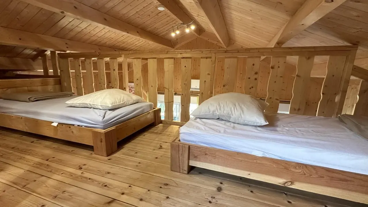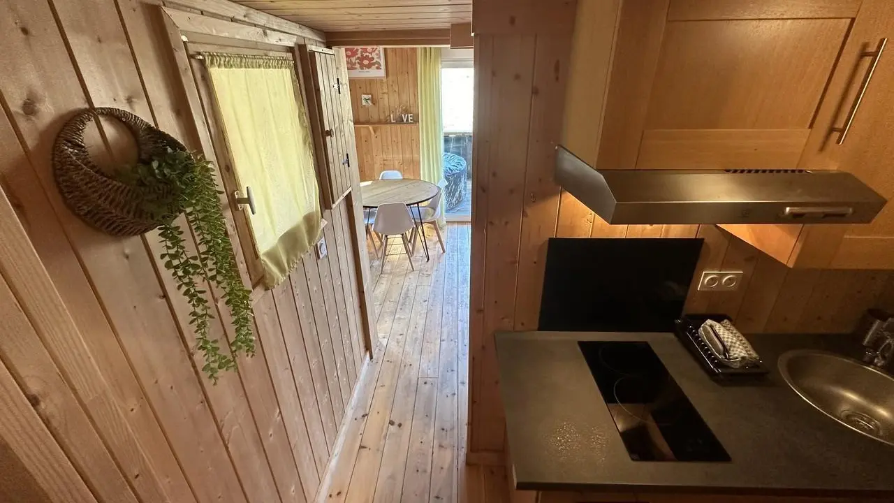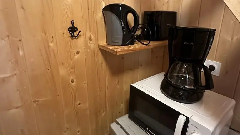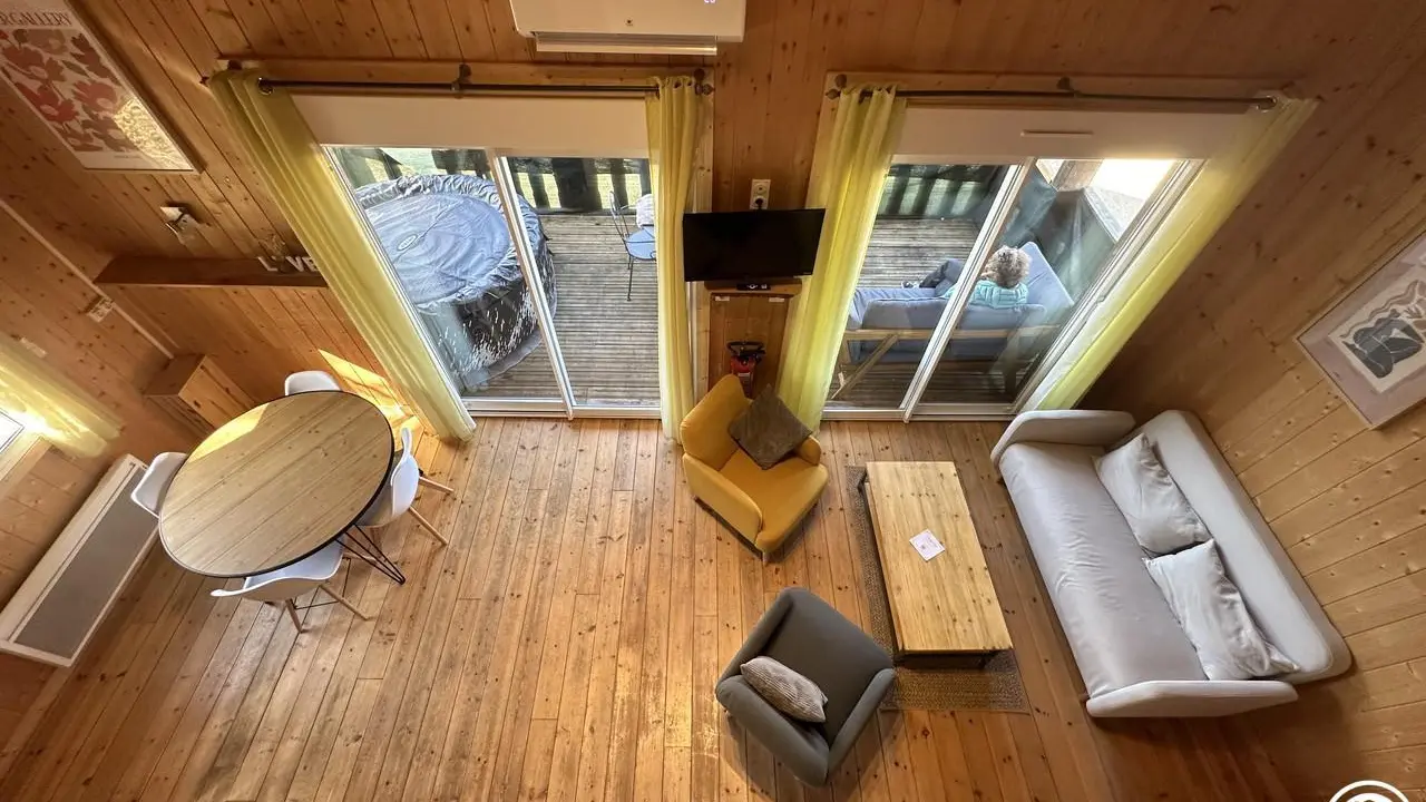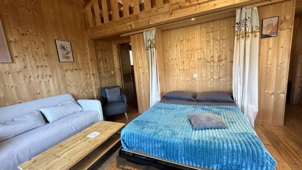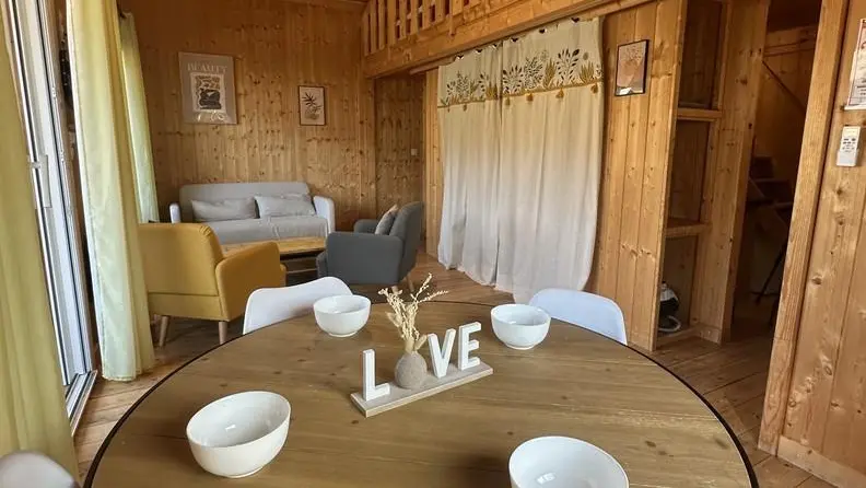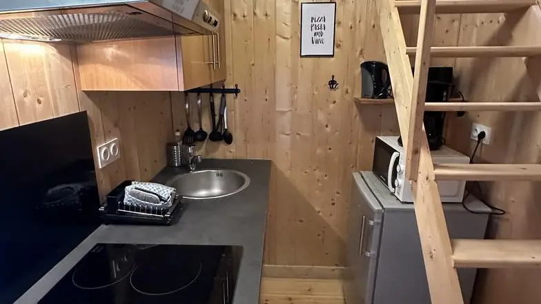 Dès votre arrivée, laissez-vous séduire par l'atmosphère chaleureuse qui s'y dégage La pièce de vie, avec son espace couchage (140*190) , invite à la détente et aux moments de partage. Une mezzanine aménagée complète l'espace nuit et apporte charme et confort à ce lieu pensé pour des séjours ou une étape. Le lodge dispose également d'une salle d'eau avec WC