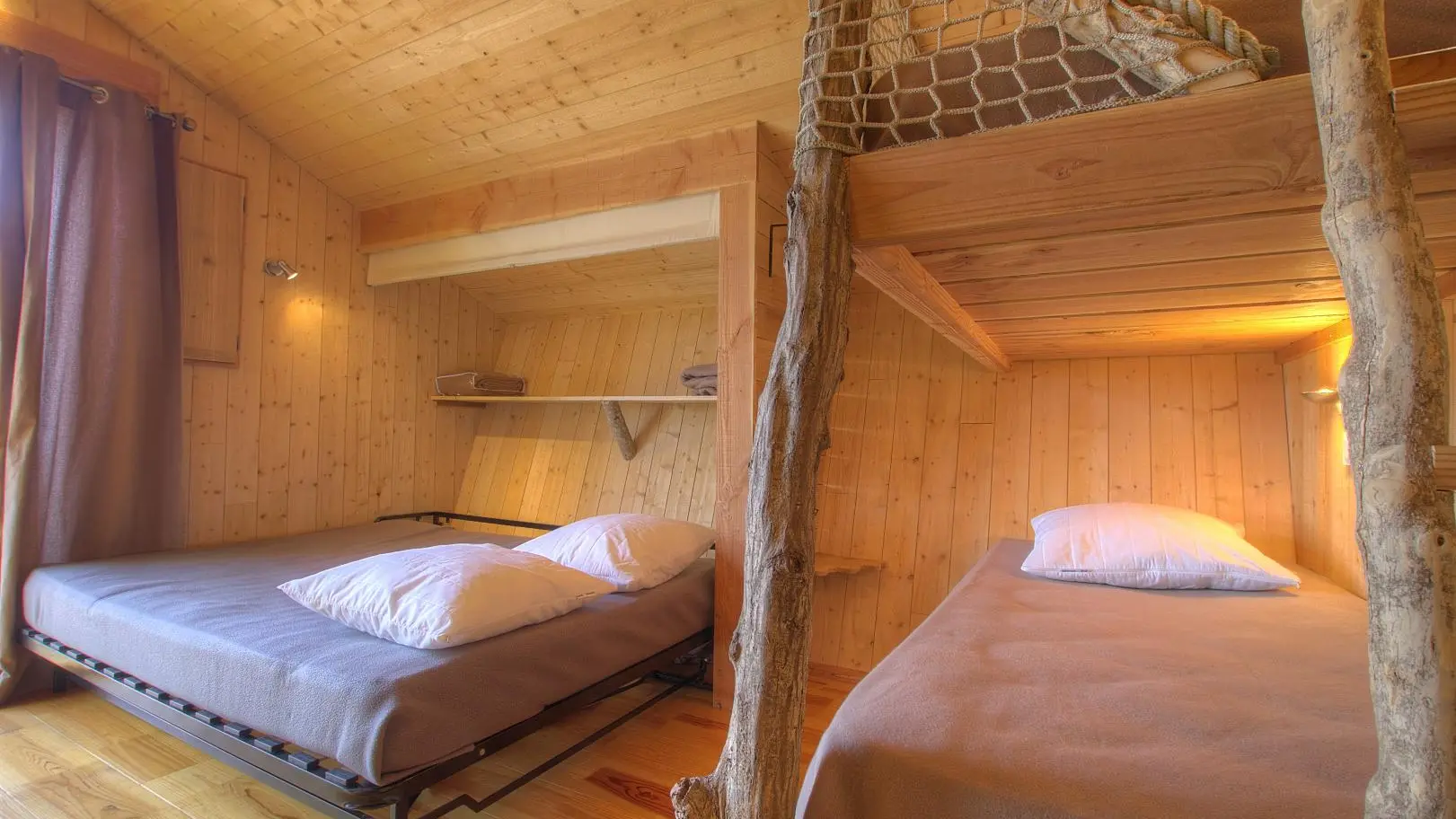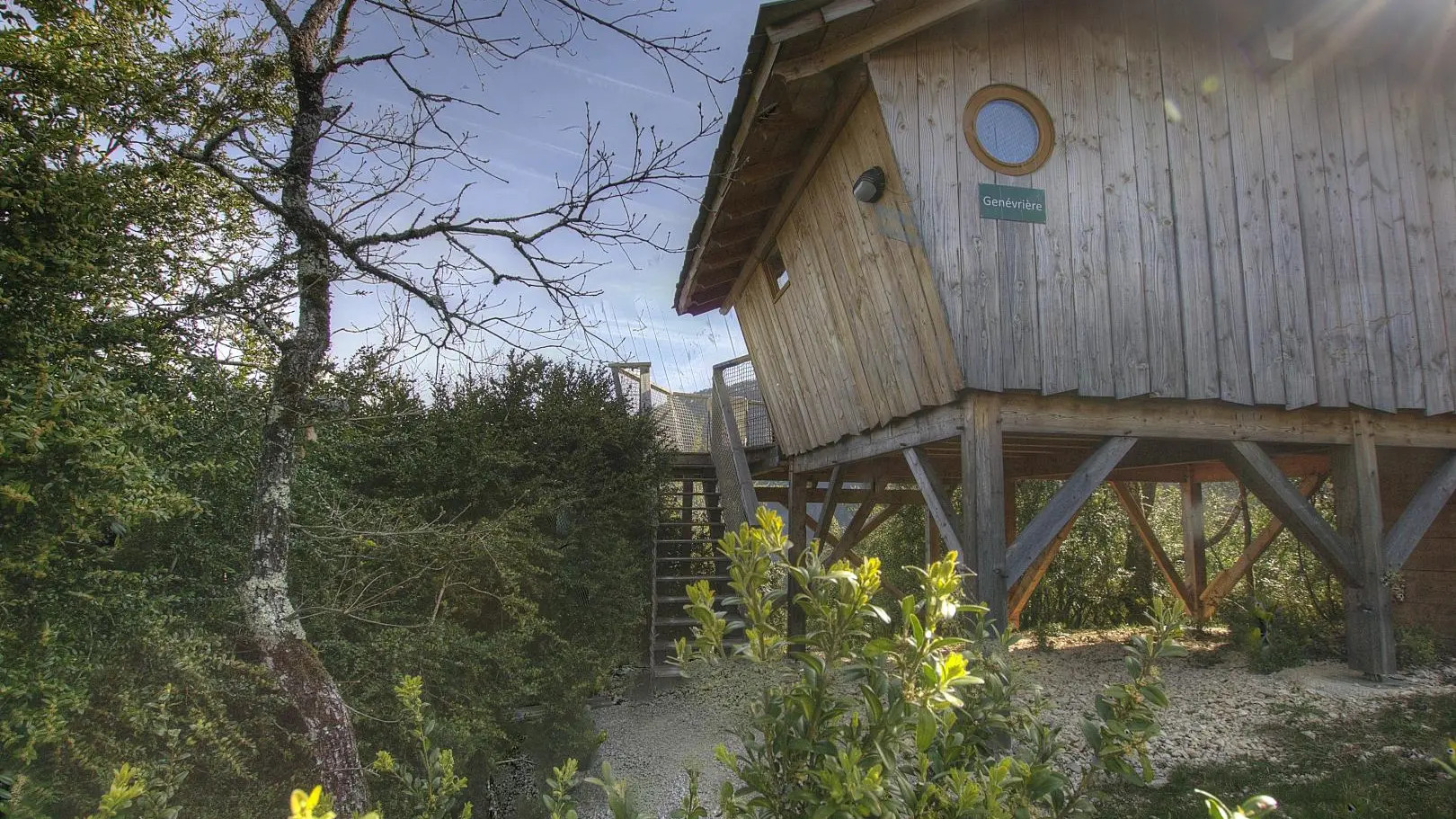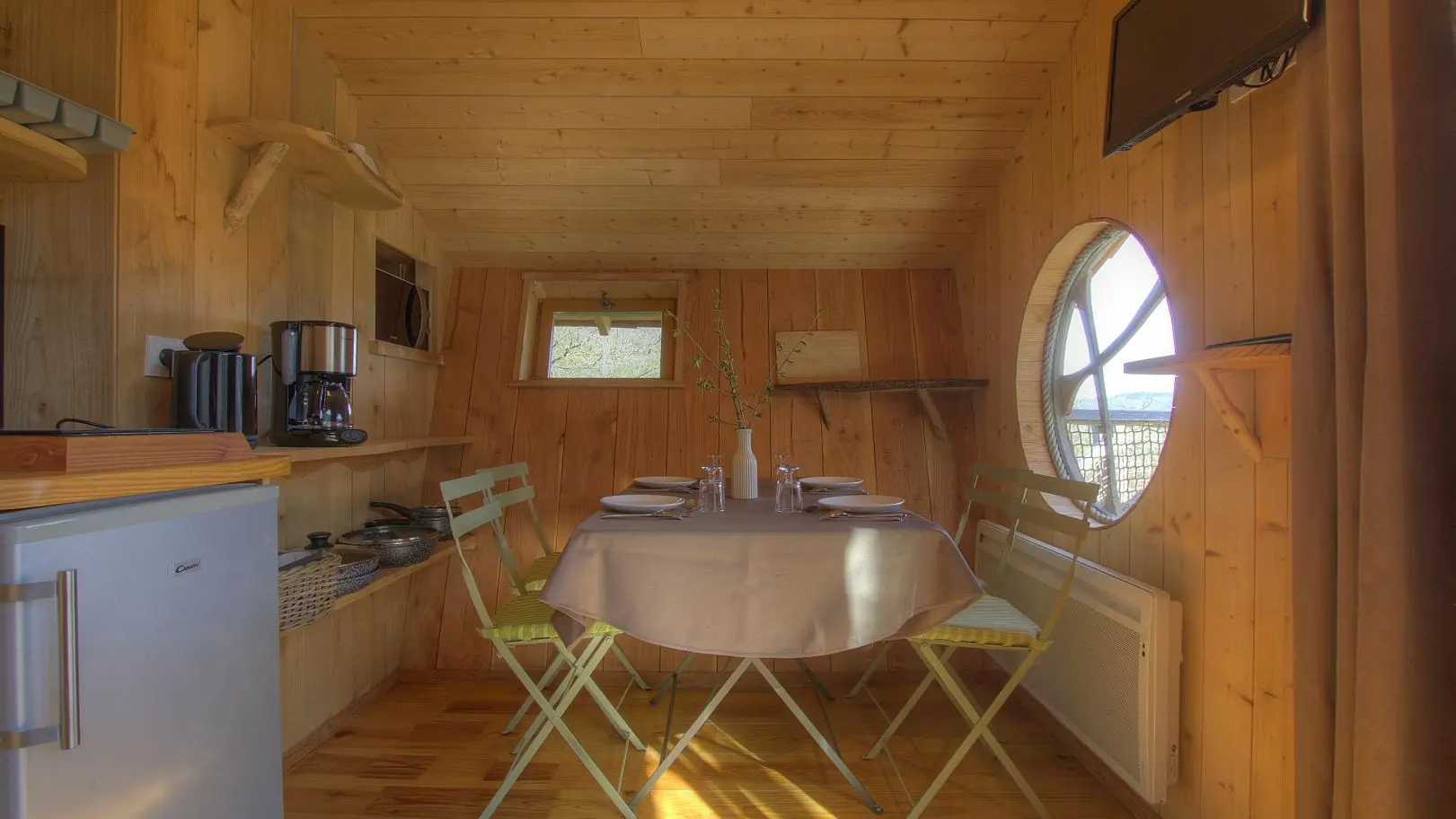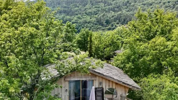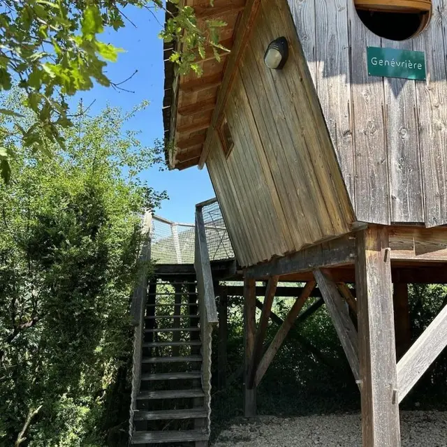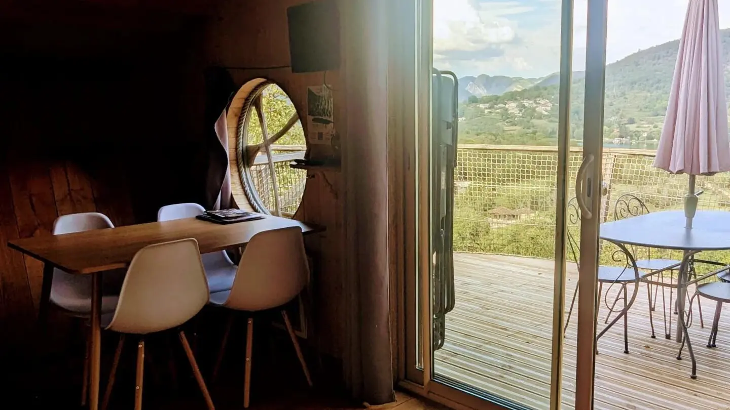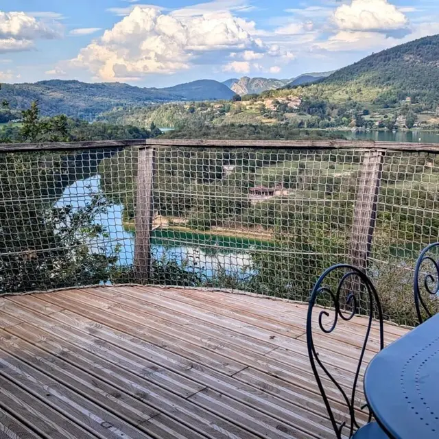 Dès votre arrivée, le décor est planté avec ce grand escalier de bois sécurisé qu'il faudra gravir pour accéder à la terrasse de 15 m², sa superficie est presque aussi grande que la cabane! La terrasse de forme rectangulaire se dresse fièrement dans son écrin de verdure et plonge sur la Rivière d'Ain. La terrasse est exposée soleil levant et baigne dans le soleil jusqu'à 14H00. Séparé par une baie vitré, l'intérieur de la cabane charme avec ses 3 espaces : sur votre droite, en rentrant, un espace repas avec une kitchenette (2 plaques vitro céramique, 1 frigo, 1 micro onde) et sa table "jardin" vert anis. Au fond 1 espace couchage visible avec les lits superposés (90 cm) avec filets de protection, à gauche en entrant 1 espace couchage "invisible" pour 2 personnes qui permet, le lit une fois replié dans l'encadrement prévu de profiter de l'espace. L'accès à la salle d'eau/wc se fait au fond de la pièce de vie principale.A votre arrivée, un kit avec les produits de " base " vous est remis. Nos coups de cœur : la vue d'exception intérieure et exterieure, l'agencement ingénieux de cette cabane, l'ambiance babord/tribord qu'elle dégage avec son hublot géant au-dessus de l'espace repas, les filets qui encadrent la terrasse et les lits superposés, son harmonie reposante de bois. La Genévrière fait partie d'un site " nature " comprenant au total 7 cabanes et lodges complètement intégrées dans cette forêt de buis, nichée sur les hauteurs de Serrières sur Ain, en aplomb de la rivière d'Ain. Chaque cabane à sa propre identité et est construite sur pilotis à 2m du sol, les accès et terrasse sont entièrement sécurisés. Site d'exception, dans les gorges de l'Ain, permettant la pratique du canoë, aviron ou simplement baignade.