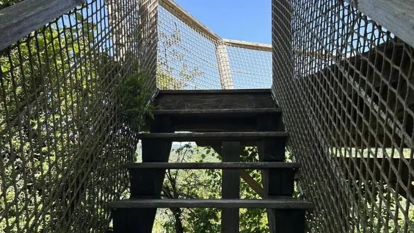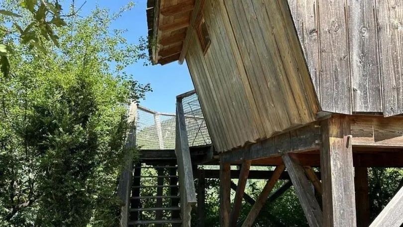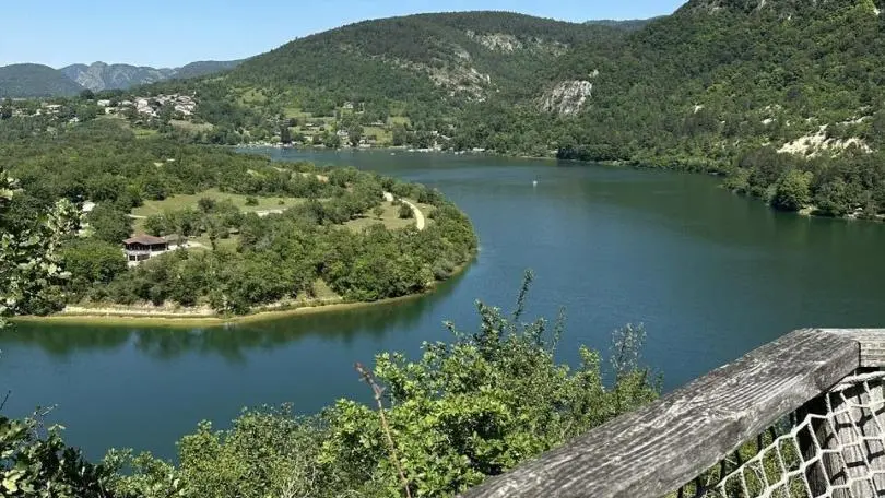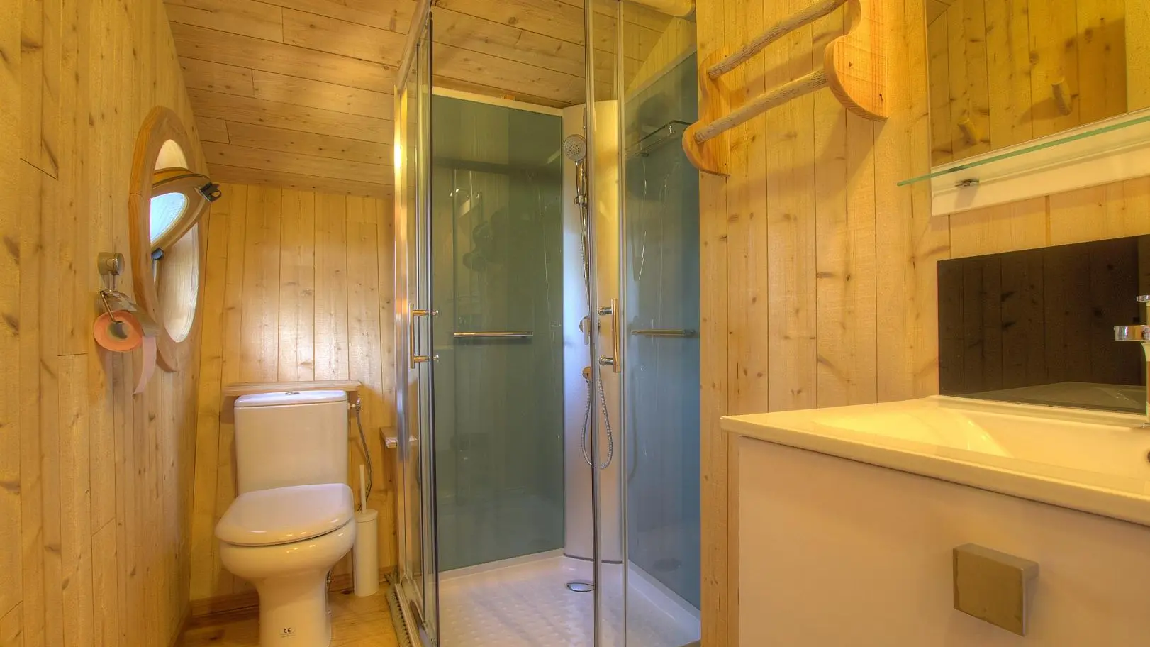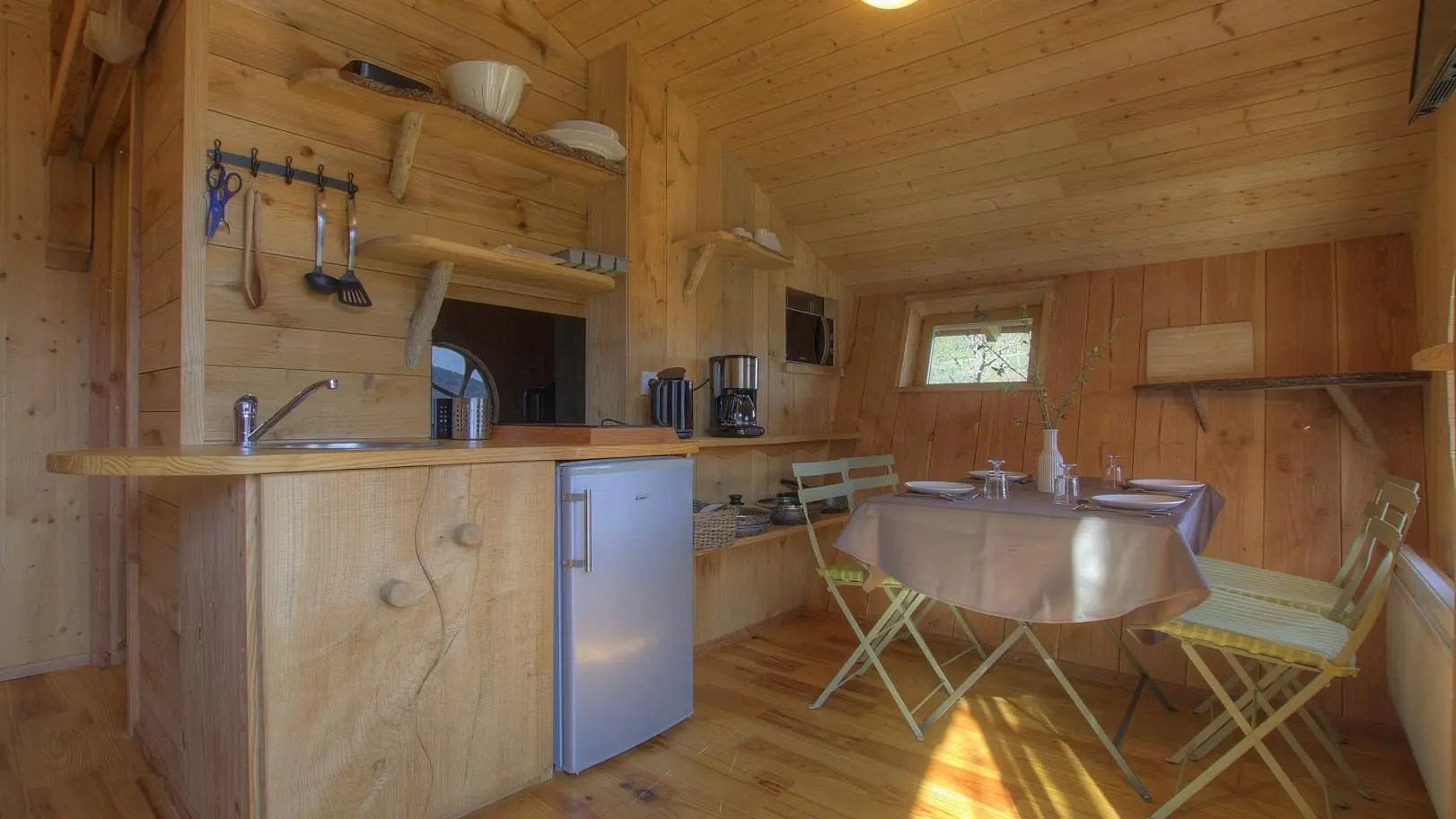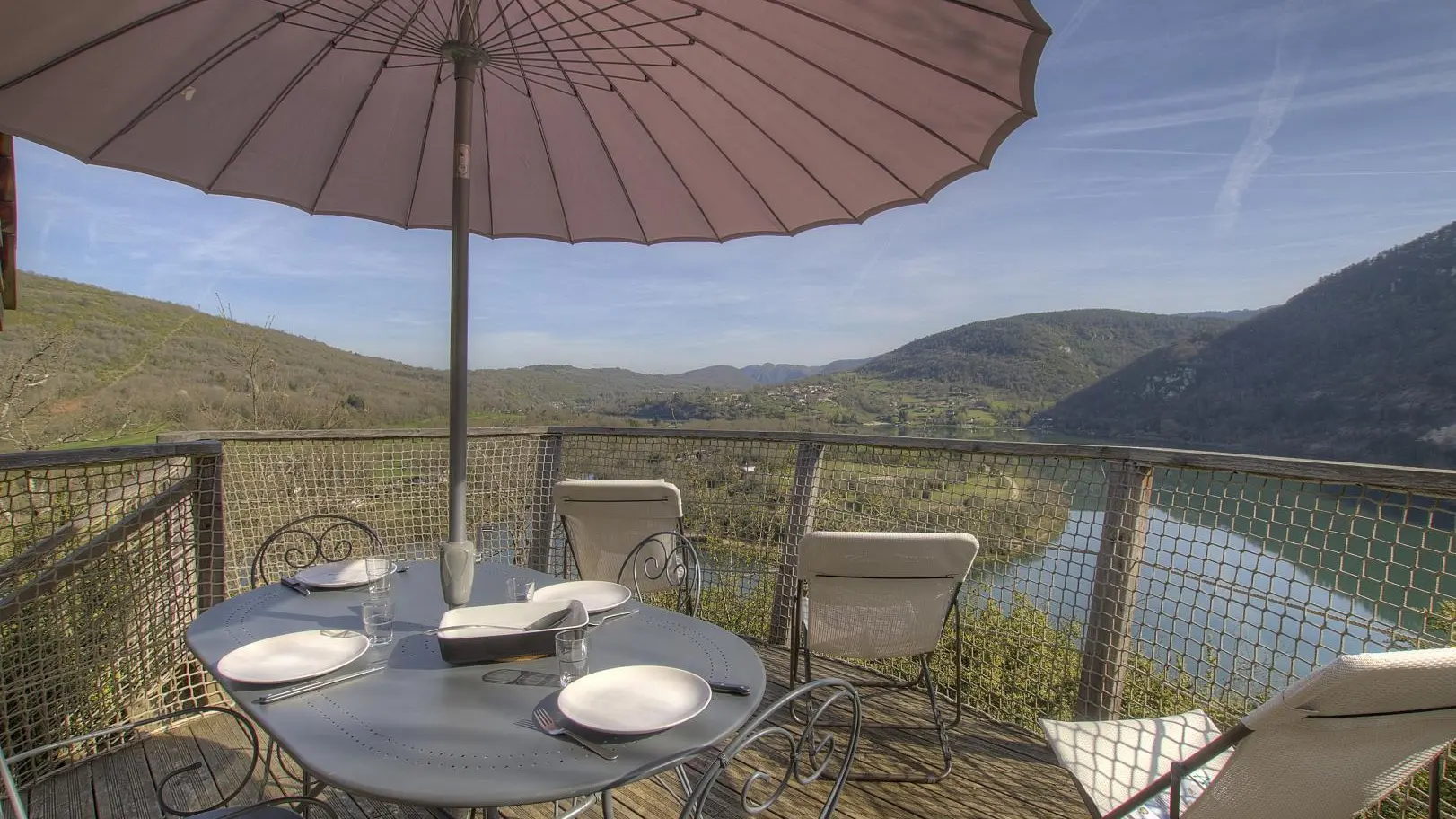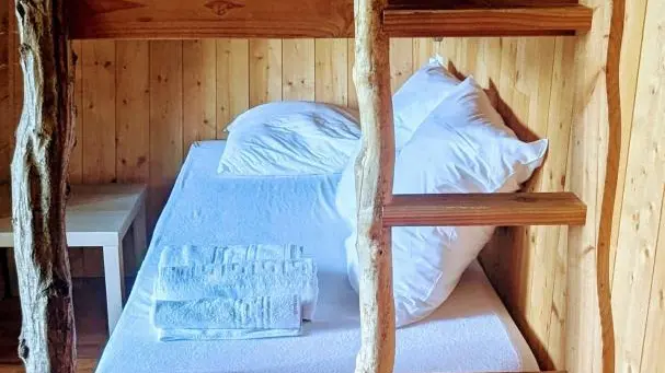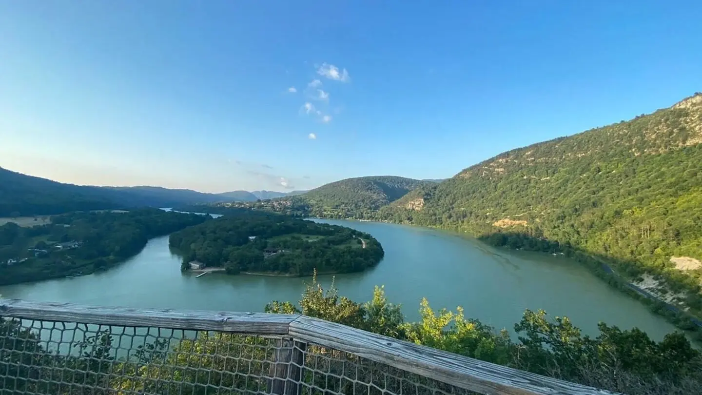 Dès votre arrivée, le décor est planté avec ce grand escalier de bois sécurisé qu'il faudra gravir pour accéder à la terrasse de 15 m², sa superficie est presque aussi grande que la cabane! La terrasse de forme rectangulaire se dresse fièrement dans son écrin de verdure et plonge sur la Rivière d'Ain. La terrasse est exposée soleil levant et baigne dans le soleil jusqu'à 14H00. Séparé par une baie vitré, l'intérieur de la cabane charme avec ses 3 espaces : sur votre droite, en rentrant, un espace repas avec une kitchenette (2 plaques vitro céramique, 1 frigo, 1 micro onde) et sa table "jardin" vert anis. Au fond 1 espace couchage visible avec les lits superposés (90 cm) avec filets de protection, à gauche en entrant 1 espace couchage "invisible" pour 2 personnes qui permet, le lit une fois replié dans l'encadrement prévu de profiter de l'espace. L'accès à la salle d'eau/wc se fait au fond de la pièce de vie principale.A votre arrivée, un kit avec les produits de " base " vous est remis. Nos coups de cœur : la vue d'exception intérieure et exterieure, l'agencement ingénieux de cette cabane, l'ambiance babord/tribord qu'elle dégage avec son hublot géant au-dessus de l'espace repas, les filets qui encadrent la terrasse et les lits superposés, son harmonie reposante de bois. La Genévrière fait partie d'un site " nature " comprenant au total 7 cabanes et lodges complètement intégrées dans cette forêt de buis, nichée sur les hauteurs de Serrières sur Ain, en aplomb de la rivière d'Ain. Chaque cabane à sa propre identité et est construite sur pilotis à 2m du sol, les accès et terrasse sont entièrement sécurisés. Site d'exception, dans les gorges de l'Ain, permettant la pratique du canoë, aviron ou simplement baignade.
