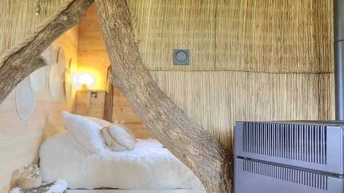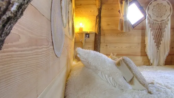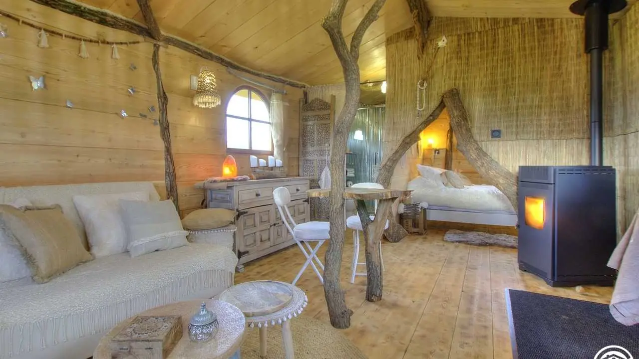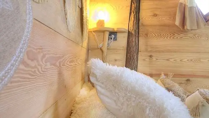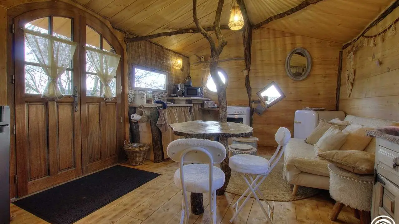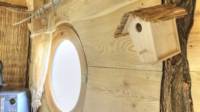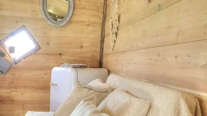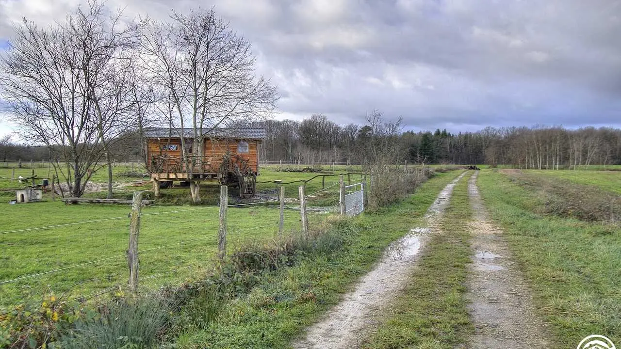 L'atout majeur de la Roucoulotte ? En pleine campagne, parmi les animaux de la ferme mais pas isolée. Présentez vous aux chèvres du coin, leur accueil n'en sera que meilleur. En été, laissez vous bercer par le chant des grenouilles, du paon, ... Pour les amoureux de la farniente, prélassez vous vers le poêle à pellet, lovez vous sur le canapé douillet et profitez du décor. La décoration, totalement conçue par Fanny, ne vous laissera pas de marbre : des troncs d'arbres avec table incrustée, nids d'oiseaux, le tout dans une pièce chaude et conviviale. La chambre est également insolite par son ouverture... Courbez la tête et découvrez cet espace nuit équipé de son lit 140 par 200. Une salle d'eau (avec WC et lavabo) avec grande douche, est dans le prolongement de la pièce principale. Un paravent vous donnera plus d'intimité. Vous souhaitez prolonger le dépaysement ? Il suffit de sortir et de profiter de la terrasse surélevée avec vue sur le petit étang et les champs. L'accès à la roulotte se fait par un escalier atypique, cuisine bien équipée, un espace de vie ouvert sur chambre et sanitaires. Chauffage bois (poêle à granulés). Pour votre confort, les draps, linges de toilette et de maison sont fournis. Lave linge commun et sur demande. Plan d'eau non sécurisé. Départ sentiers pédestres au pied de la roulotte. Parking à 100 m et possibilité de décharger vos bagages en amont. Pas de TV, ni Wifi mais l'assurance d'une déconnexion totale. Climatisation.