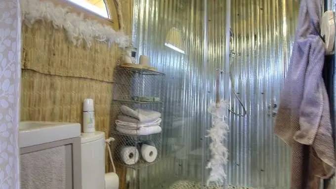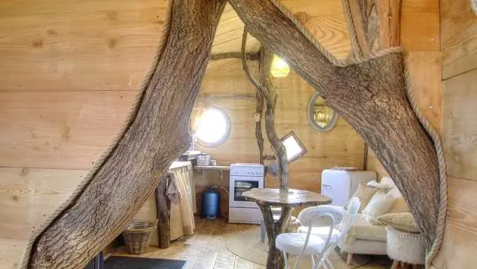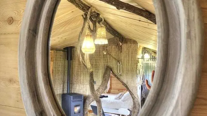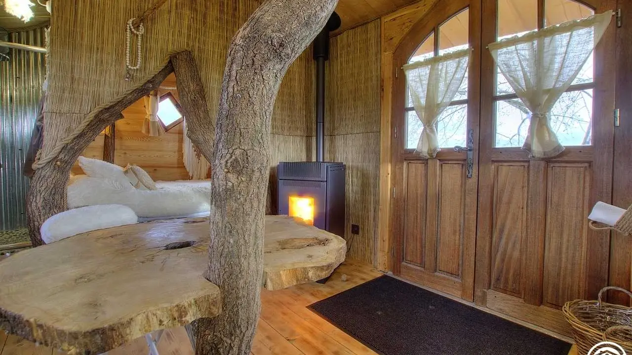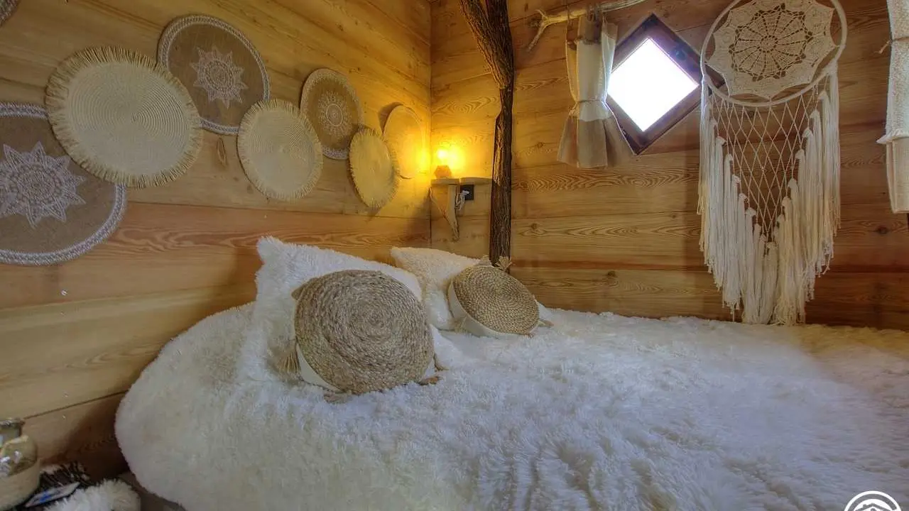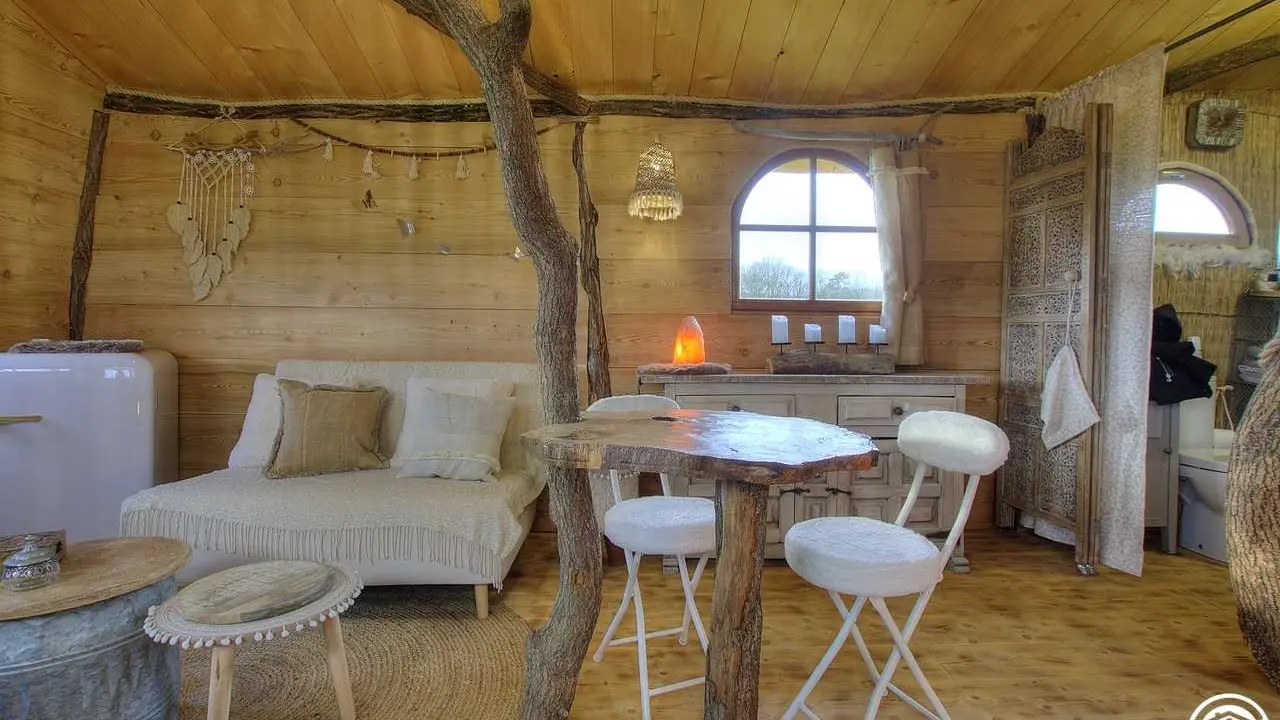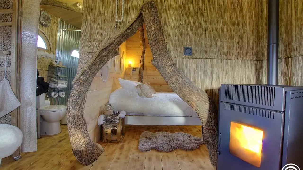 L'atout majeur de la Roucoulotte ? En pleine campagne, parmi les animaux de la ferme mais pas isolée. Présentez vous aux chèvres du coin, leur accueil n'en sera que meilleur. En été, laissez vous bercer par le chant des grenouilles, du paon, ... Pour les amoureux de la farniente, prélassez vous vers le poêle à pellet, lovez vous sur le canapé douillet et profitez du décor. La décoration, totalement conçue par Fanny, ne vous laissera pas de marbre : des troncs d'arbres avec table incrustée, nids d'oiseaux, le tout dans une pièce chaude et conviviale. La chambre est également insolite par son ouverture... Courbez la tête et découvrez cet espace nuit équipé de son lit 140 par 200. Une salle d'eau (avec WC et lavabo) avec grande douche, est dans le prolongement de la pièce principale. Un paravent vous donnera plus d'intimité. Vous souhaitez prolonger le dépaysement ? Il suffit de sortir et de profiter de la terrasse surélevée avec vue sur le petit étang et les champs. L'accès à la roulotte se fait par un escalier atypique, cuisine bien équipée, un espace de vie ouvert sur chambre et sanitaires. Chauffage bois (poêle à granulés). Pour votre confort, les draps, linges de toilette et de maison sont fournis. Lave linge commun et sur demande. Plan d'eau non sécurisé. Départ sentiers pédestres au pied de la roulotte. Parking à 100 m et possibilité de décharger vos bagages en amont. Pas de TV, ni Wifi mais l'assurance d'une déconnexion totale. Climatisation.
