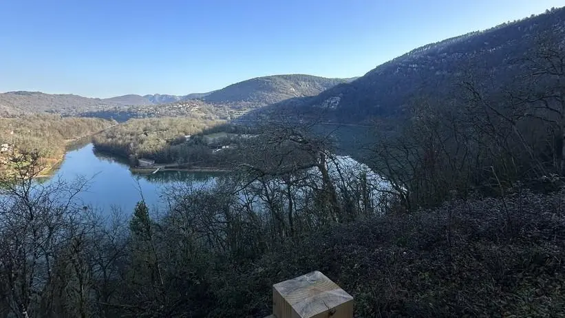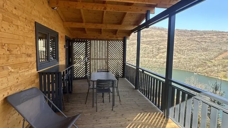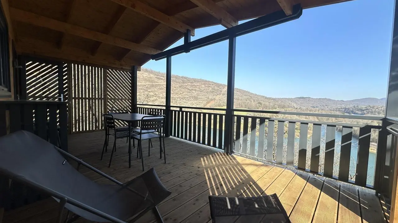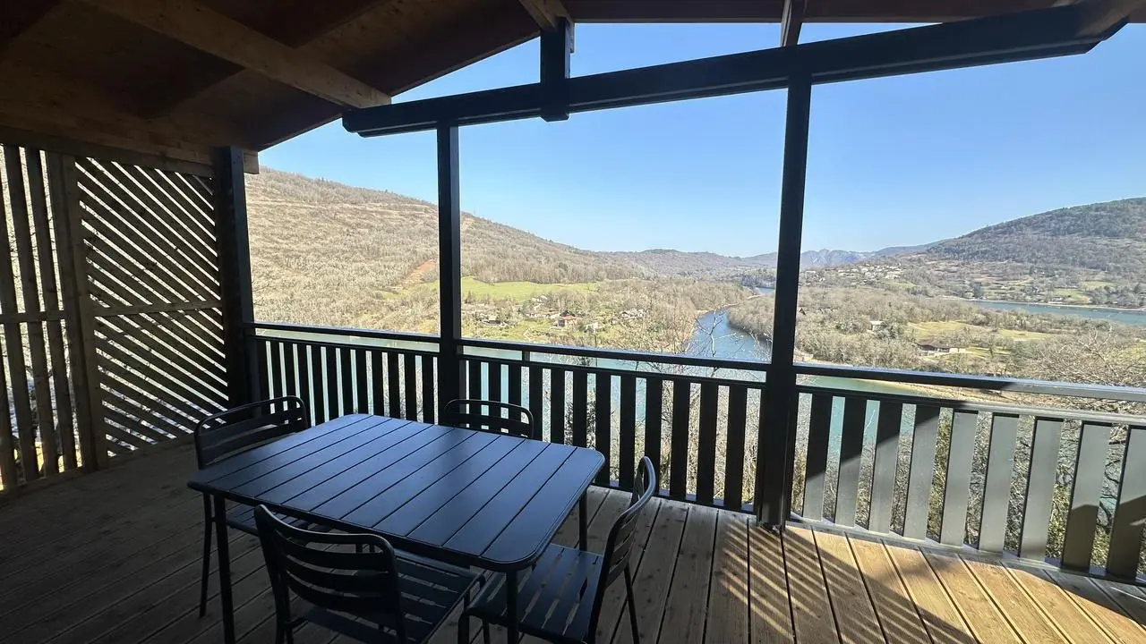Mais le véritable charme du lieu s'opère une fois que vous accédez à votre lodge. Une superbe terrasse panoramique de 20 m² s'ouvre devant vous, comme un balcon sur la nature. Le temps s'arrête. A vous de profitez de ce cadre naturel lors d'un petit déjeuner ou d'un repas au grand air. Laissez vous envahir par des paysages apaisants et la rivière d'Ain qui serpente en contrebas.