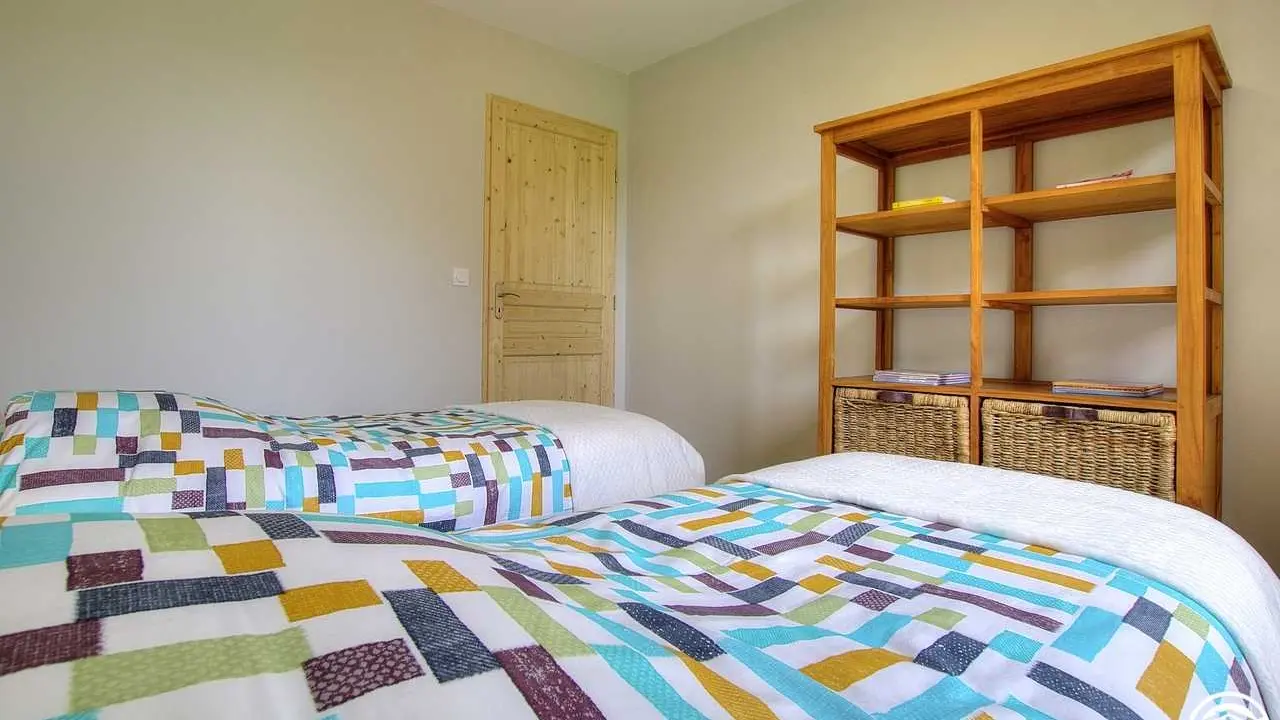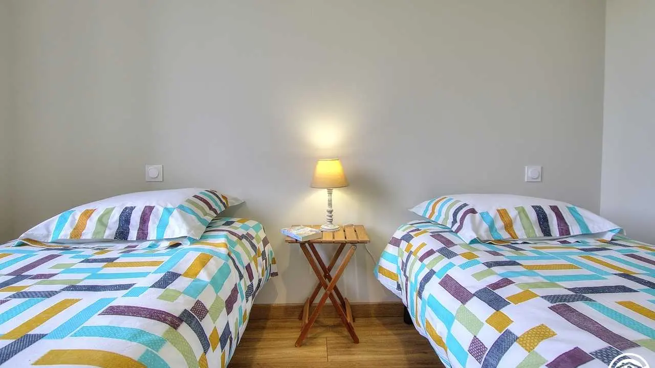 L'entrée avec ses 4 marches se fait sur une grande pièce de vie. WC indépendant. Au niveau supérieur, deux chambres avec chacune deux lits simples 80*200 qui se réunissent ou pas.