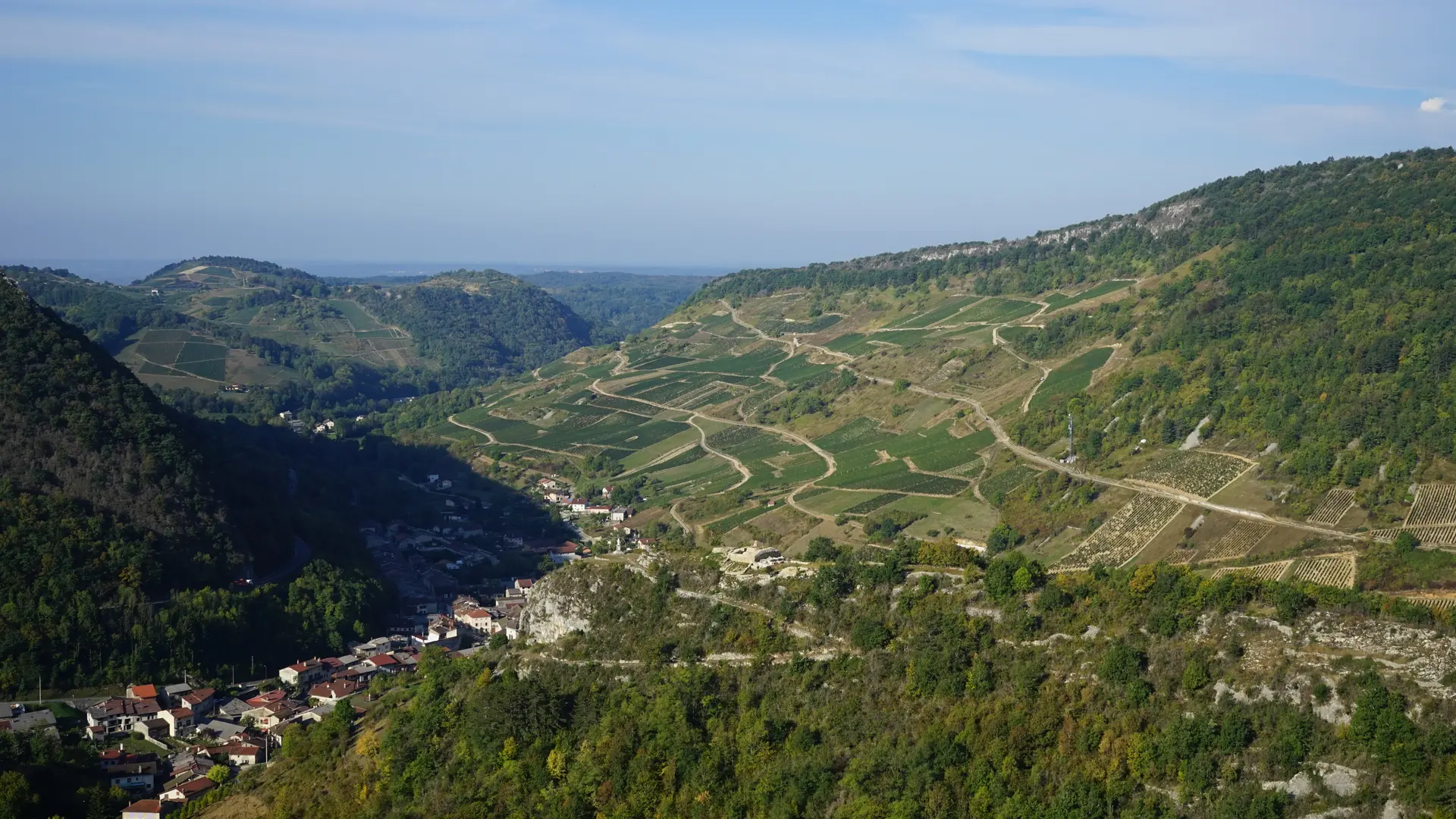 Une splendide vue panoramique sur le village de Cerdon et son vignoble, à découvrir en salle ou en terrasse.