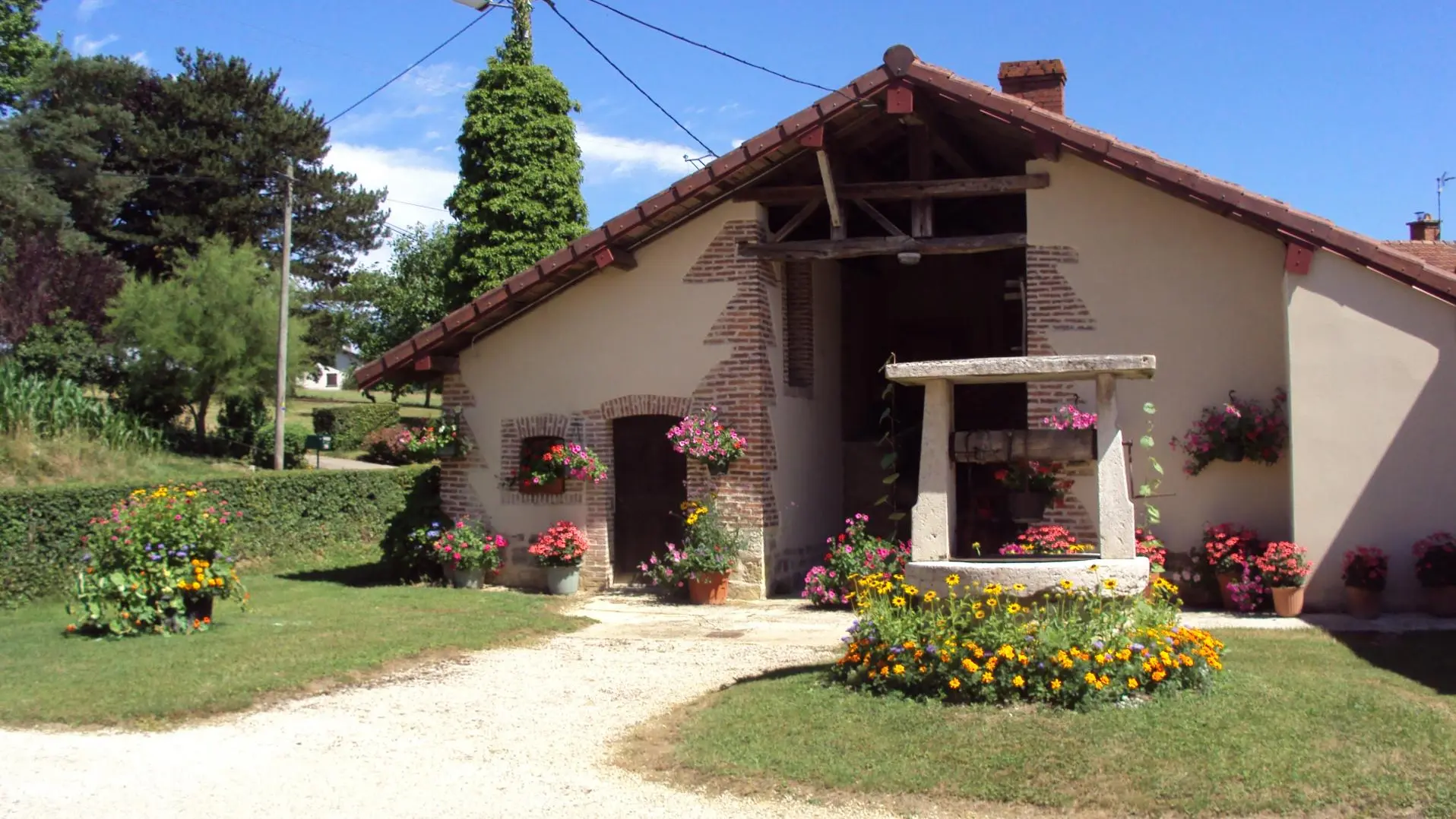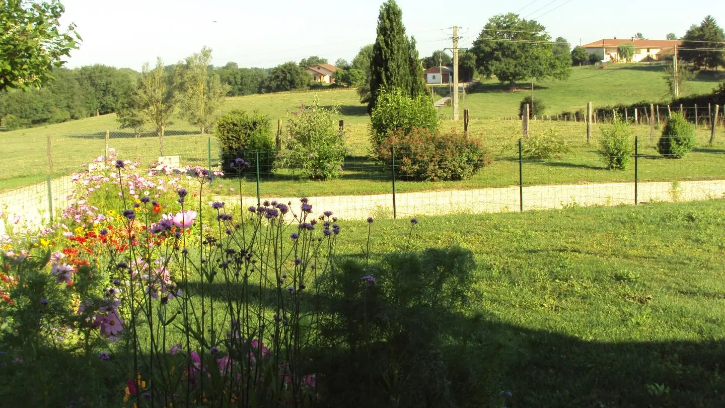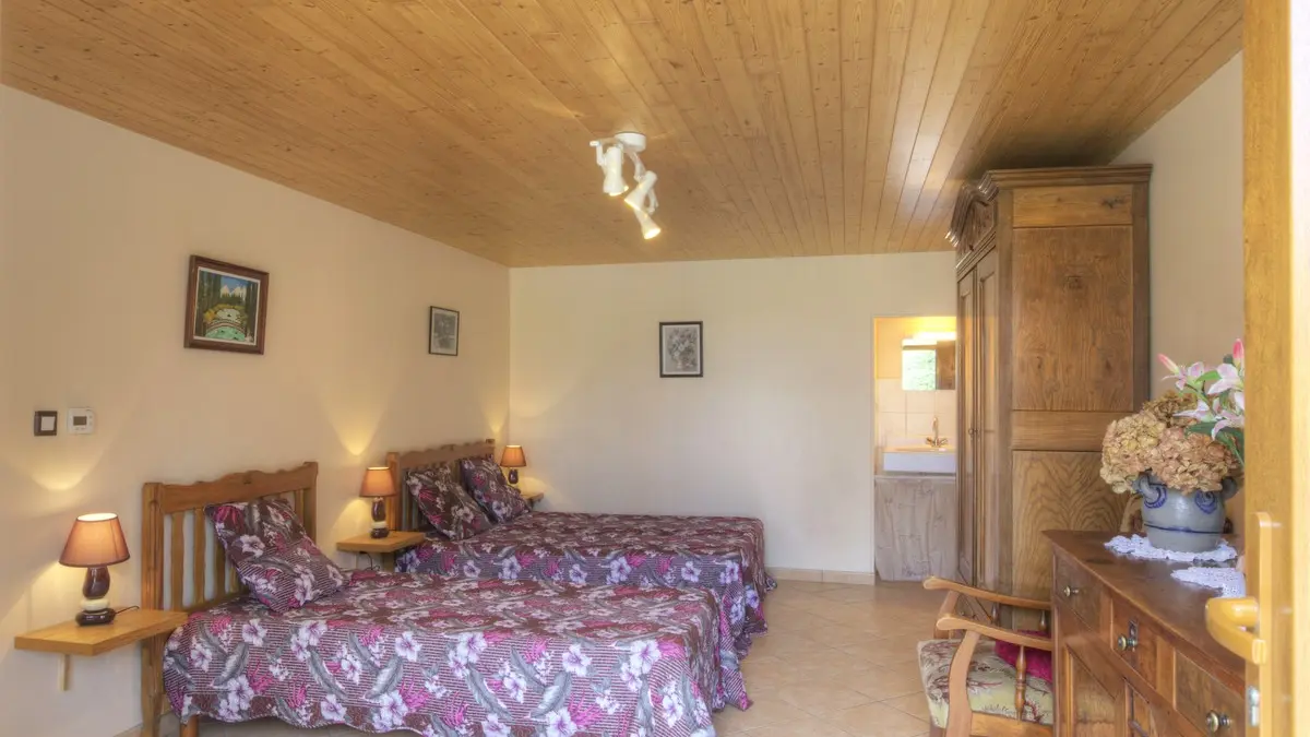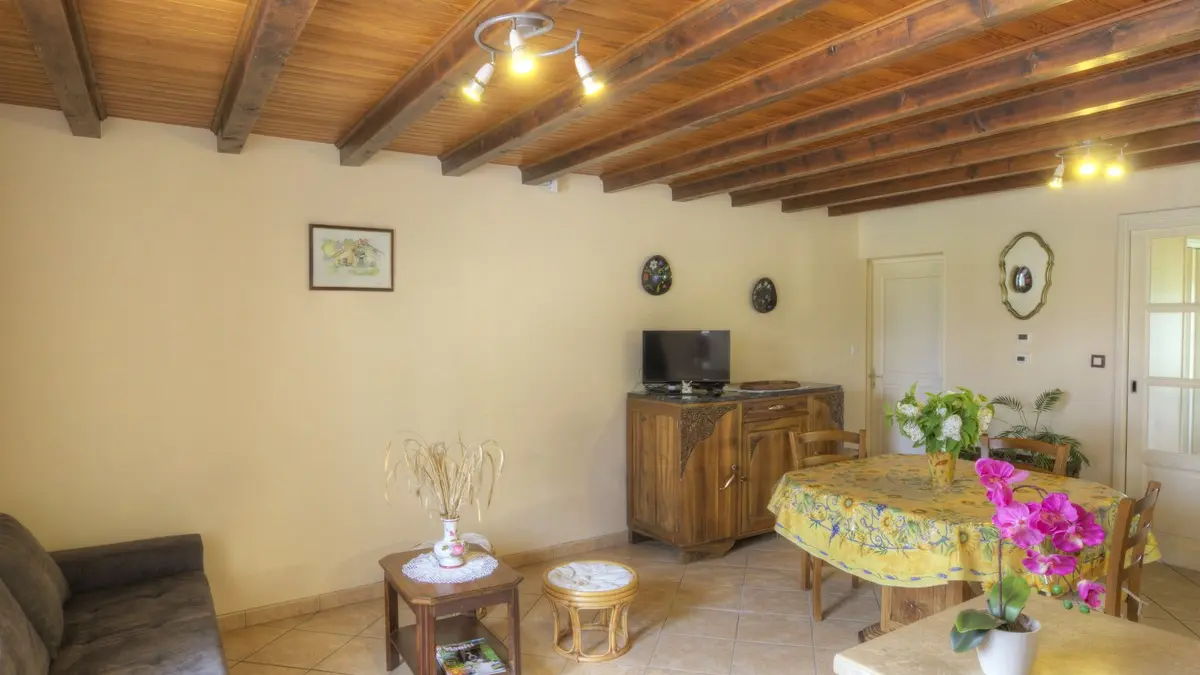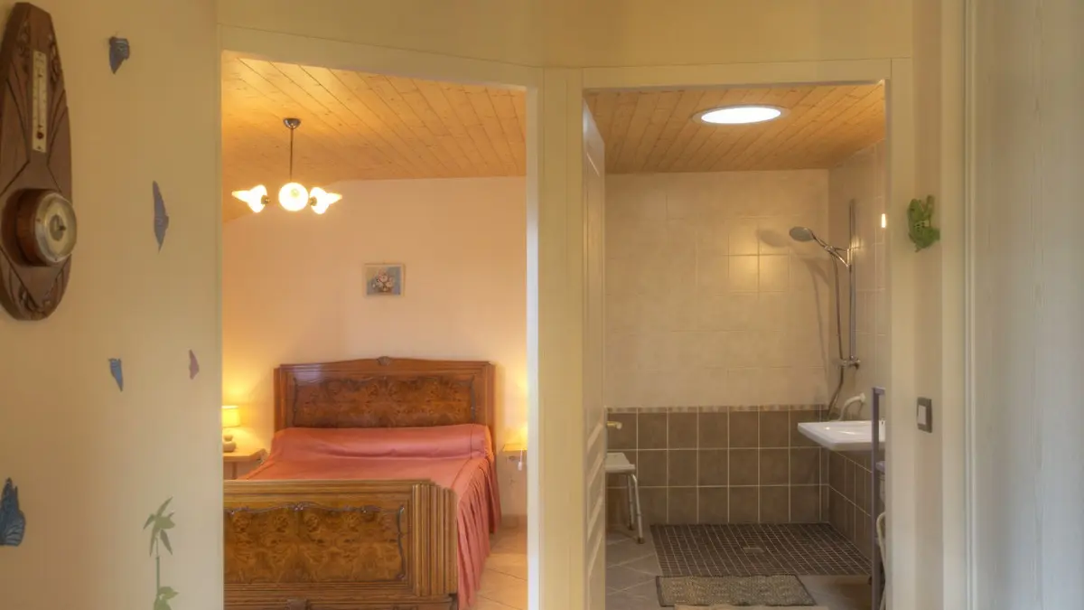 Dans un paysage de bocage bressan, gîte ind. de plain pied (82 m²) dans une ferme rénovée, mitoyen avec un autre gîte. Séjour/coin cuisine avec espace détente, 1 ch. accès pers. handi. (1 lit 2 pers., 1 lit 1 pers.) avec lavabo.un WC indépendant. 1 ch ...