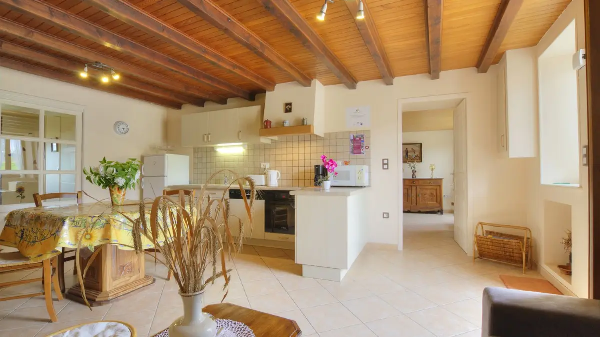 Gîte spacieux (84 m²) de plain pied, situé dans une ferme rénovée et mitoyen à un autre gîte de 6 personnes , en plein dans un paysage de bocage bressan. Au rez-de-chaussé la cuisine ouverte sur le séjour avec son coin salon. Une première chambre adaptée aux personnes à mobilité réduite avec 1 lit 2 personnes et 1 lit 1 personne avec lavabo. Un WC indépendant. Une deuxième chambre avec1 lit 2 personnes et une troisième "petite" chambre avec 1 lit 1 personne. Une salle d'eau à l'italienne avec WC intégré. Chauffage en supplément. Forfait ménage possible à la demande. Terrasse privative et salon de jardin, terrain clos, et jeux d'enfants. Abris pour voiture. Situé non loin du village, avec commerces. Nous vous invitons à découvrir les fermes musées la Ferme des Mangettes et la Ferme de la Claison au village. Un parc accrobranches à 1,5 km et la Base de Loisirs La grange du Pin à 6 km. Le Monastère Royal de Brou à 12 km et la découverte du Revermont vous attendent.